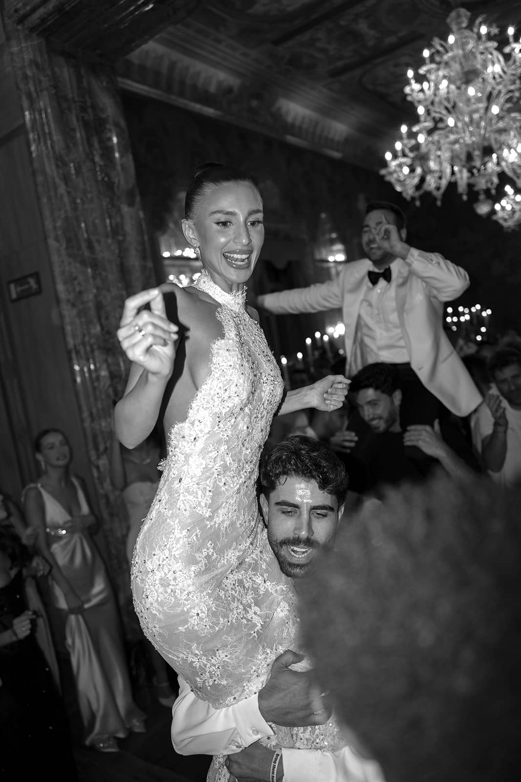 Yes, I wore three dresses by Lee, the only Israeli designer who perfectly matched the high standards I had for a Lake Como wedding. Each dress was made for a specific moment: the first, princess like, for my entrance at the chuppah; the second, custom designed with sparkling details and a slightly daring touch, for the dinner and performance; and the third, a fun and playful mini, for the after party. The haute couture craftsmanship, attention to detail, and perfect tailoring made every dress feel flawless, exactly what I had imagined for each moment of the day.
