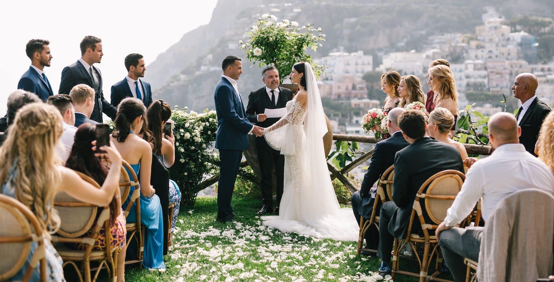 Caryn and Ravid’s spectacular wedding on the Amalfi Coast took place at the historic Villa San Giacomo, a stunning private luxury villa in Positano with magnificent views of the coast. The couple said “I do” in a ceremony overlooking the sea which featured a backdrop of cliffs and pastel-colored villages on the highest point of Positano.