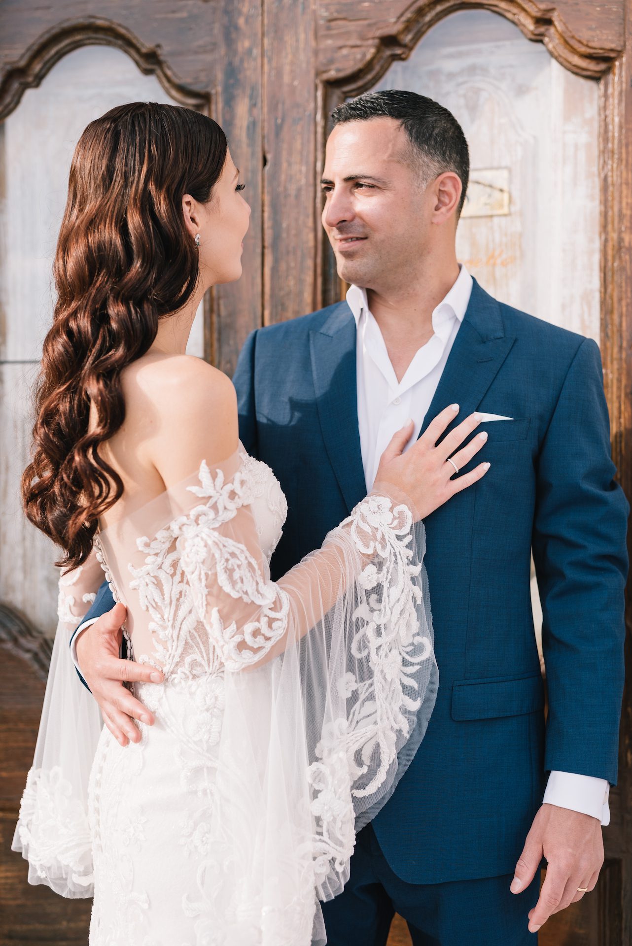 Caryn wore the Ellie, our silk tulle and embroidered lace mermaid wedding dress, which she found at our NYC Flagship boutique. For Caryn, the gown’s unique sleeves were the perfect detail for a destination wedding in Italy. Scroll down to read the couple’s wedding story and to view their gorgeous wedding album, photographed by Gianni di Natale Photographers.