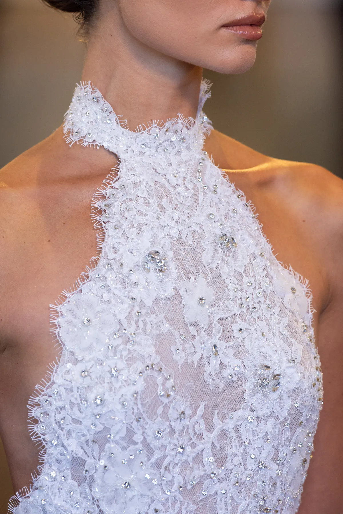 A halterneck gown fashioned from full embroidered lace with embellished florets at the hem for a whimsical touch.