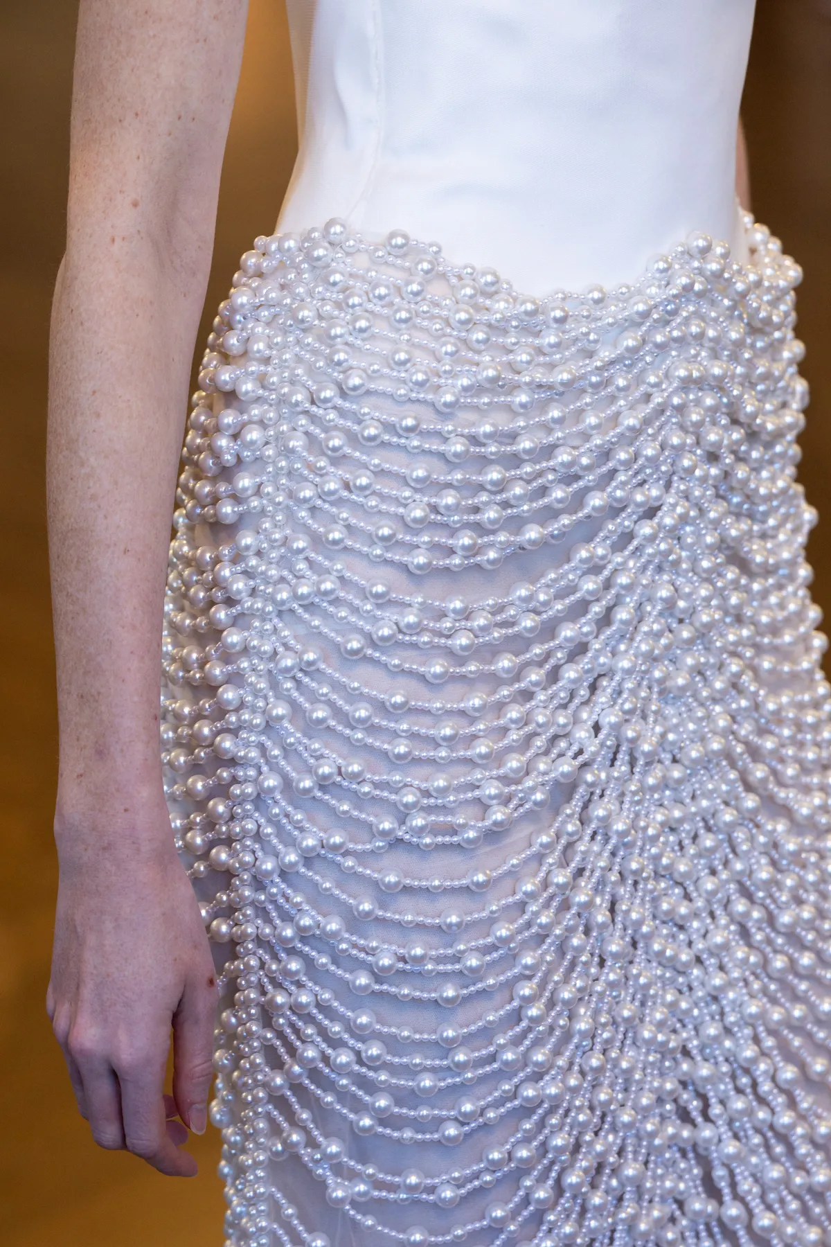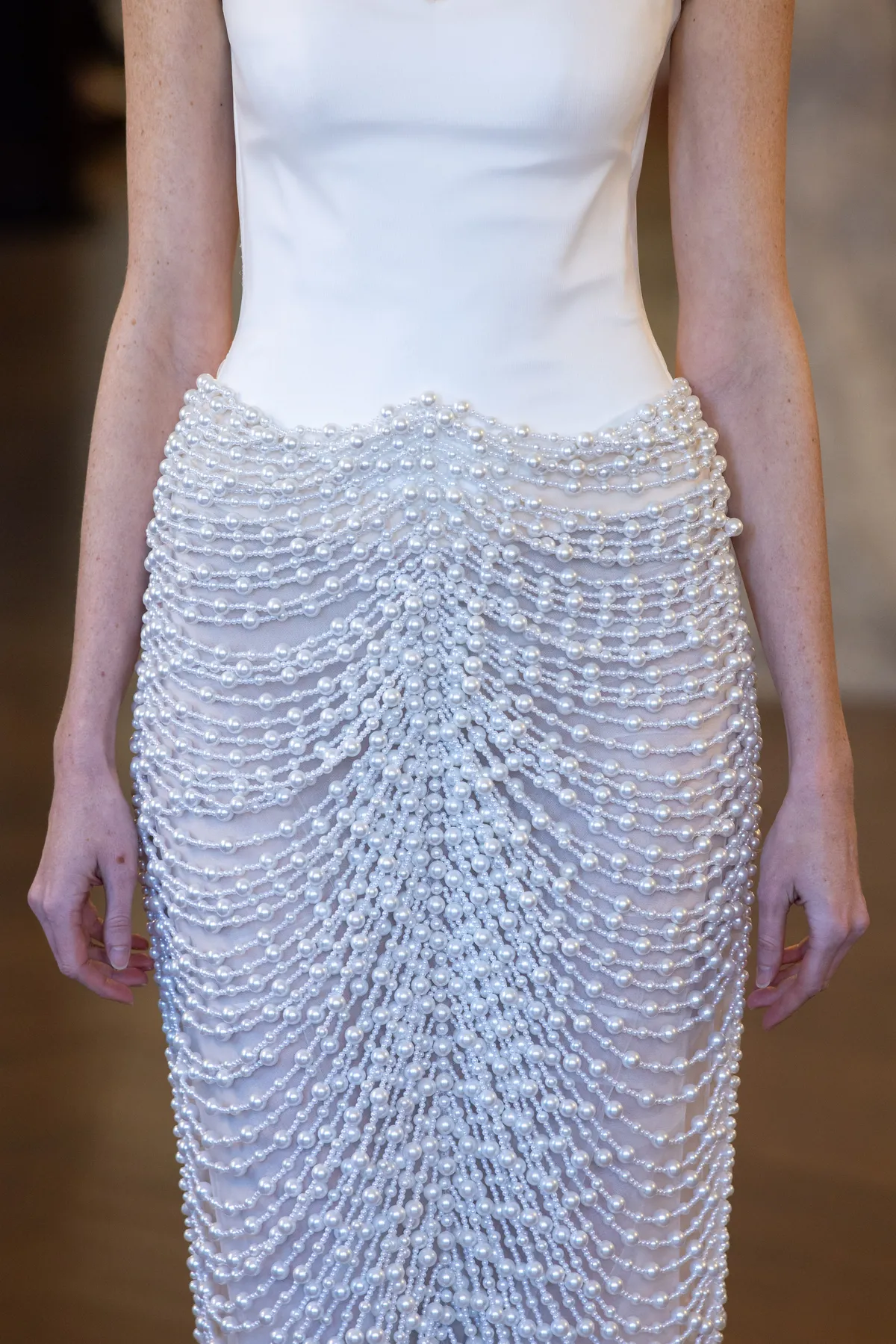 A fitted upper bodice crafted from Mikado silk and fully hand-sewn pearl skirt with cascading draped embellishments.