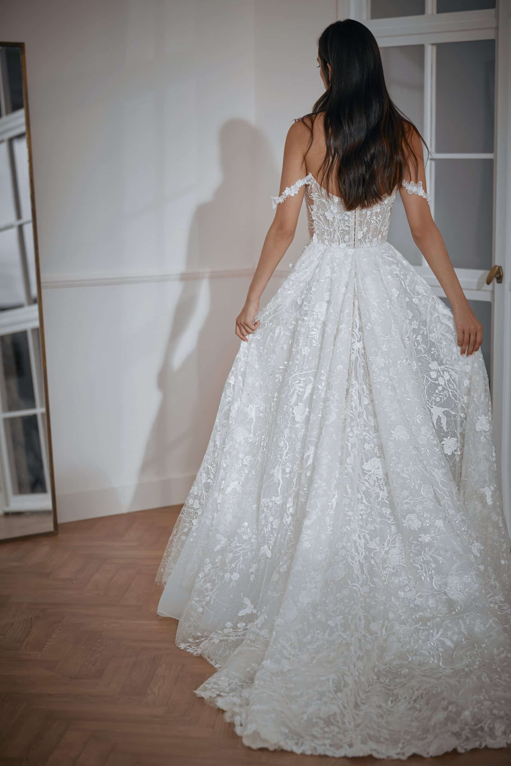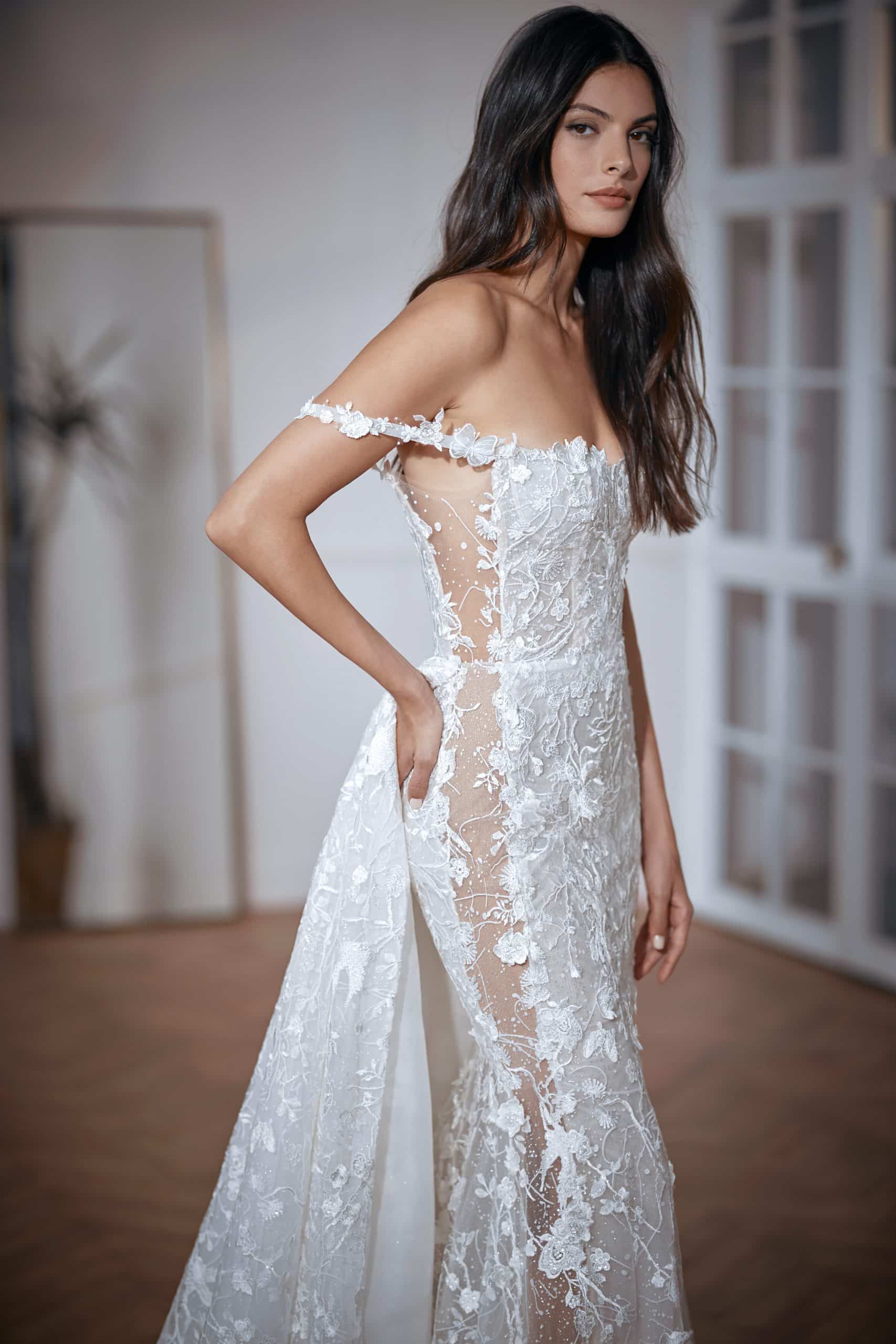 Sweetheart embroidered gown with a fitted skirt and long train, features semi sheer side cutouts, and bird embellishments. Adorned with a dramatic detachable overskirt and off-the-shoulder sleeves.