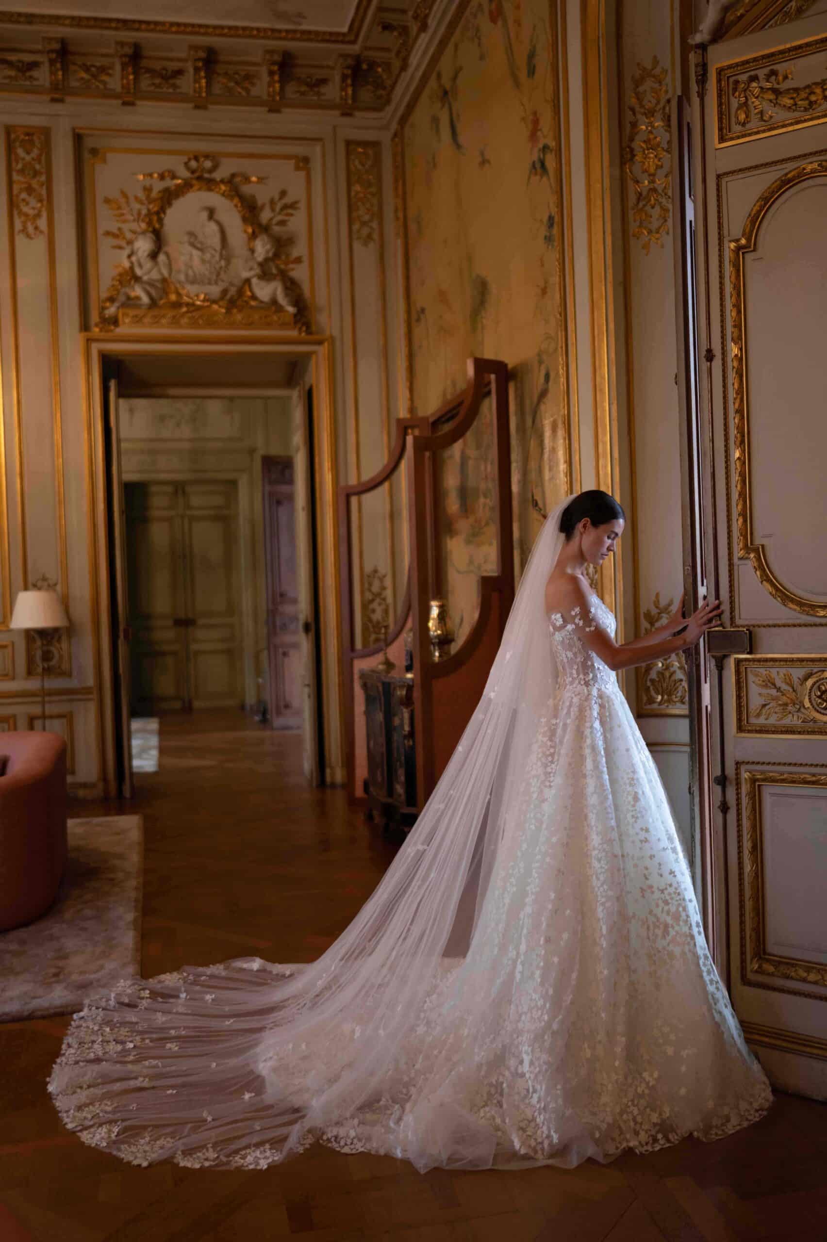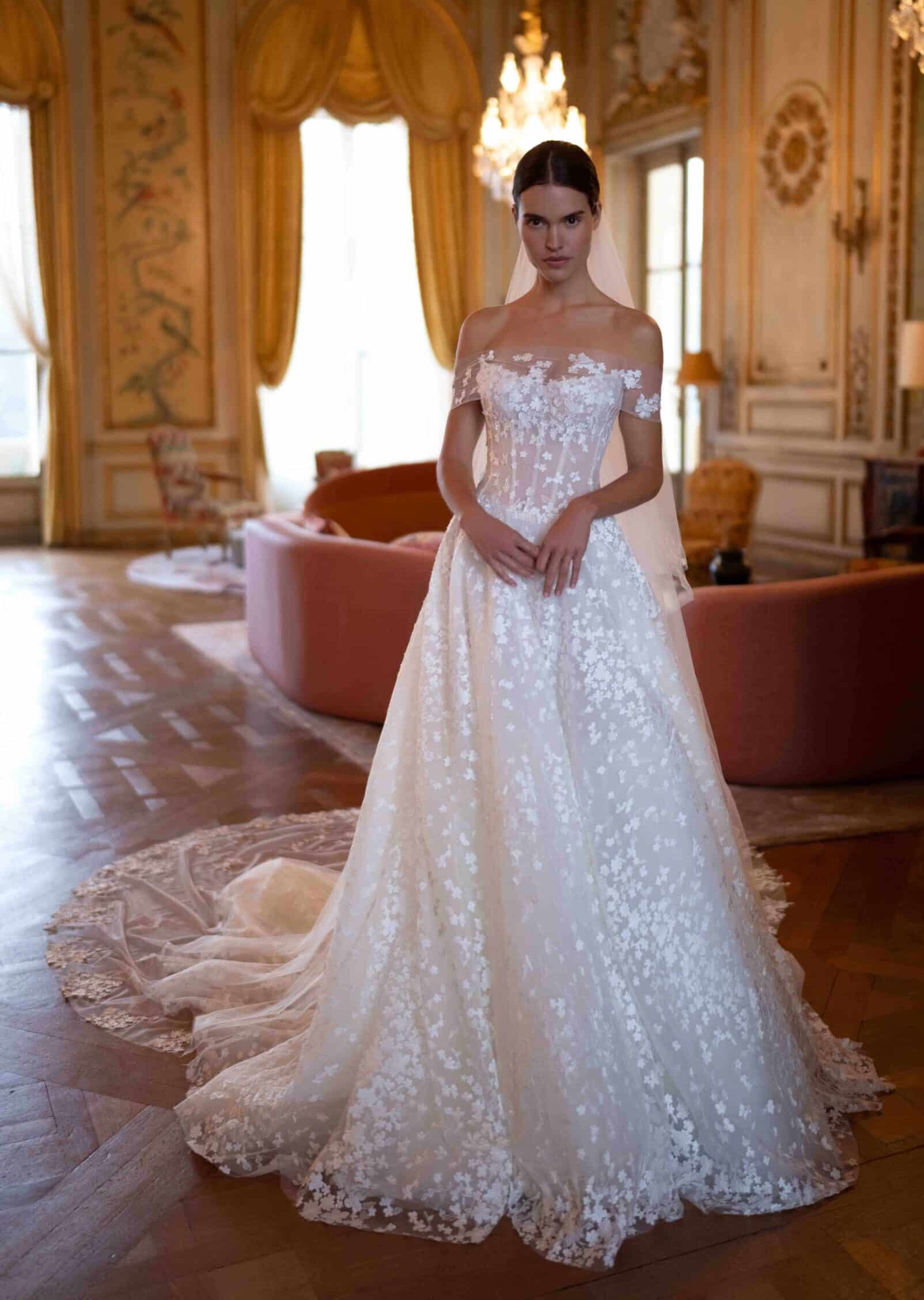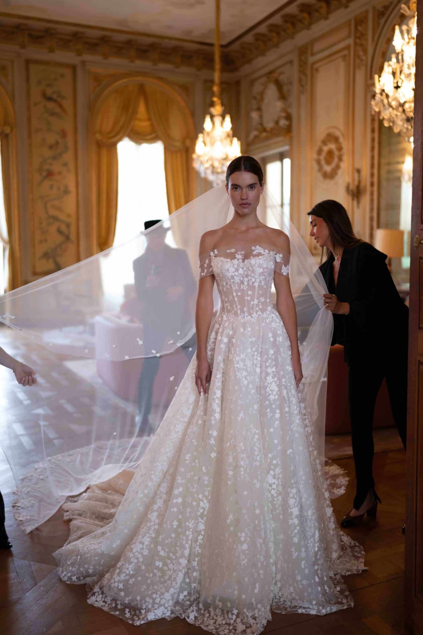 A romantic off-the-shoulder ball gown adorned with delicate 3D floral appliqués. The fitted corset bodice flows into a voluminous skirt with a sweeping train. Completed by a matching detachable off-shoulder tulle drape and a veil for a harmonious, ethereal look.