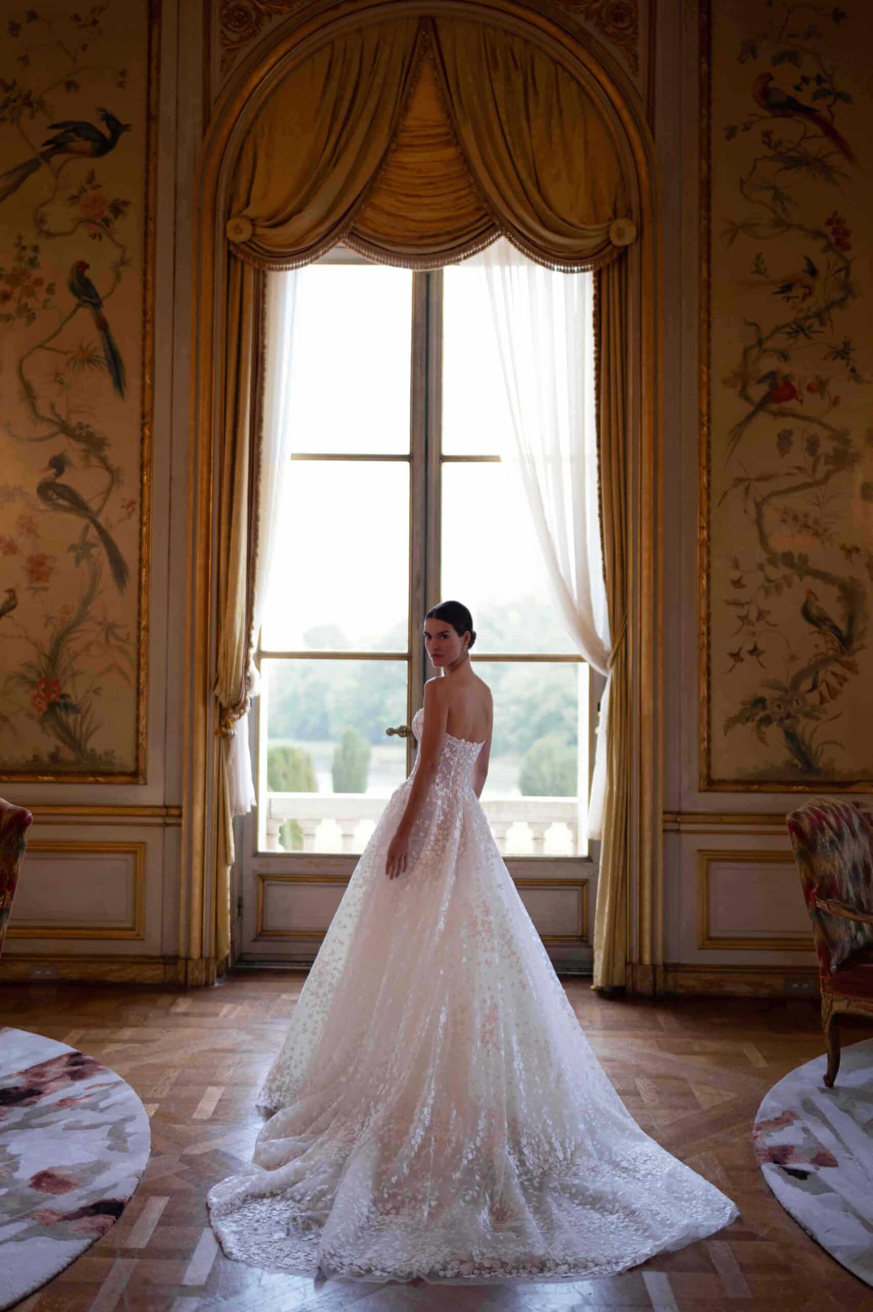 A romantic off-the-shoulder ball gown adorned with delicate 3D floral appliqués. The fitted corset bodice flows into a voluminous skirt with a sweeping train. Completed by a matching detachable off-shoulder tulle drape and a veil for a harmonious, ethereal look.