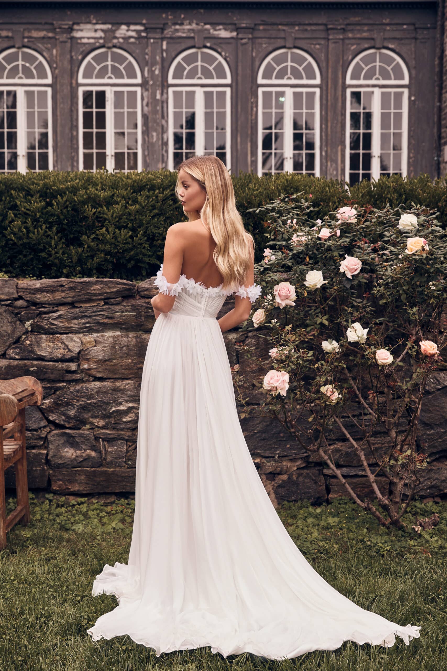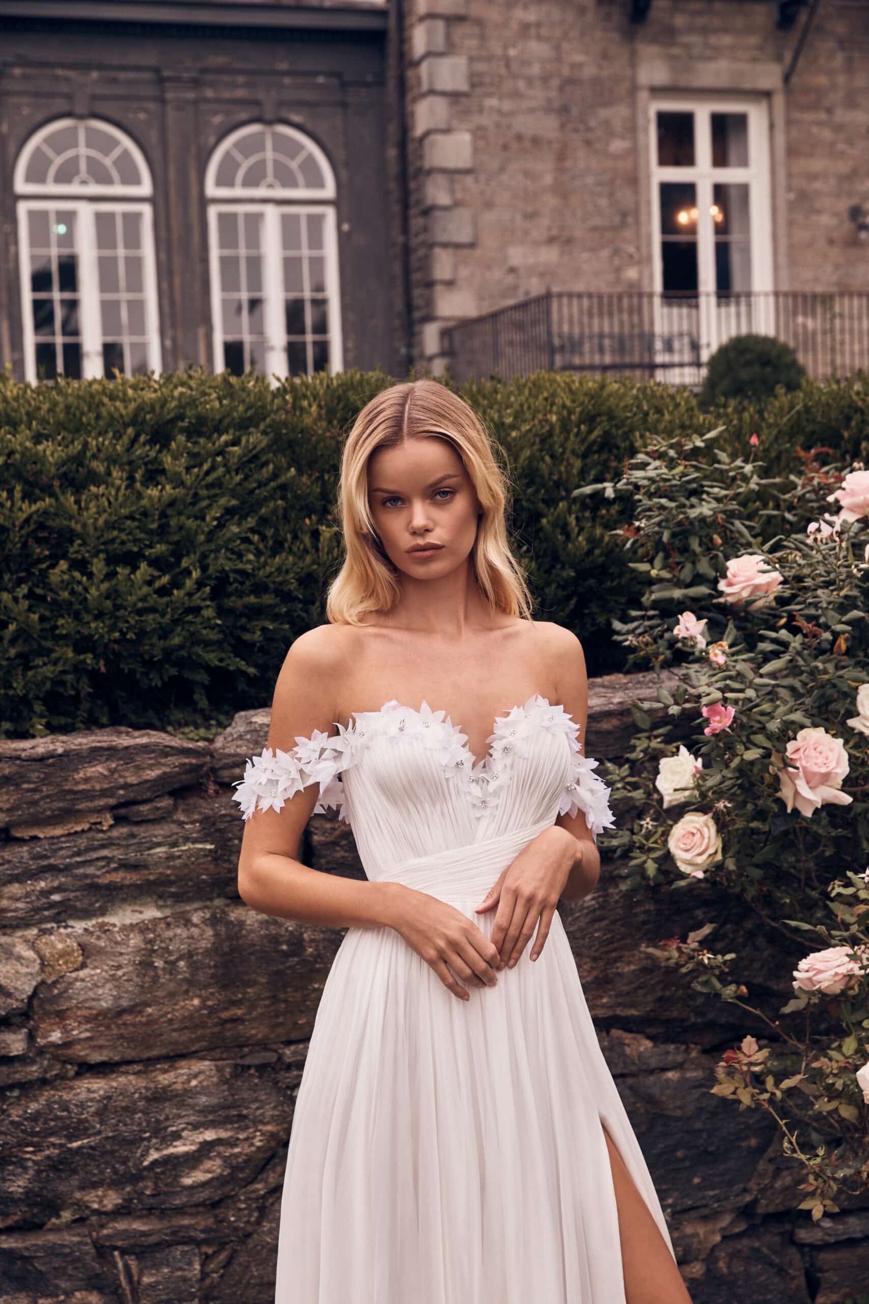 Contemporary A-line gown with a slit. Made from 100% silk chiffon (lining from silk satin). With pleated bodice and handmade 3D florals.
