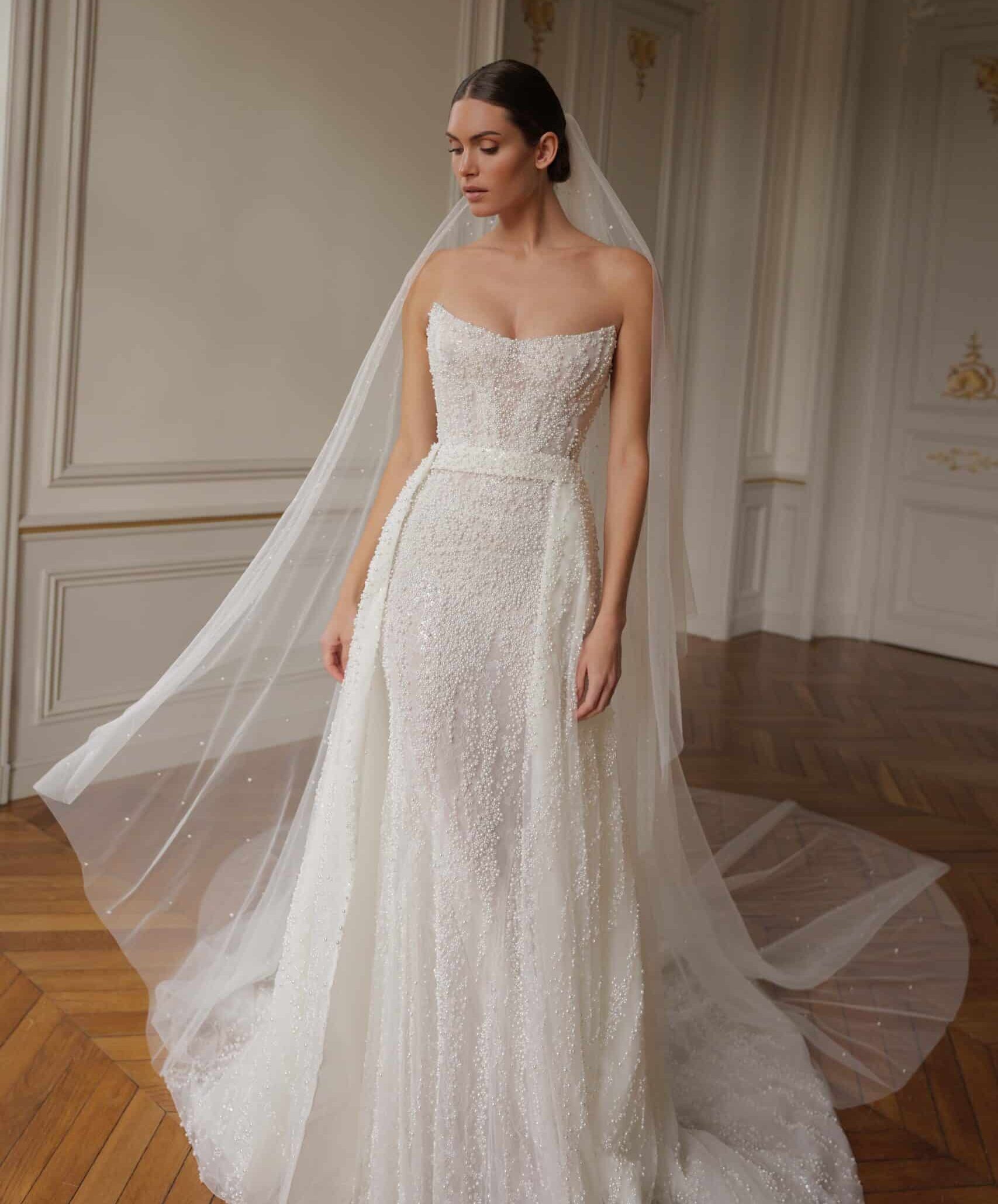 A mermaid strapless gown crafted from luxurious cascading pearls, adorned with a detachable overskirt and accompanied by a matching veil that features pearls.