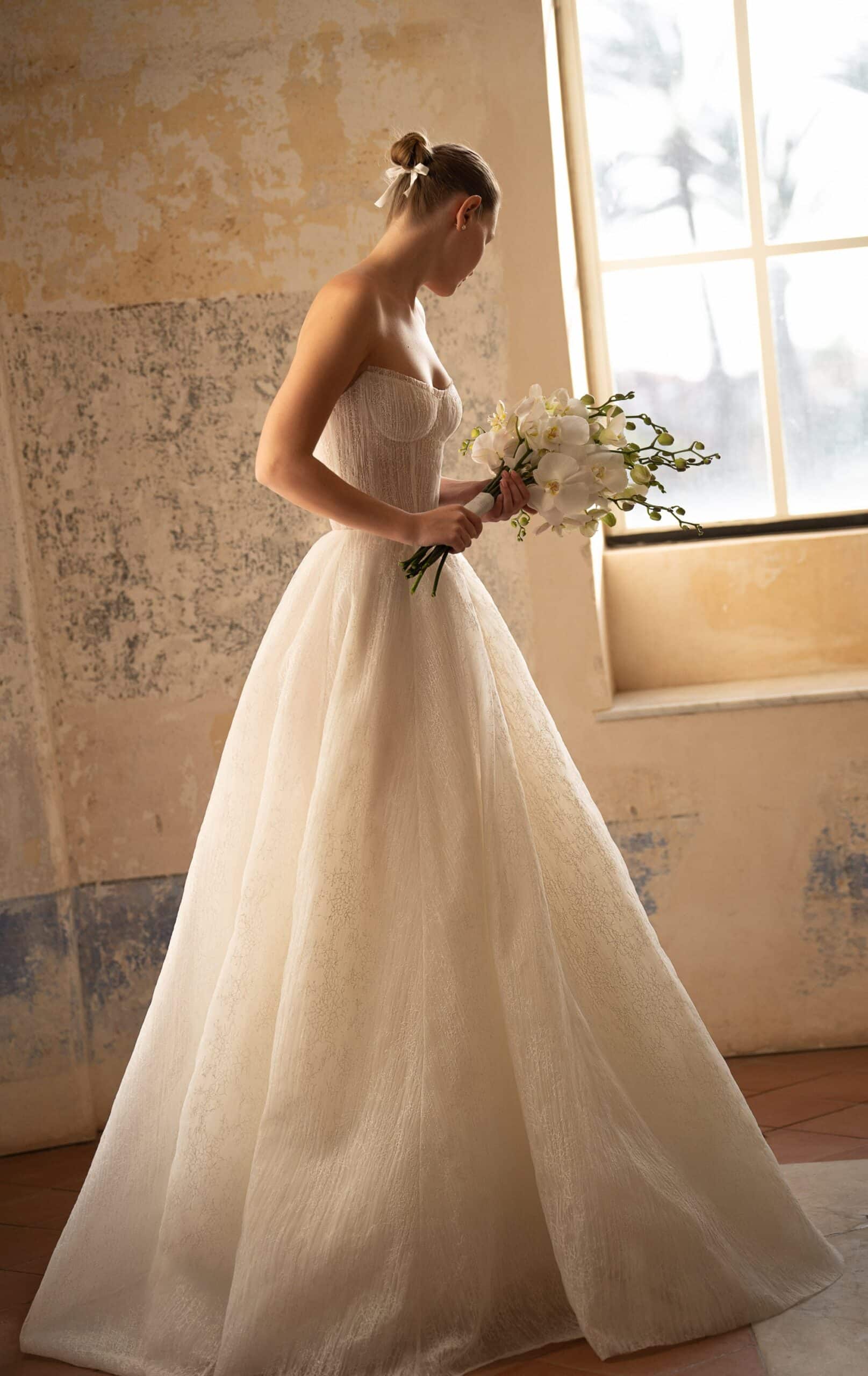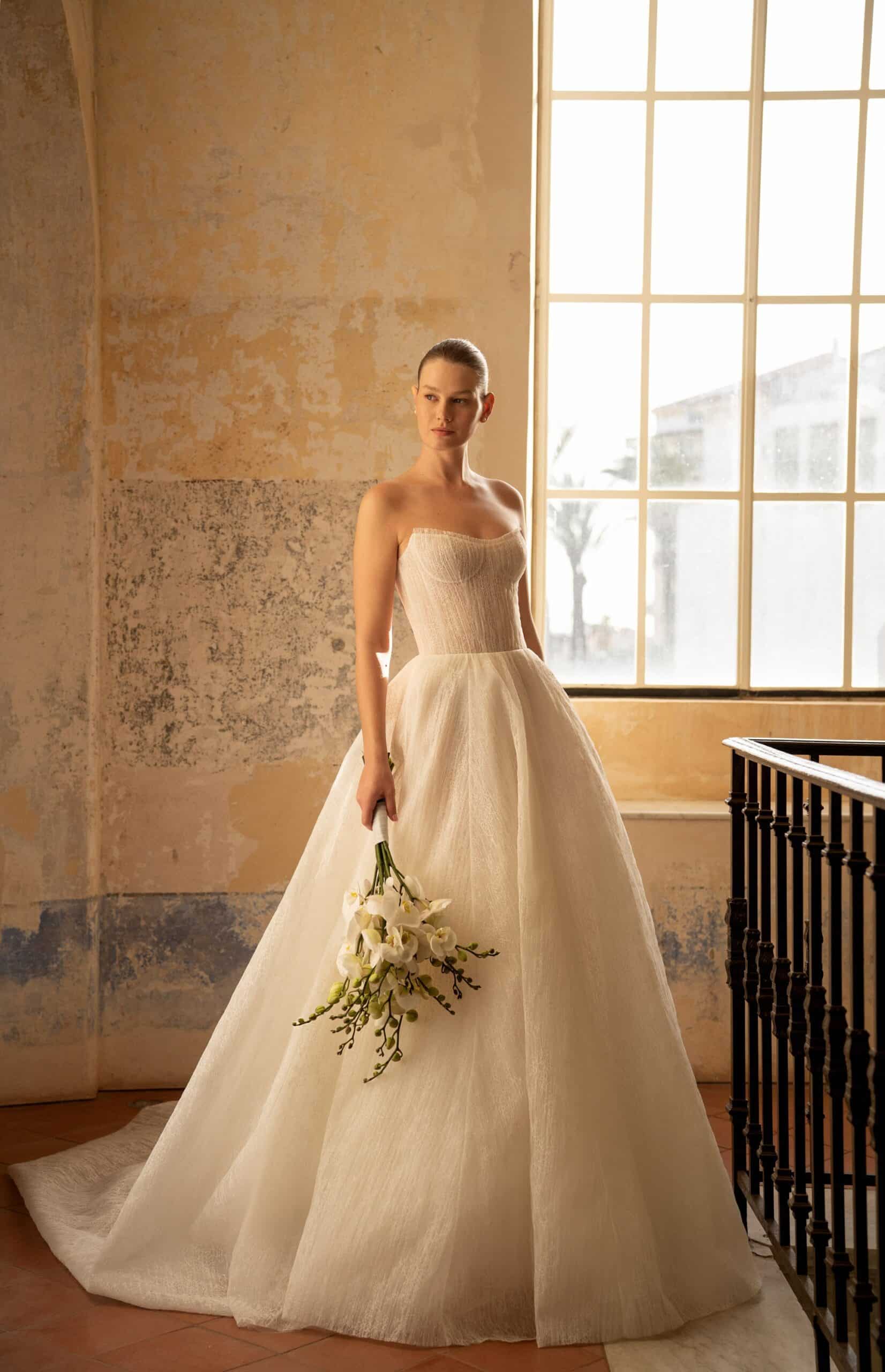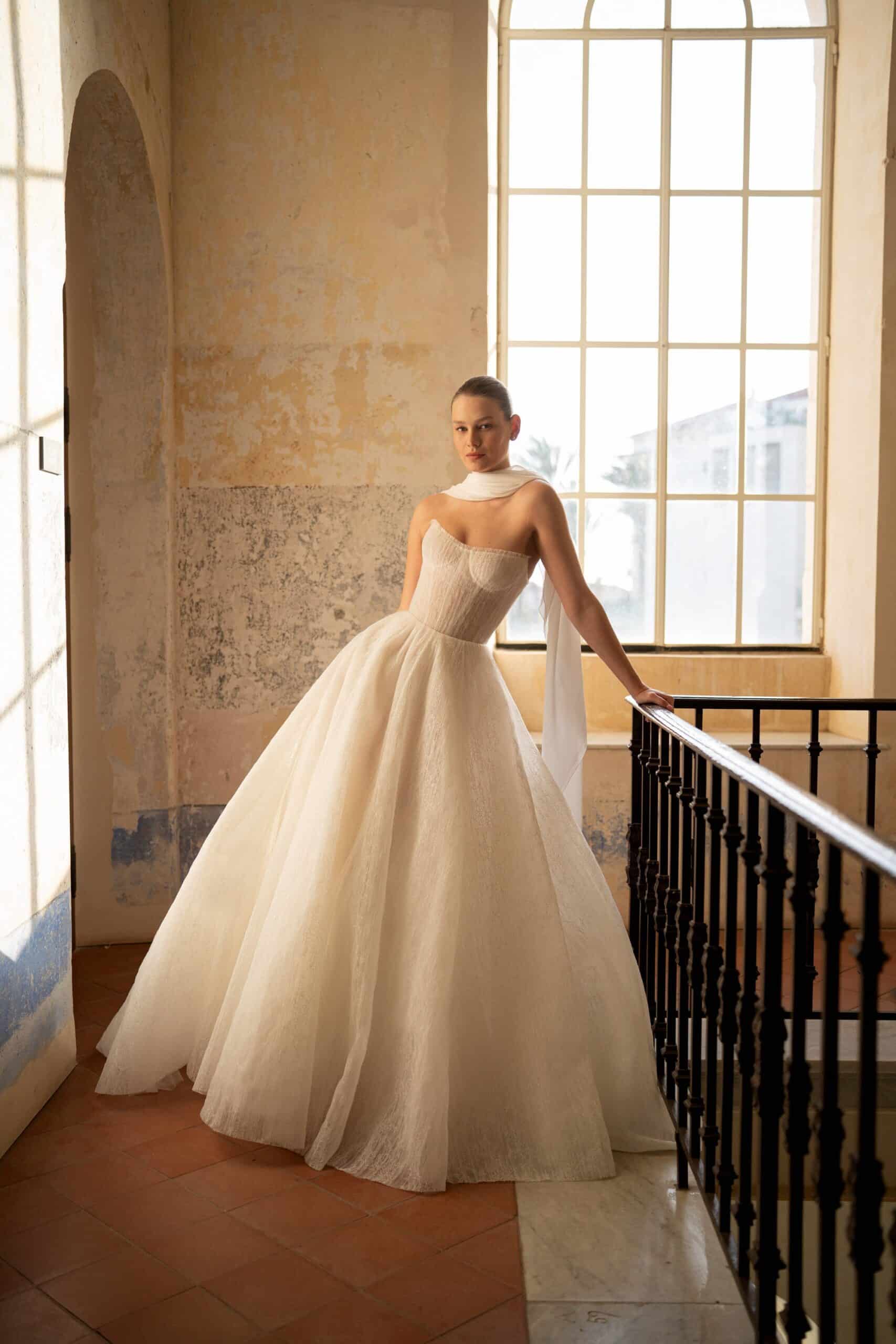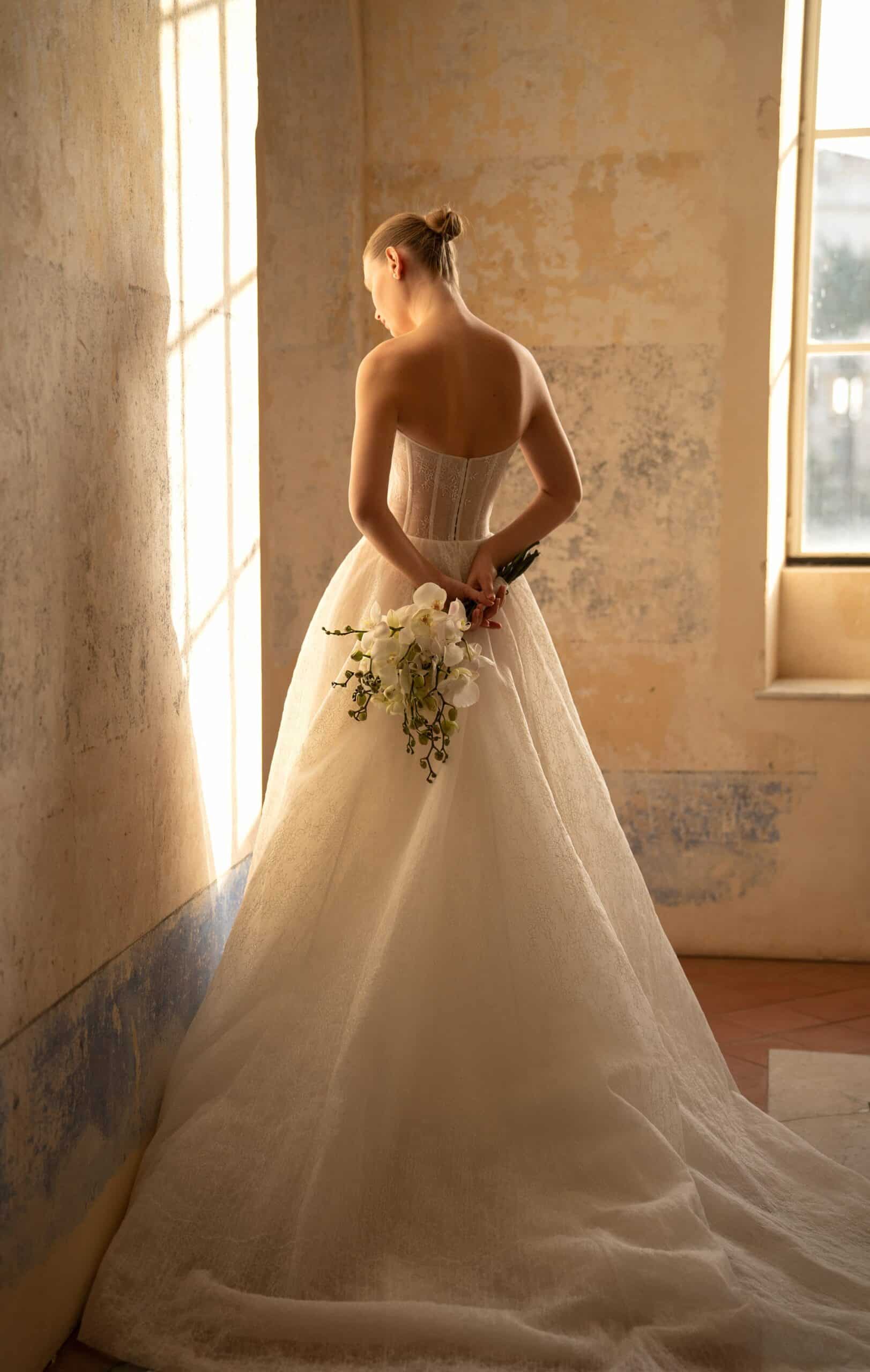 A princess gown featuring a long train and a contemporary structured corset, made from shimmering Tulle plissé and French lace.