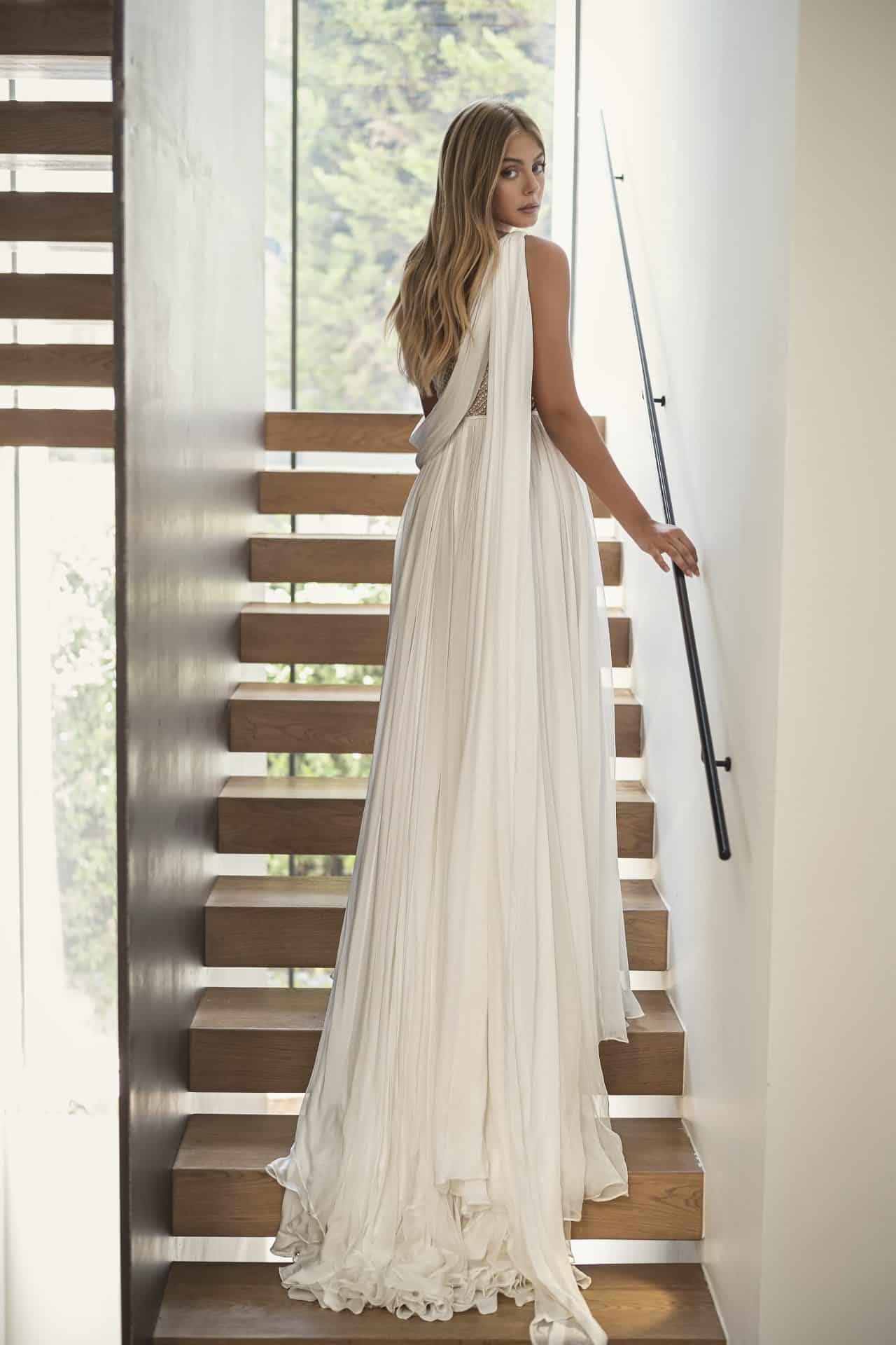 Silk chiffon A-line draped gown encrusted with embroidered pearls.