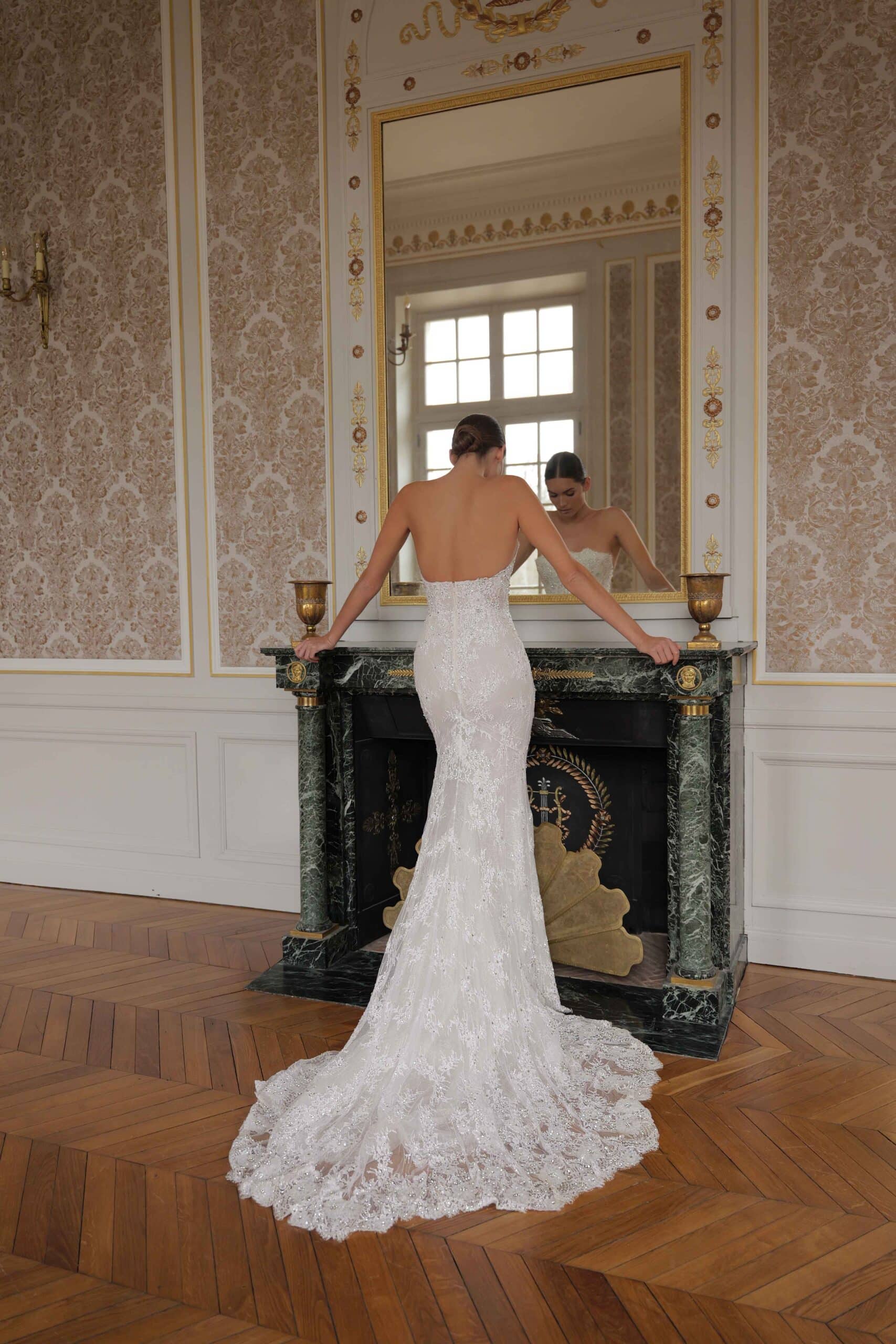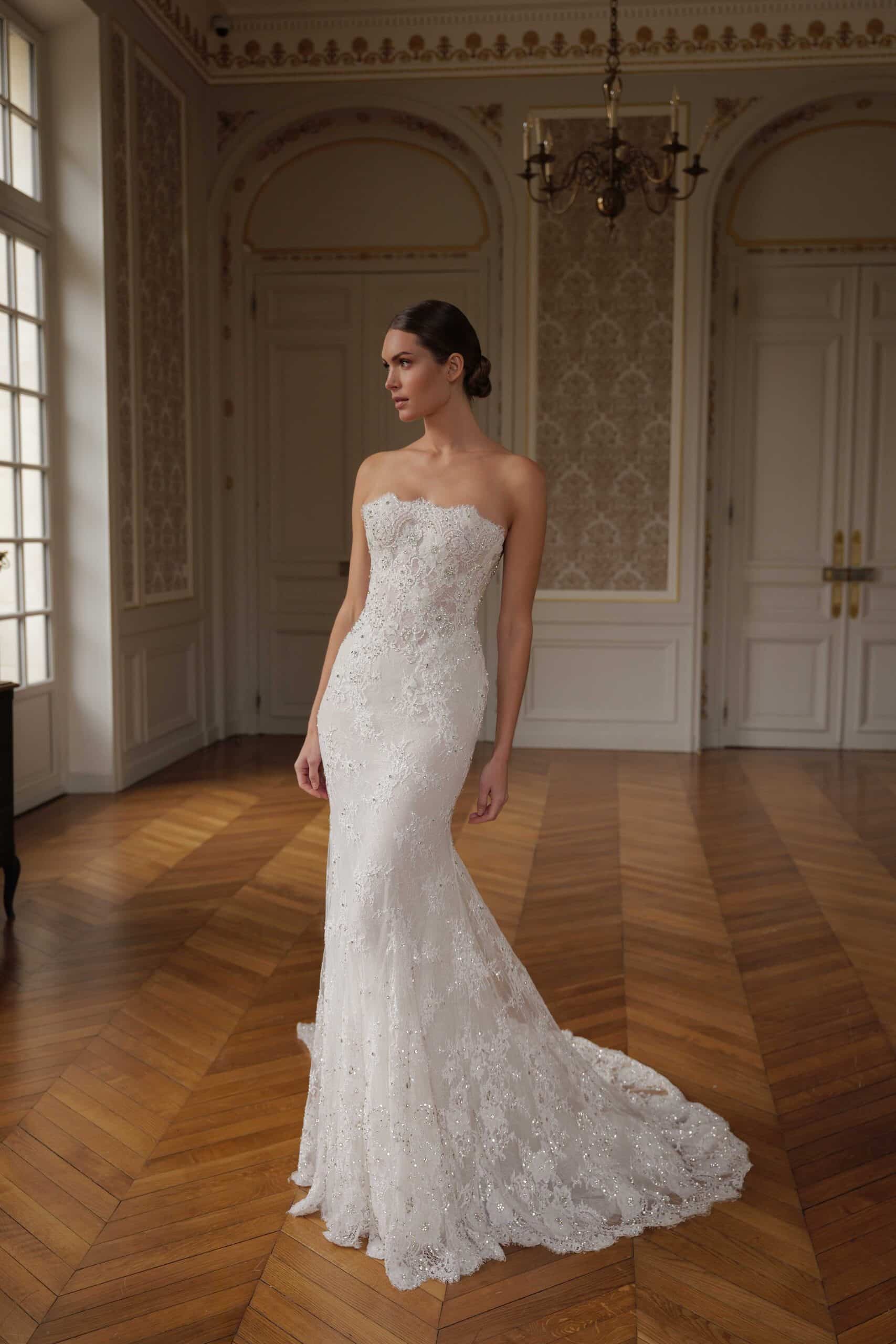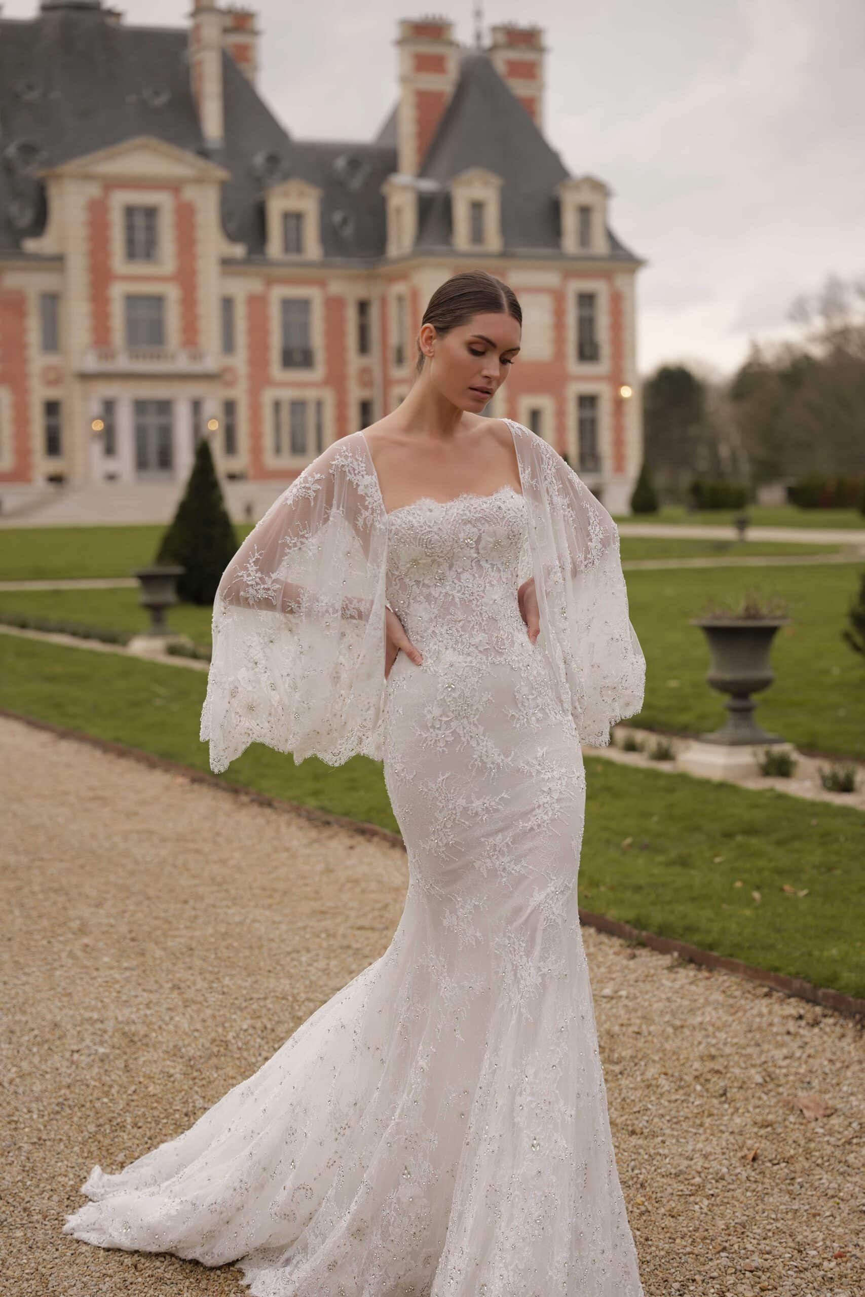 A mermaid gown featuring a strapless straight corset, crafted from sumptuous beaded lace with floral appliqués, complemented by a detachable cape draped over the shoulders.