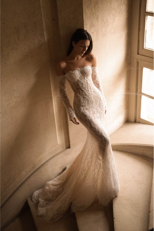 A mermaid gown featuring a straight neckline and elegant off-the-shoulder sleeves. Richly adorned with French lace and intricate beaded decorations, this exquisite dress is paired with a matching veil for a complete, luxurious bridal look.