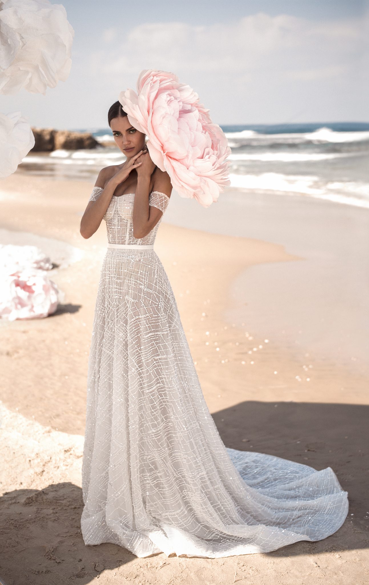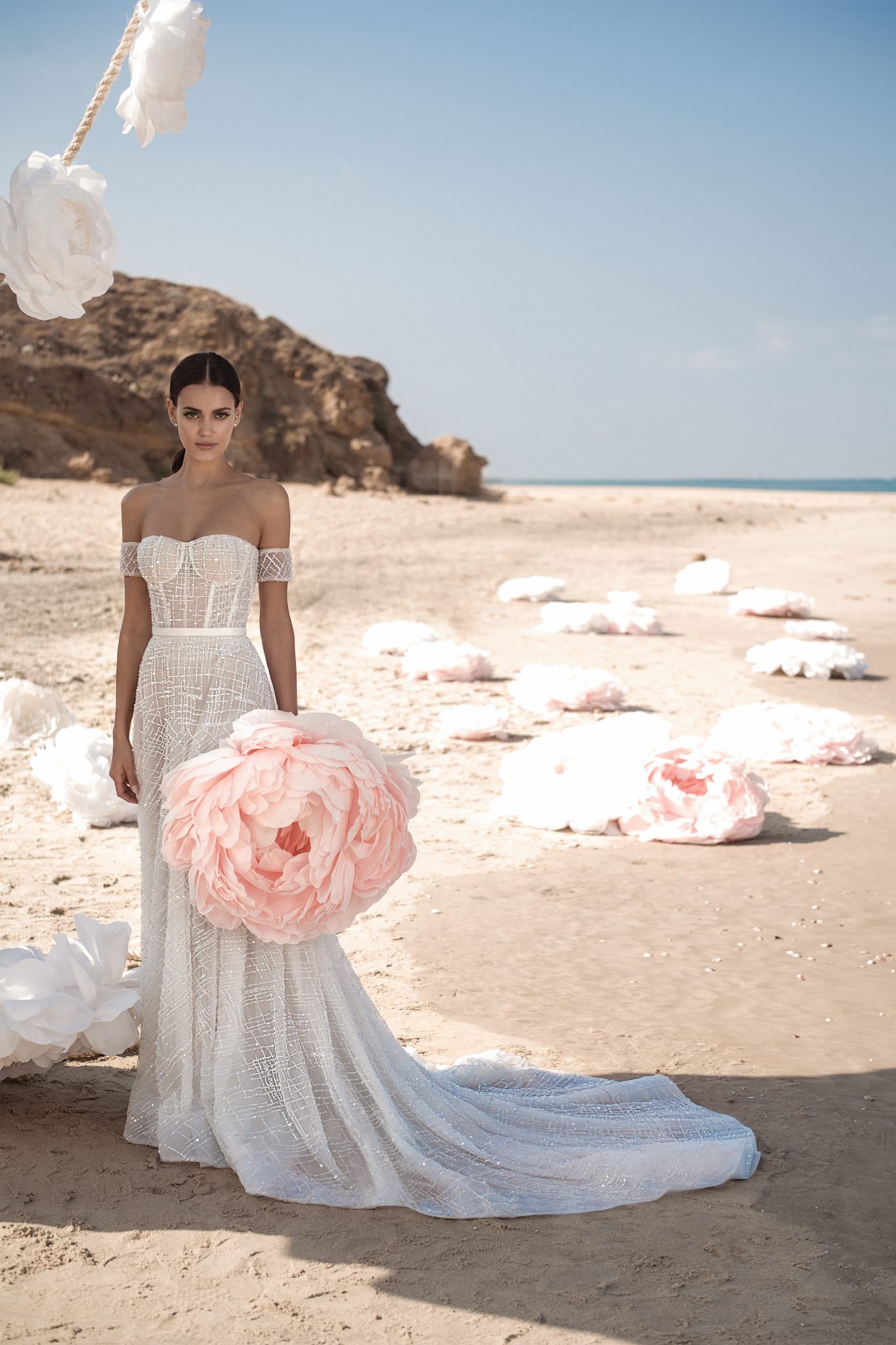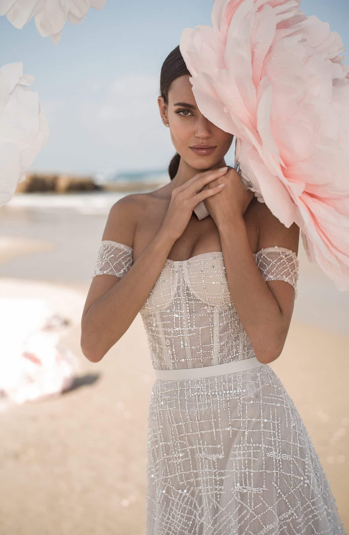 Strapless corseted ball gown adorned with hand beaded embroidery and a leather belt.