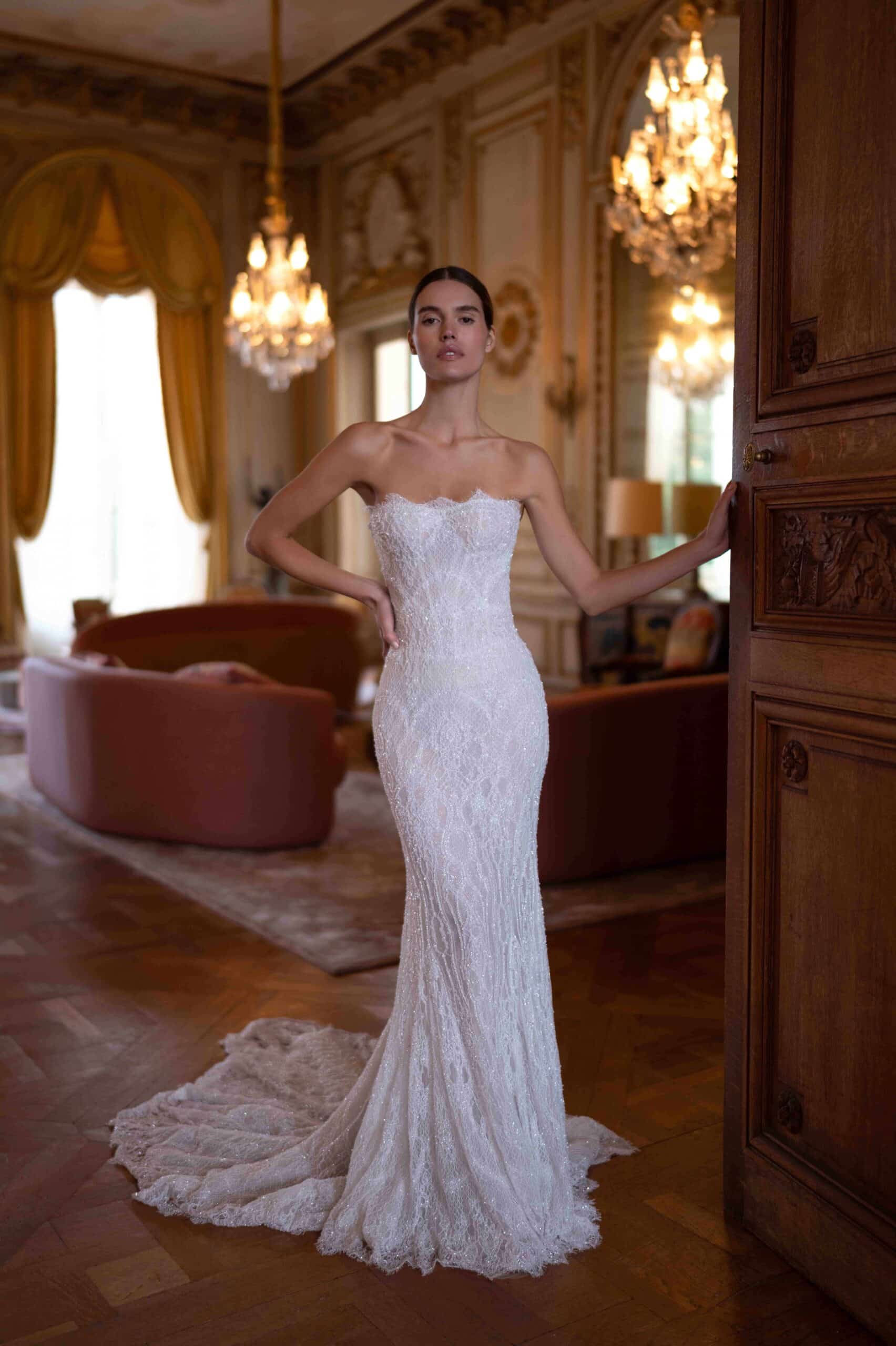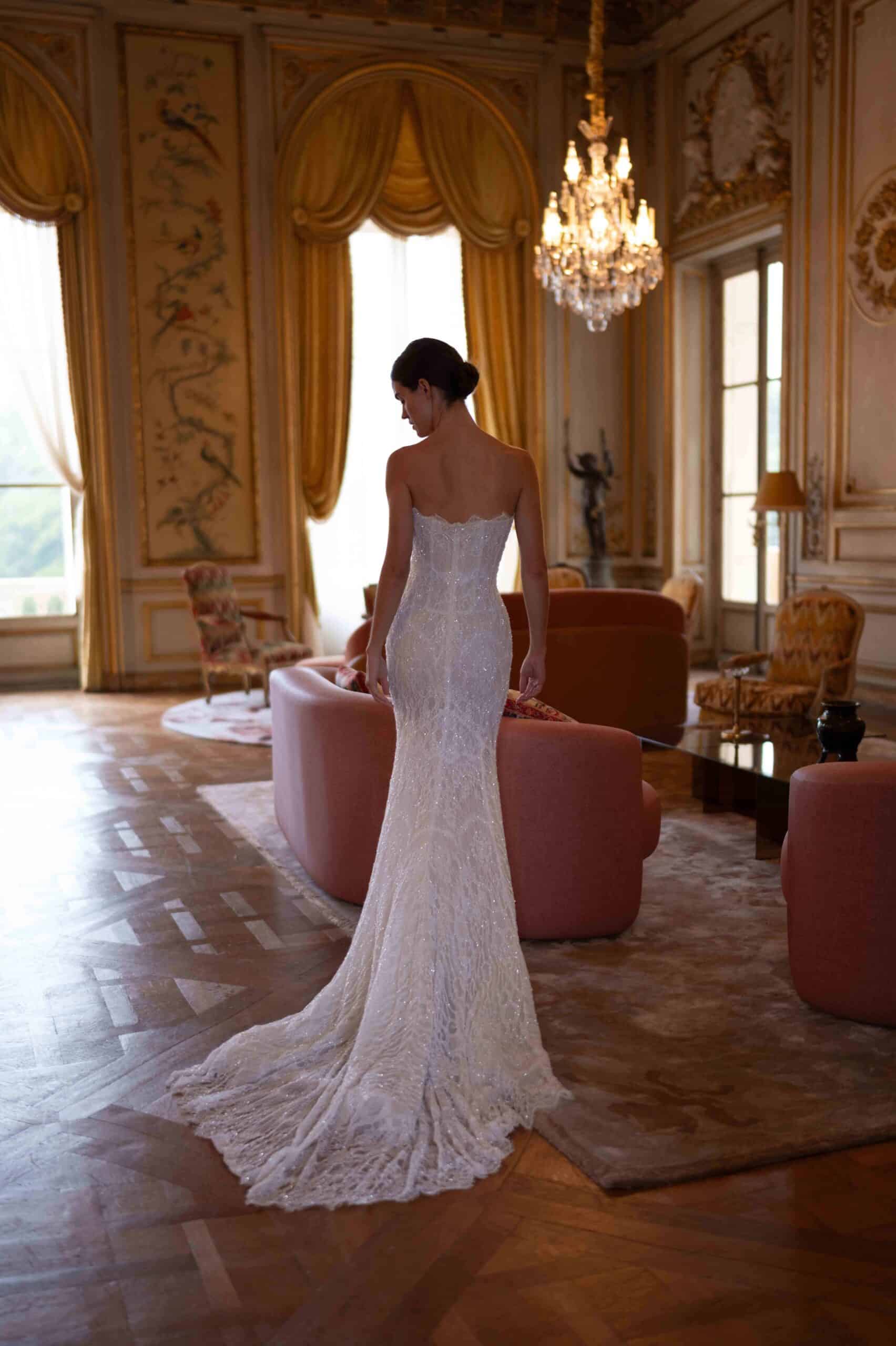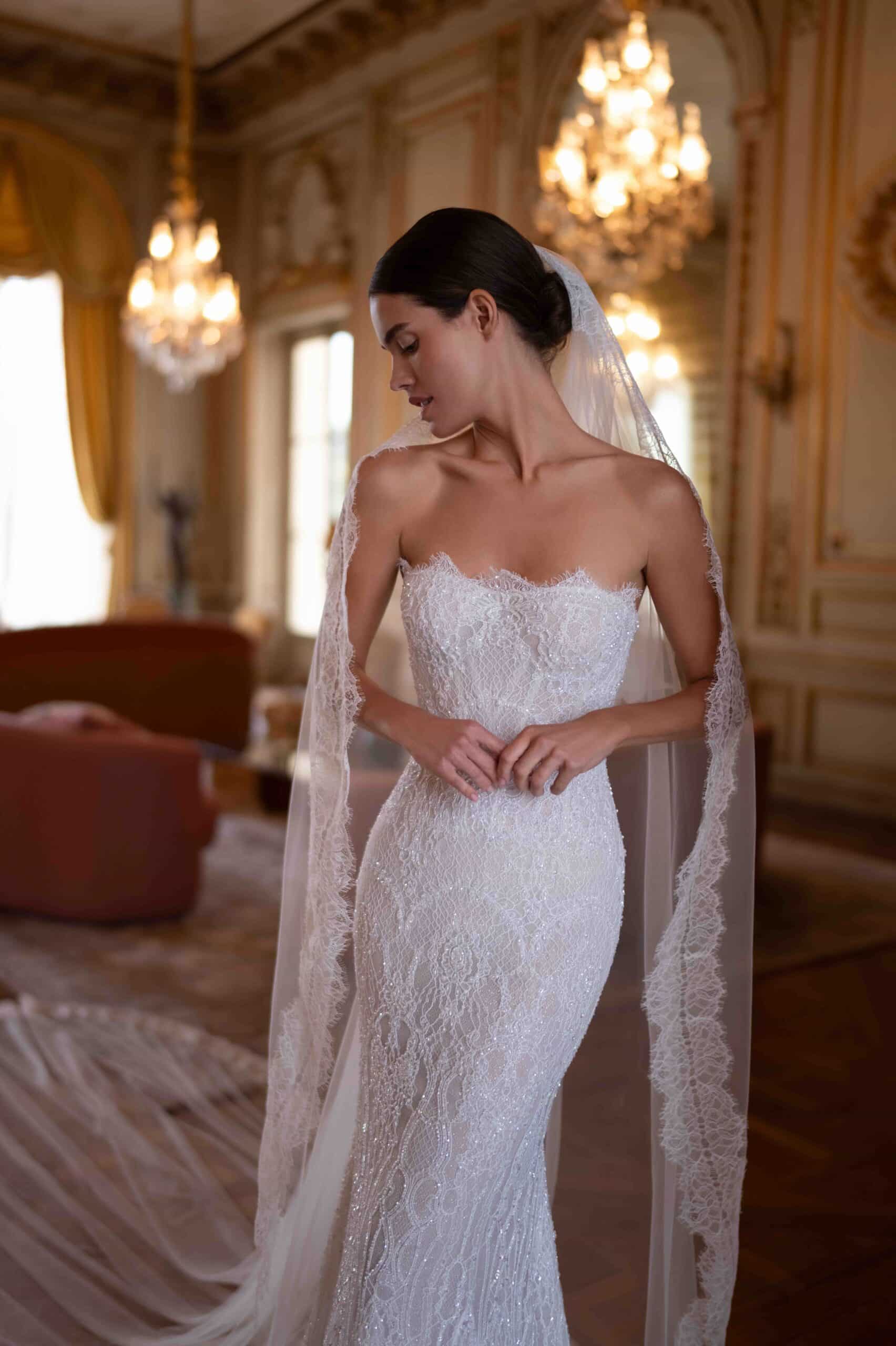 A strapless fitted gown crafted from embroidered shimmery lace. The silhouette sculpts the body, while the scalloped neckline adds a soft romantic touch. Paired with a cathedral-length lace veil.
