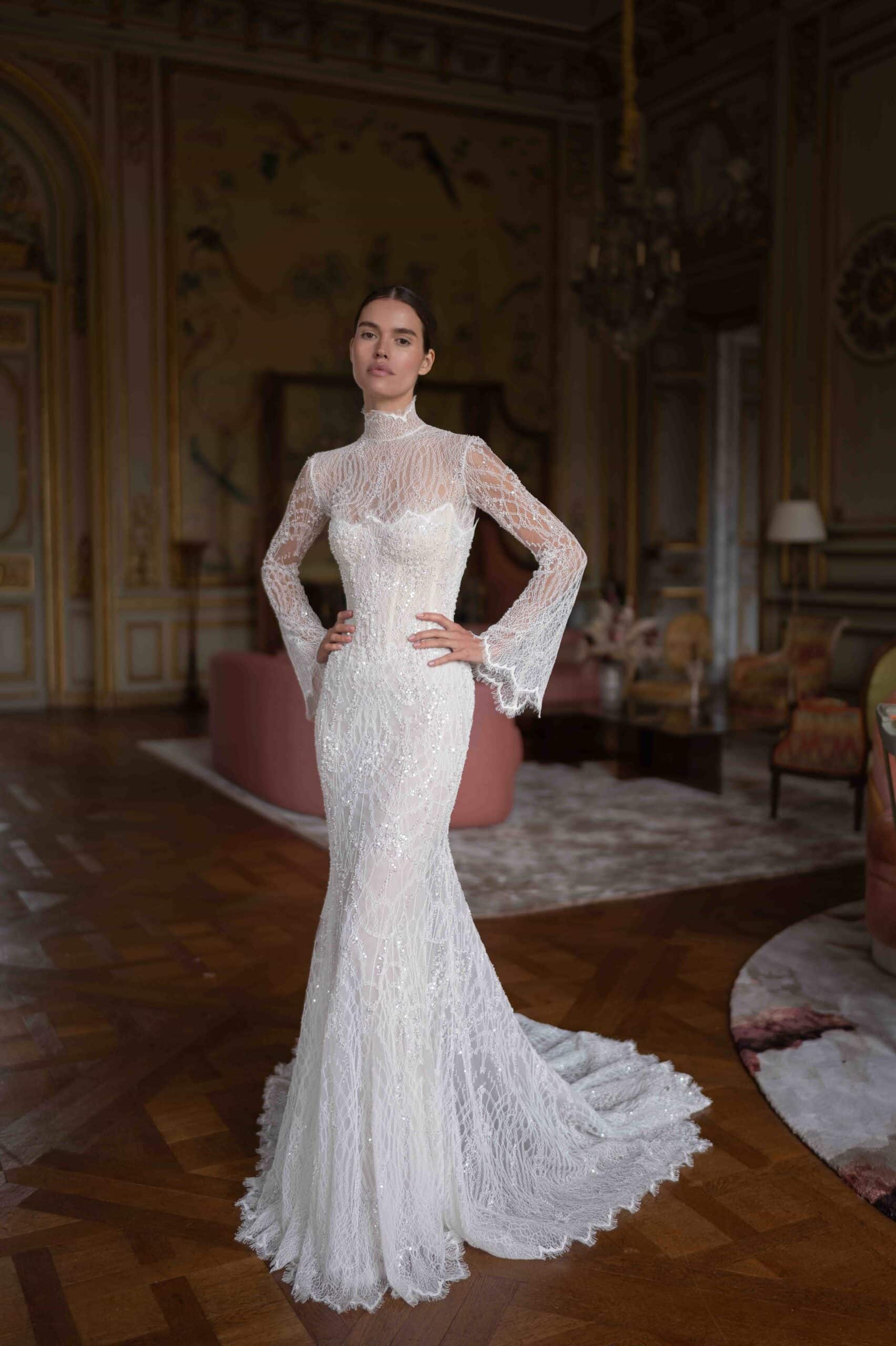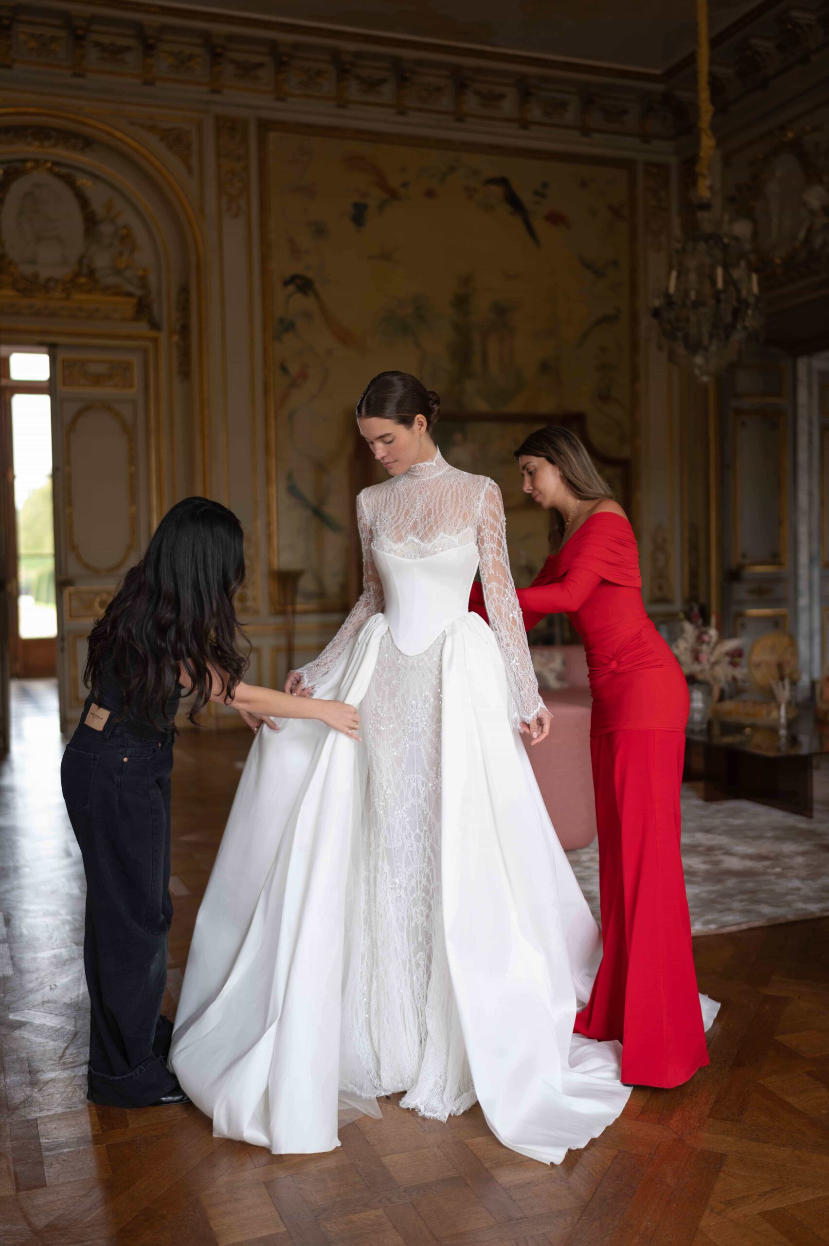 A regal three-piece gown featuring a beaded lace fitted gown layered beneath a sculptural mikado silk overskirt corset. The look is completed with a high-neck lace topper, creating an elegant balance of strength and delicacy.