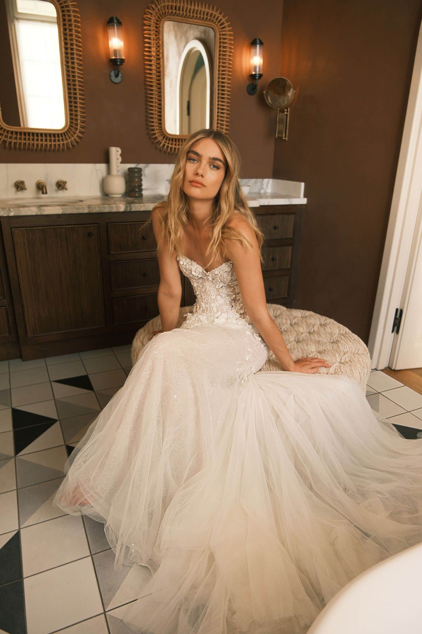 Sweetheart corset gown with built-in corset, embellished with floral elements cascading. Accompanied by detachable off-the-shoulder cape sleeves.