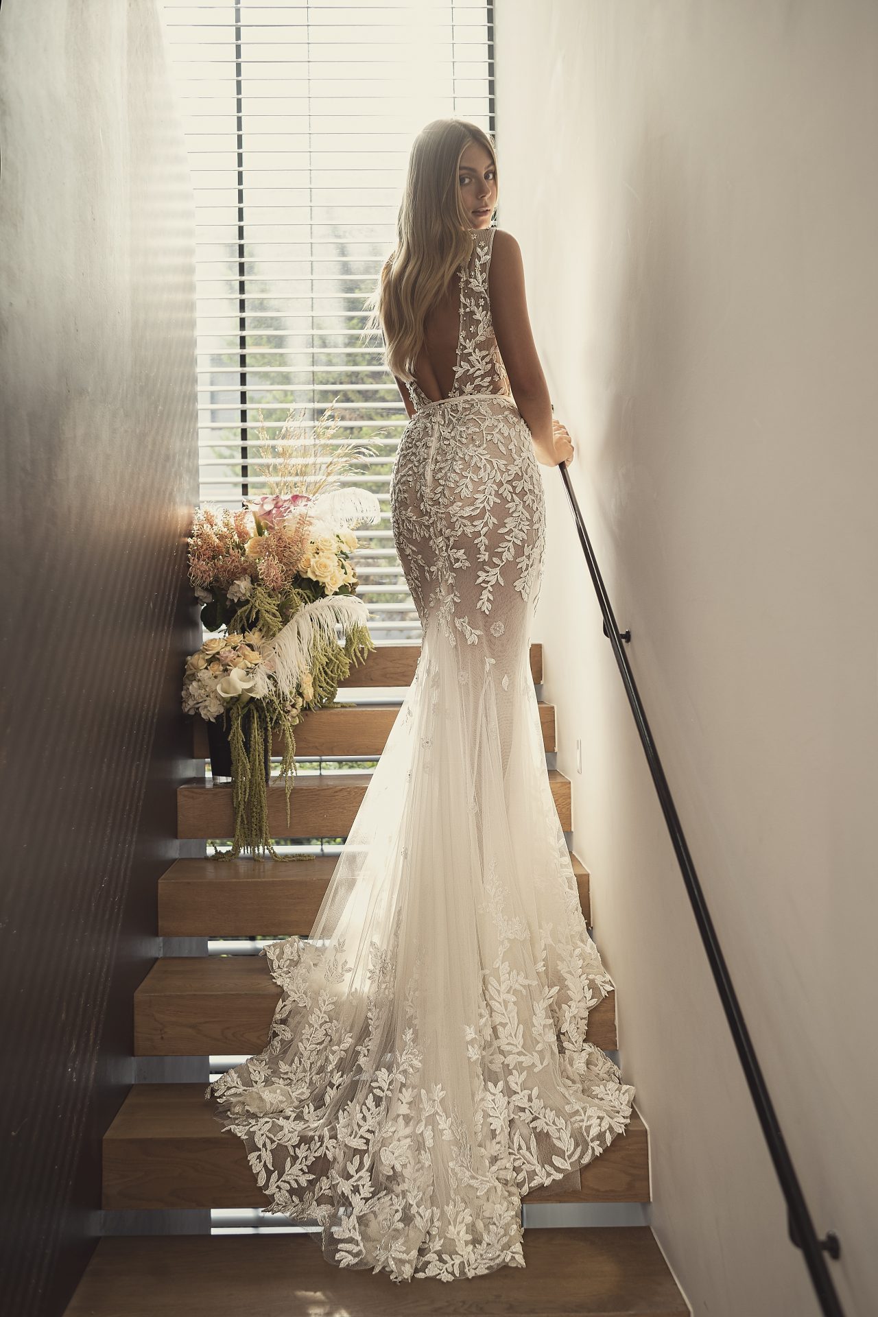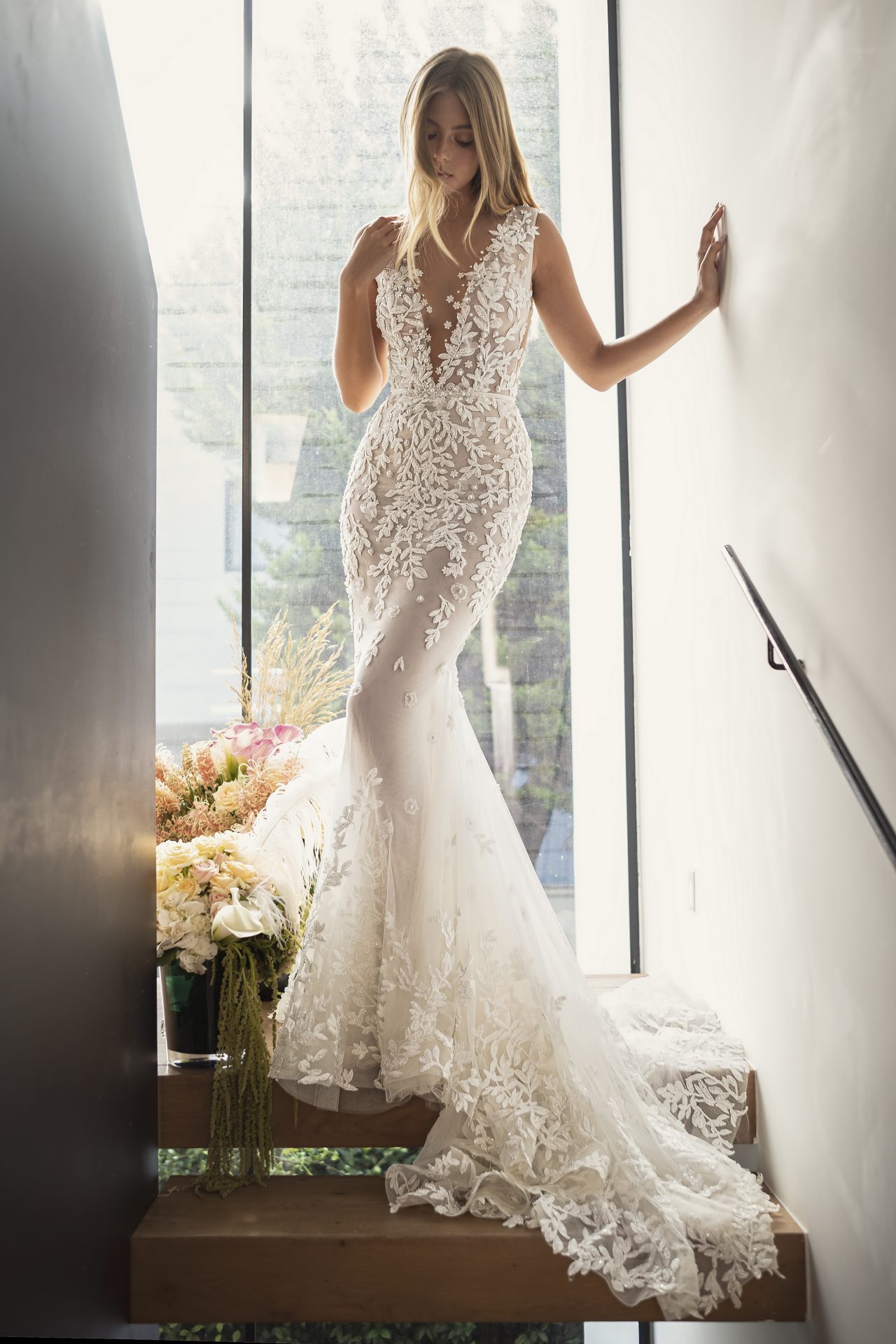 V- neckline mermaid gown with beaded leaf appliqué and a one shoulder cape.