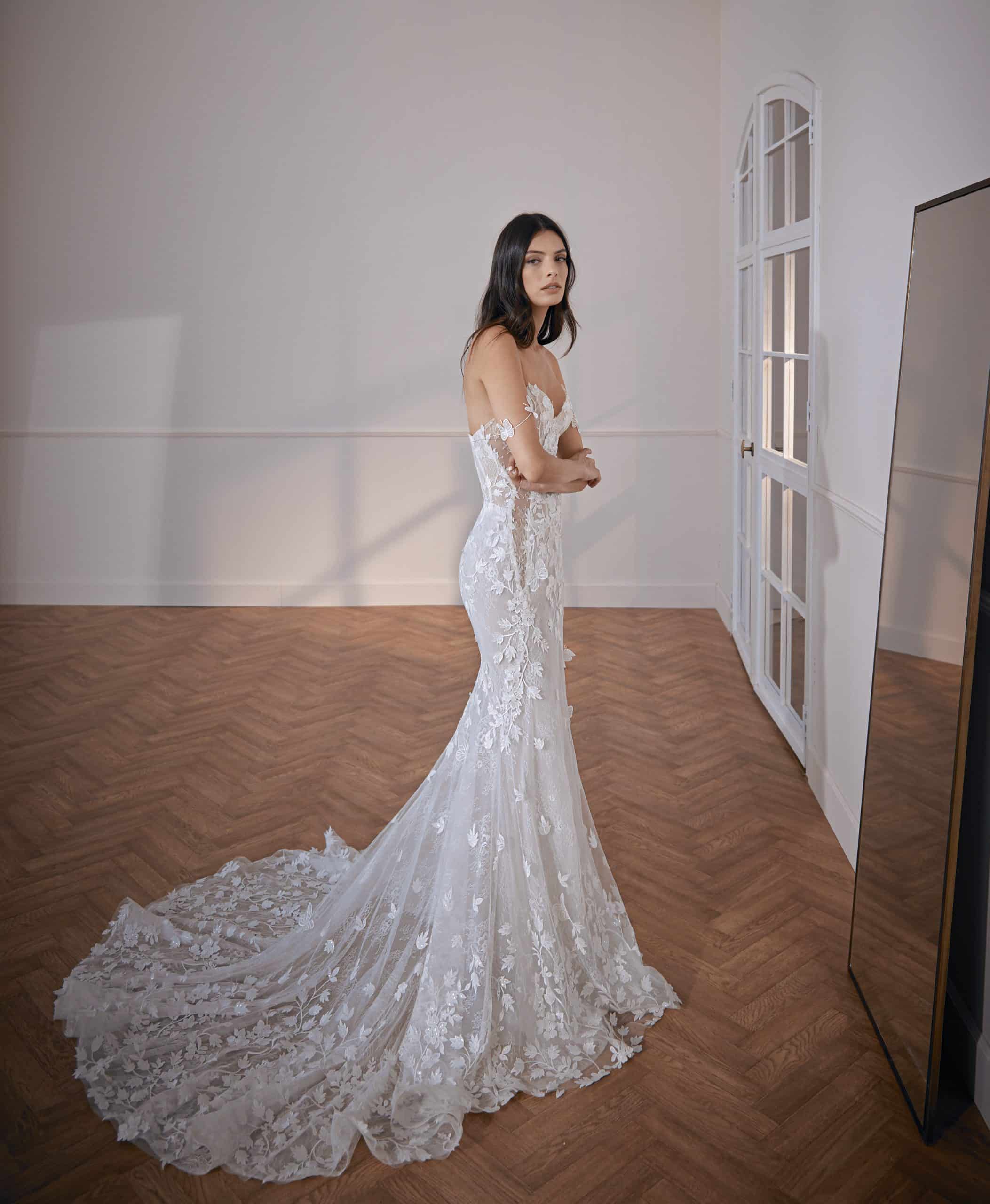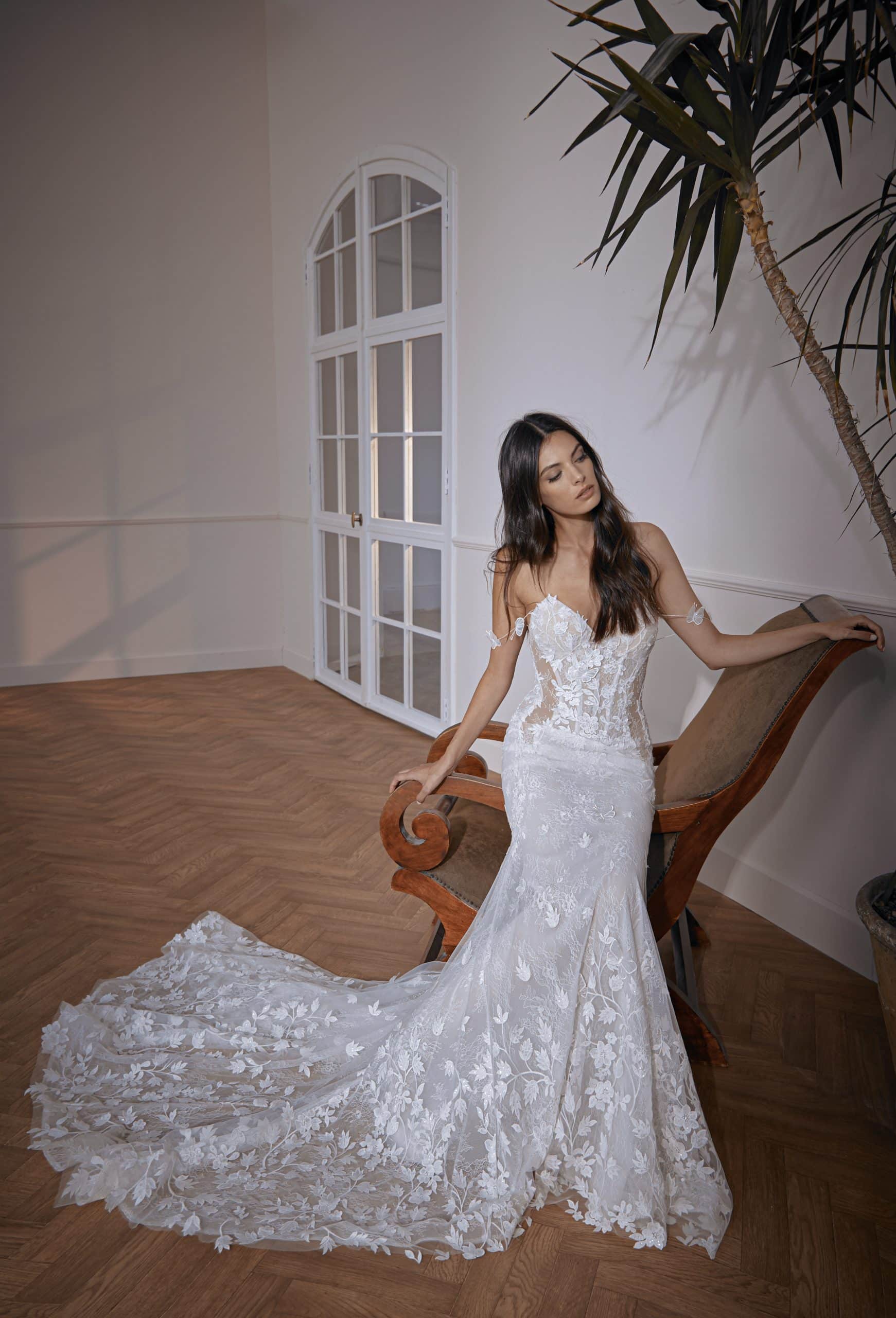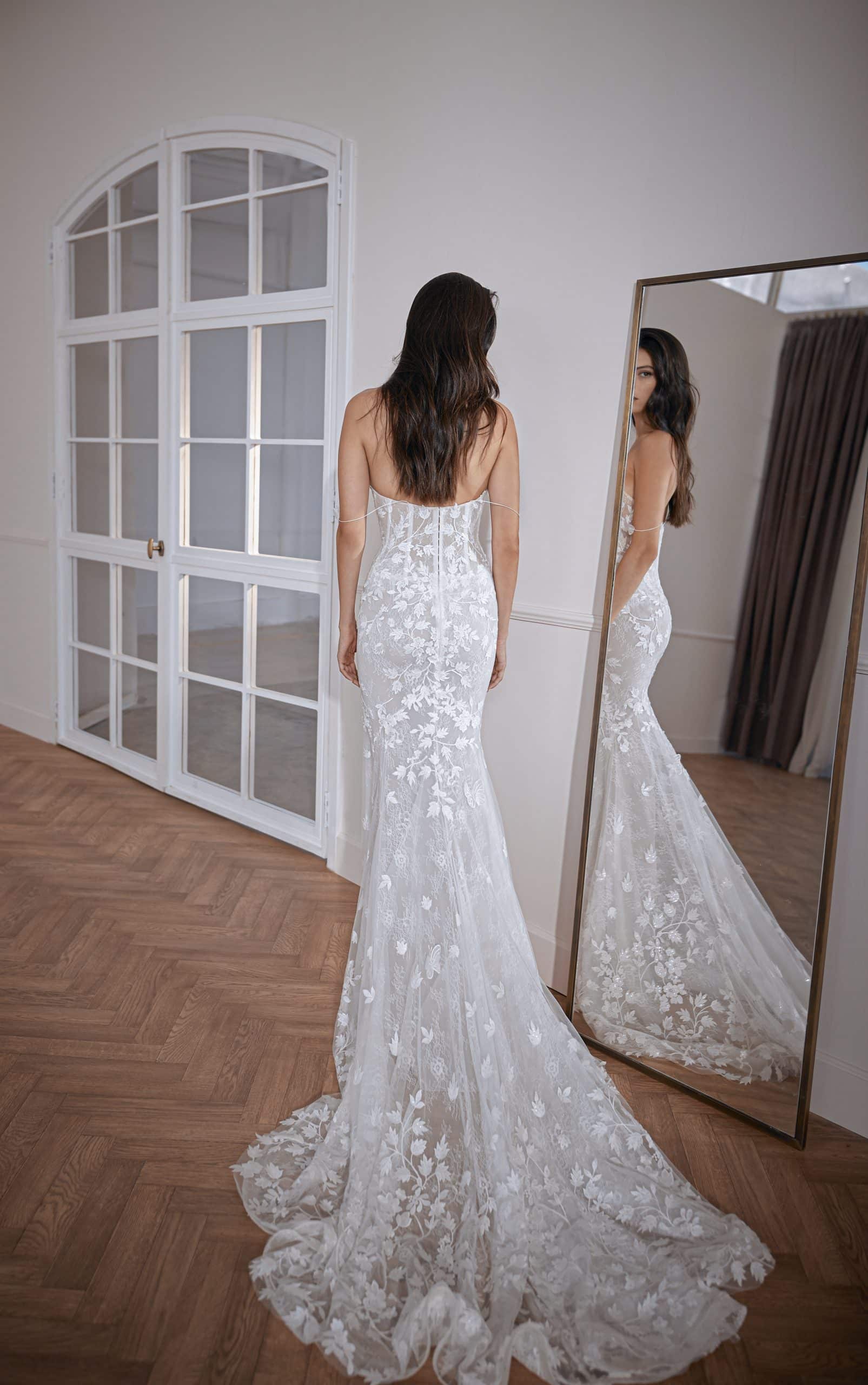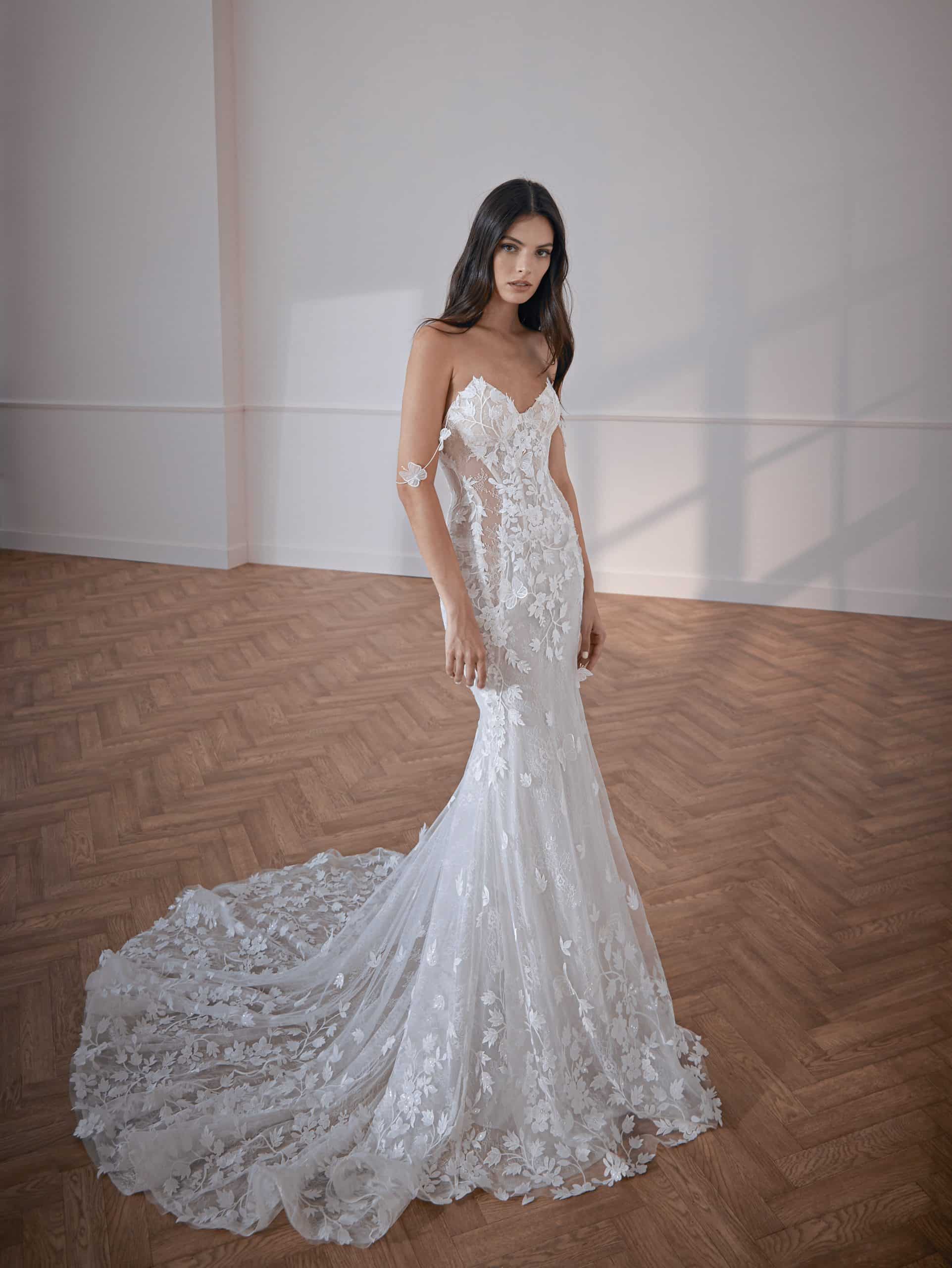 Luxurious flowers and 3D butterfly appliqués gown, fitted skirt, and rich embellished train. Features bodice cutouts and spaghetti shoulder straps.