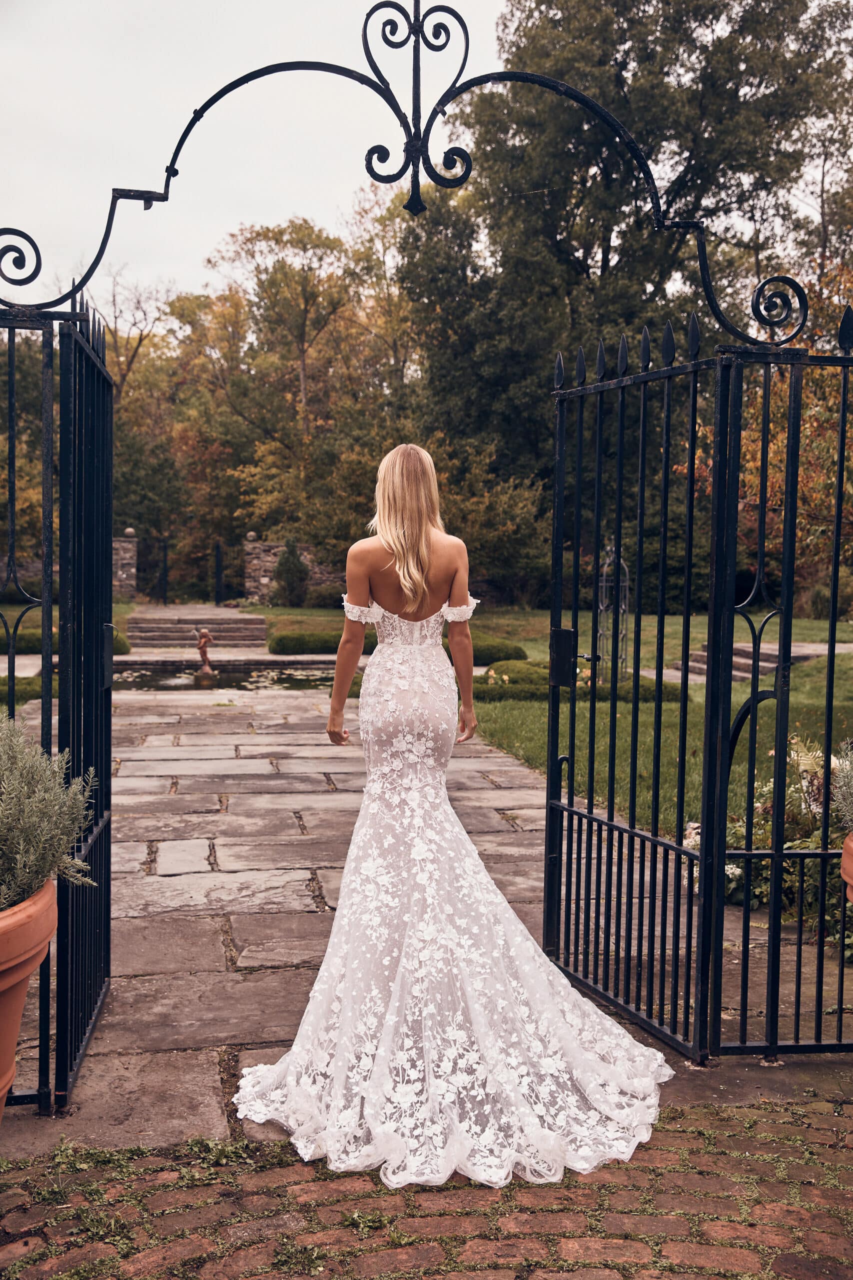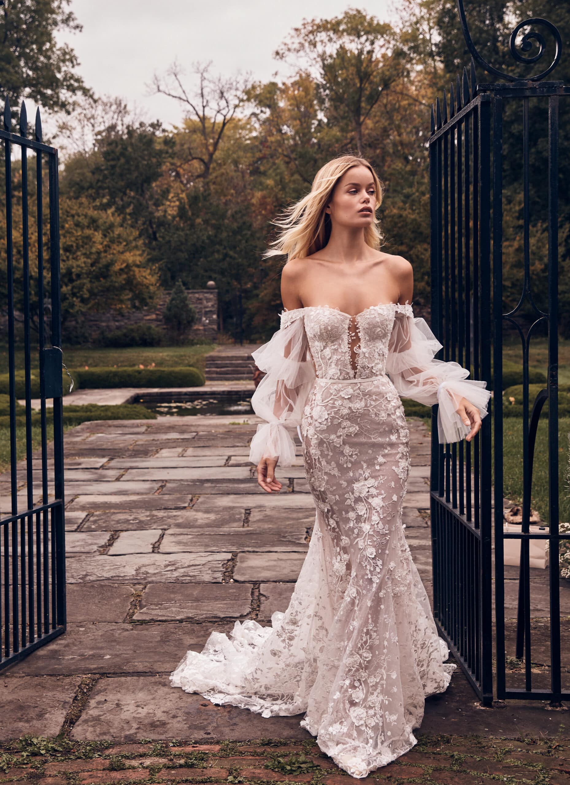 Floral embroidered gown with fitted skirt and rich embellished train. Featuring silk tulle-tiered detachable sleeves.