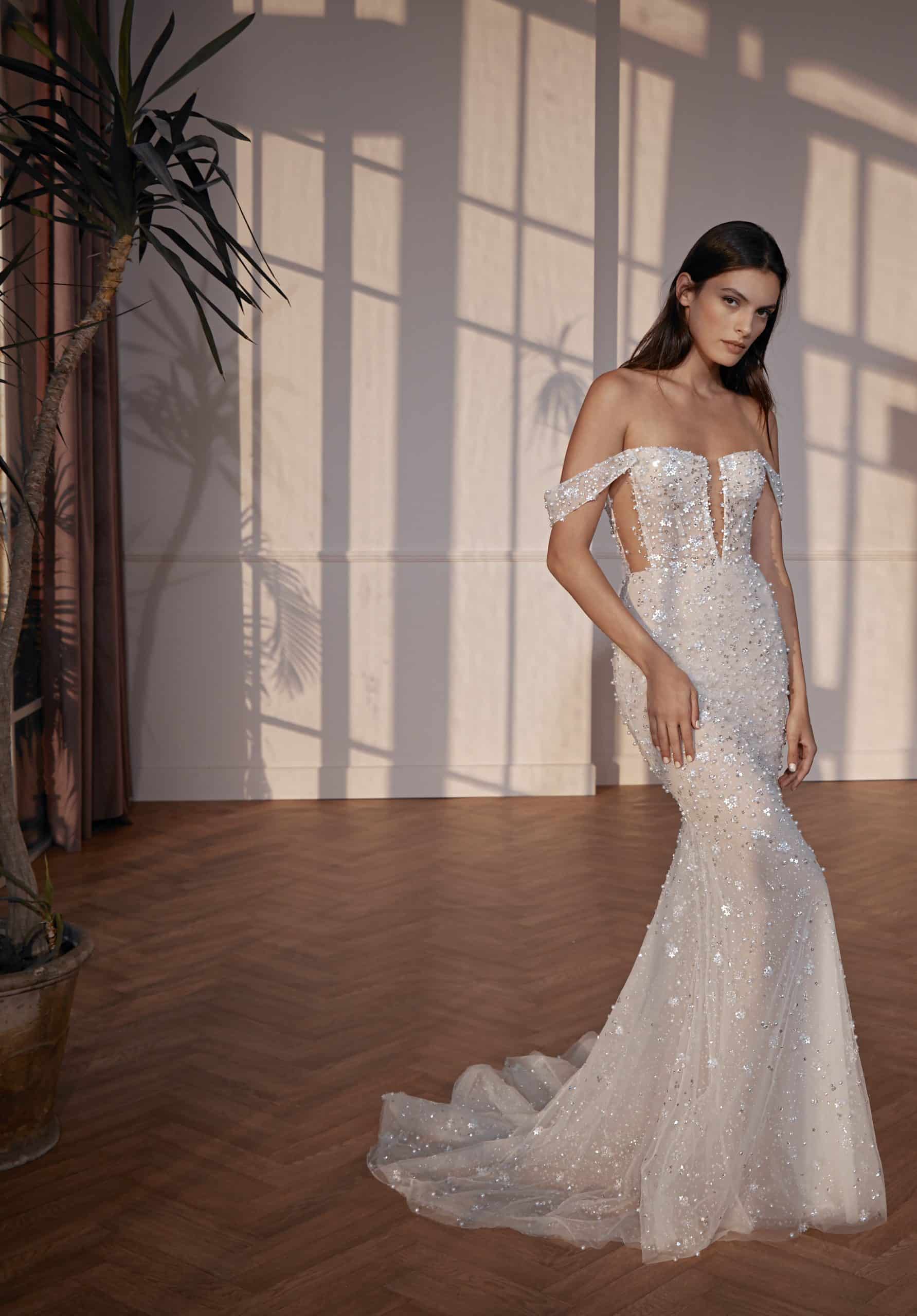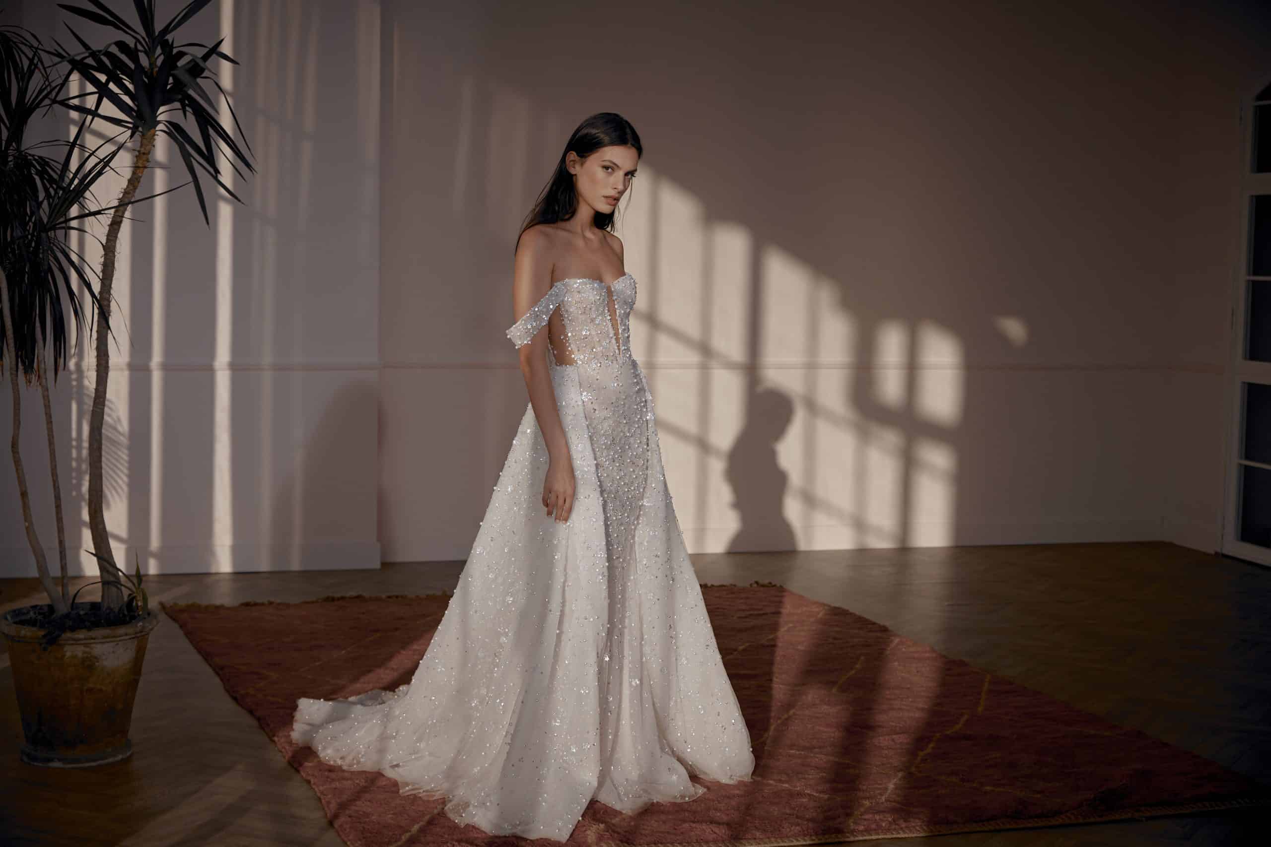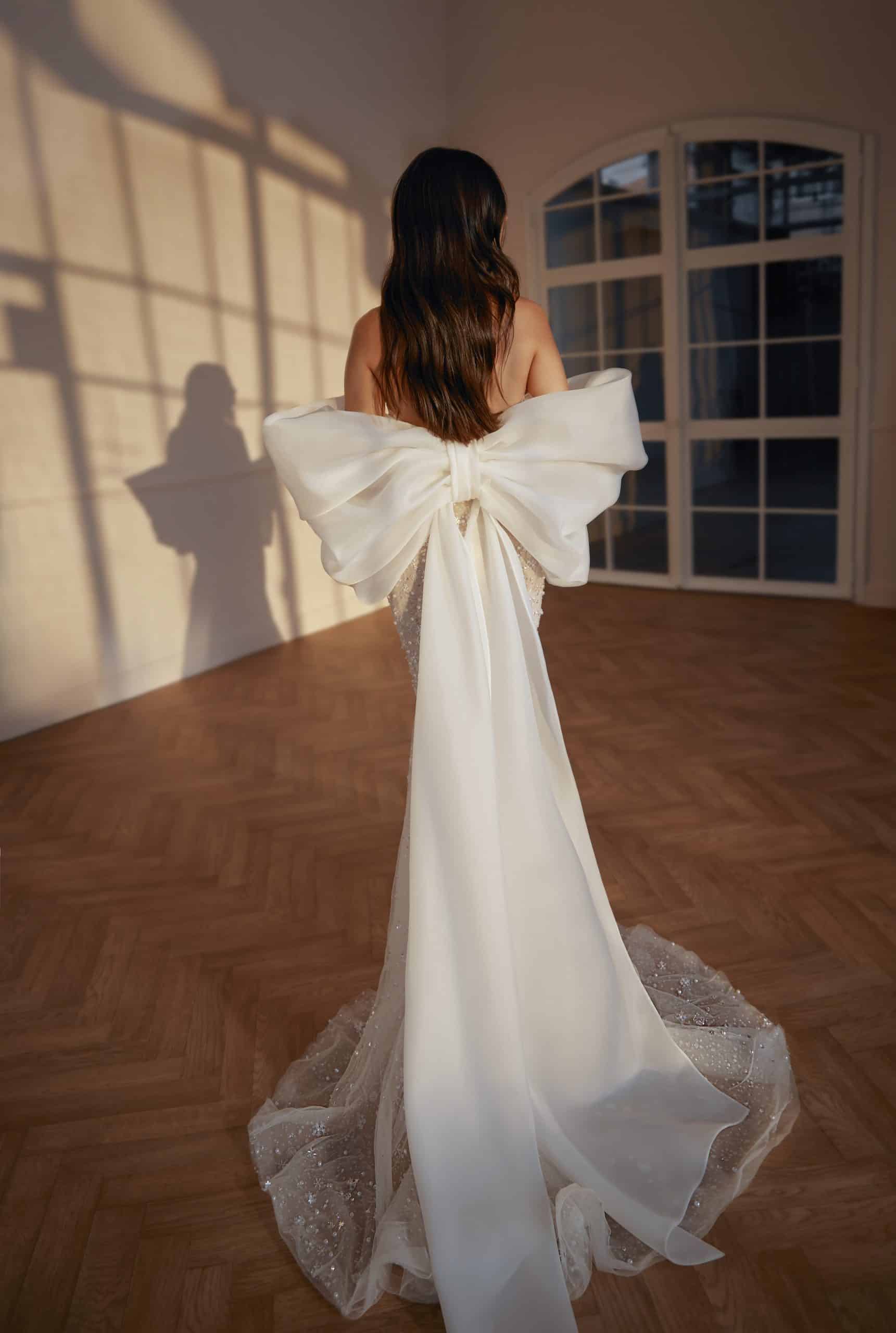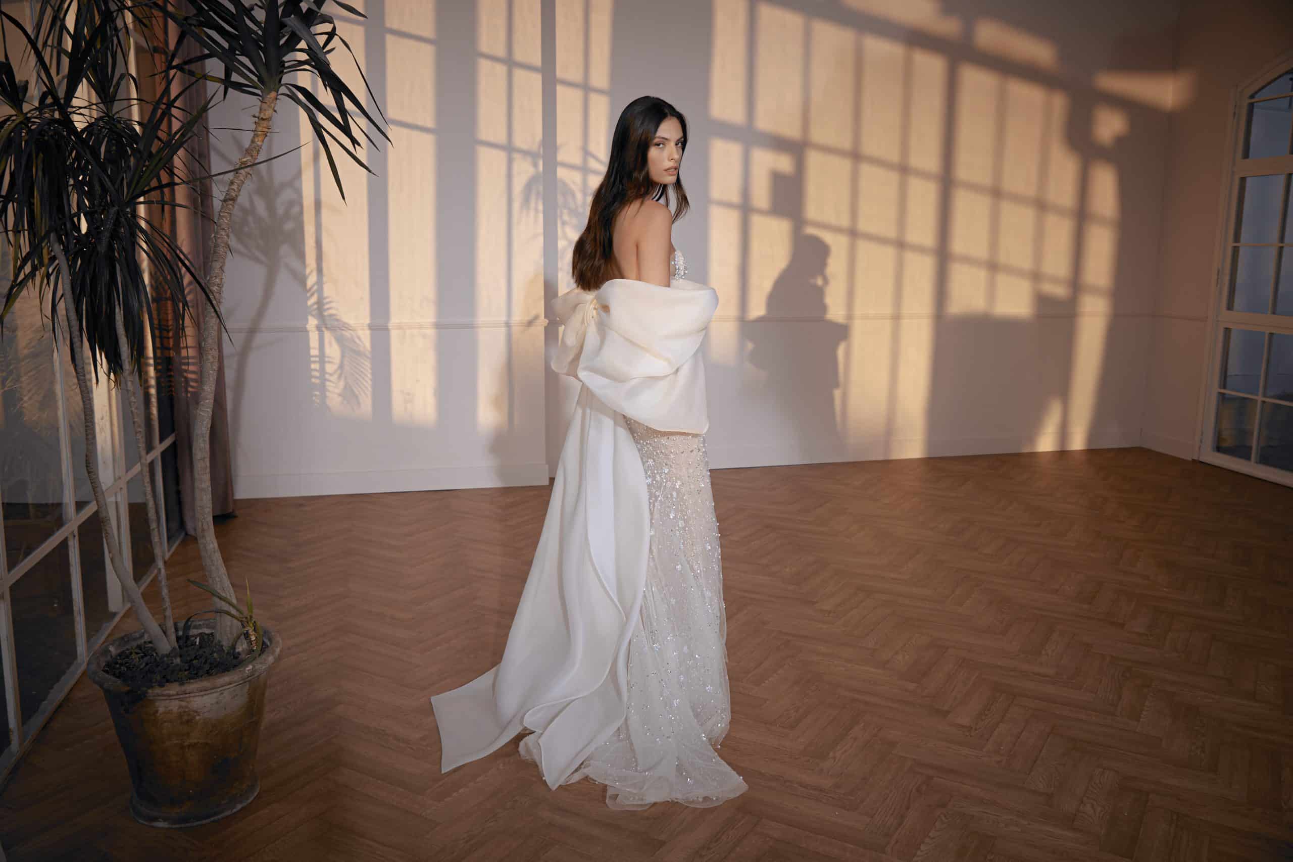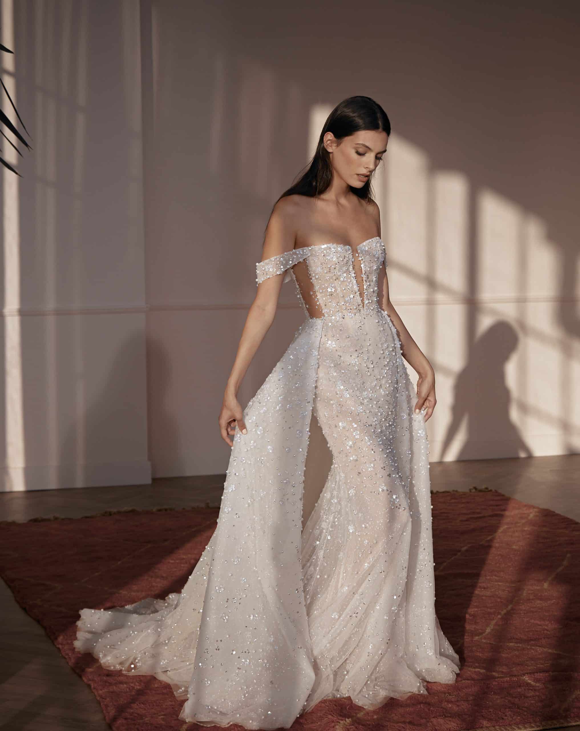 Feminine sparkly fitted gown. Features a long skirt and a sweetheart corset with semi sheer side cuts. Includes a dramatic pleated overskirt and detachable shoulder straps. Accompanied with a unique bow cape.