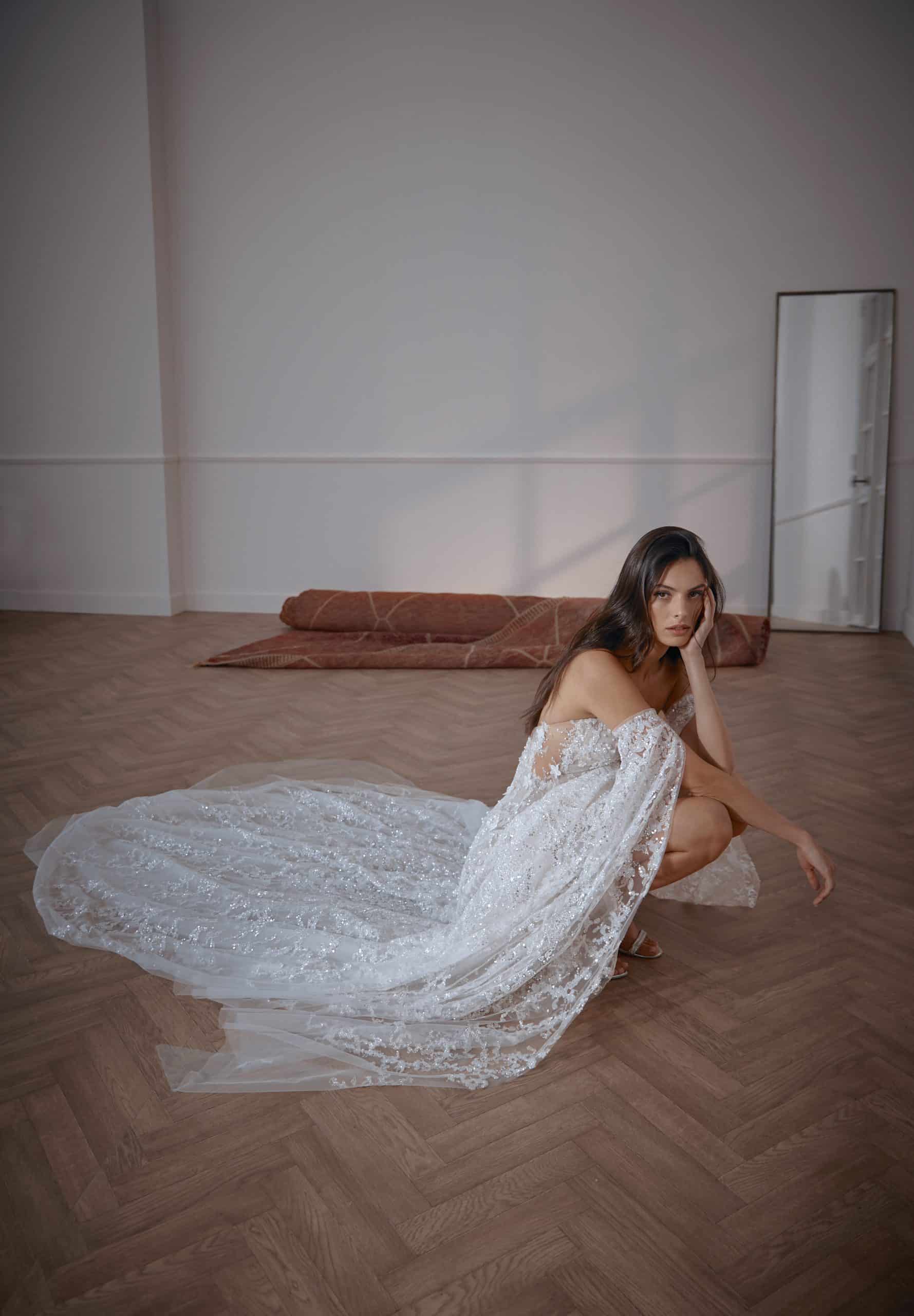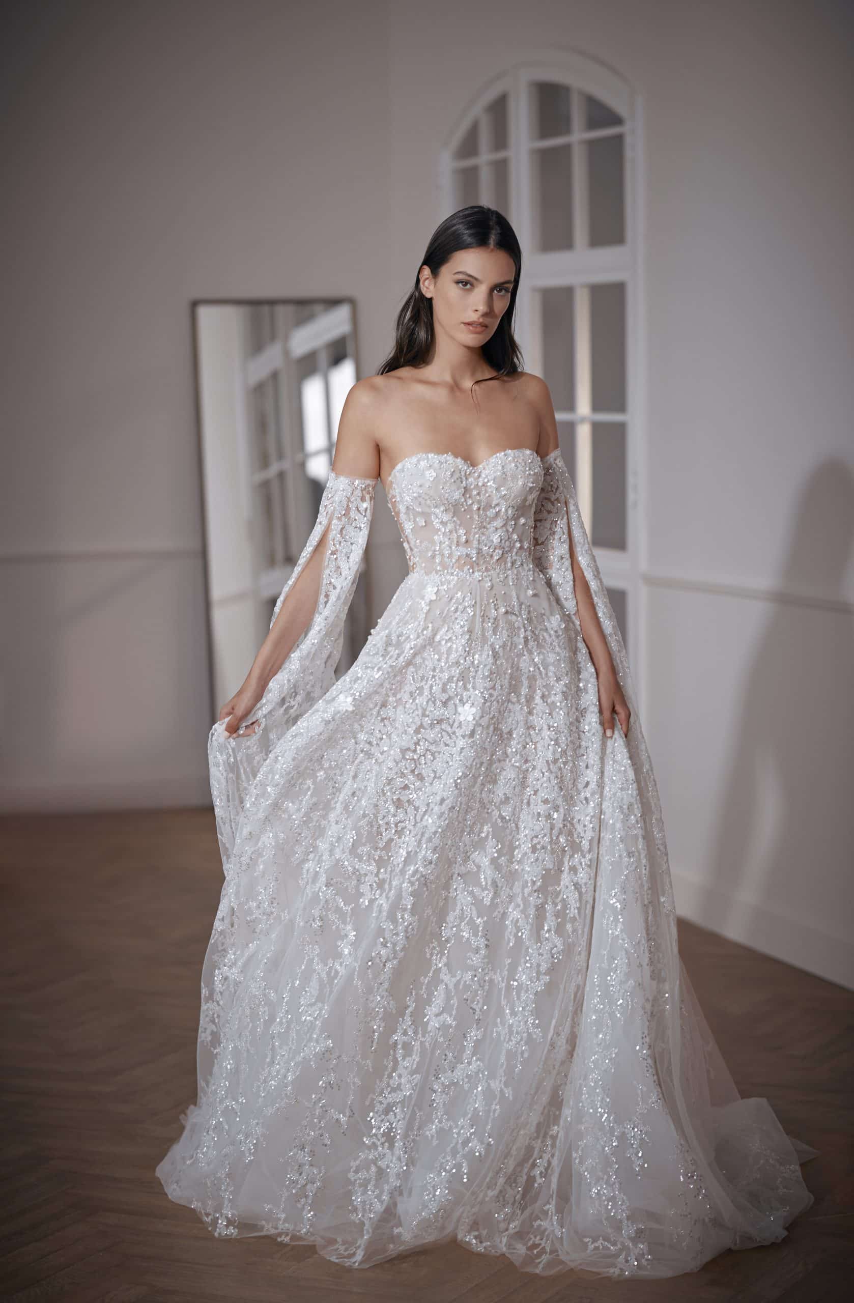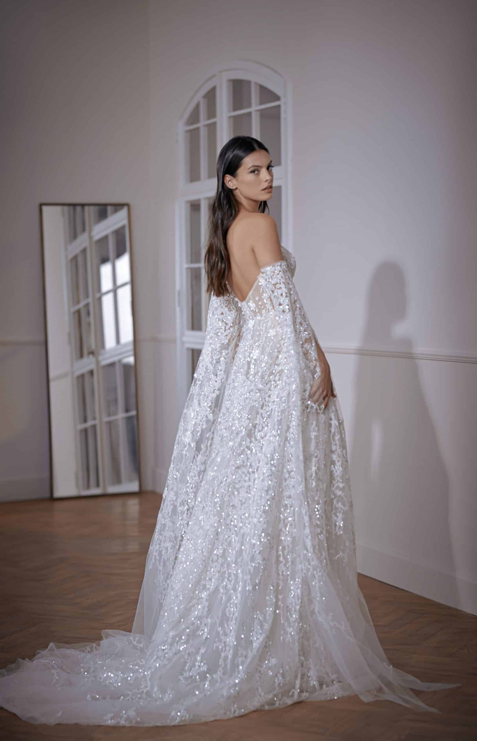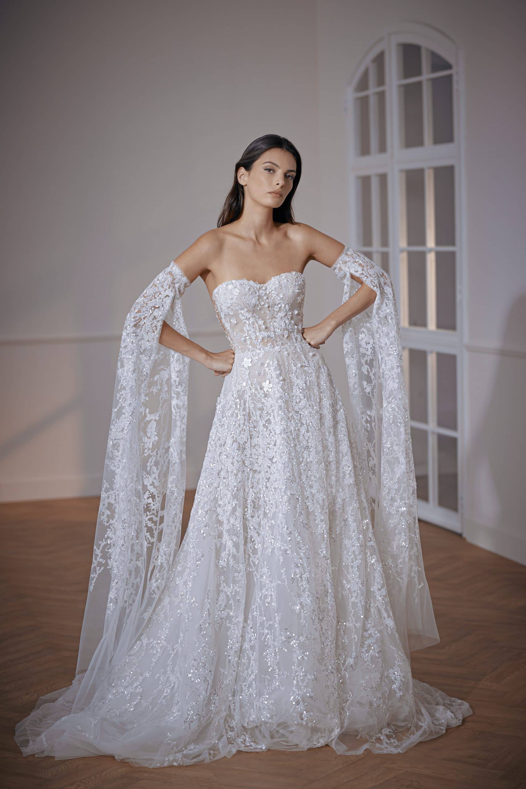 Ball gown with a sweetheart corset. Features luxurious sequins, sparkly elements degrade, and hand-made 3D flowers. Accompanied by long embellished cape sleeves.