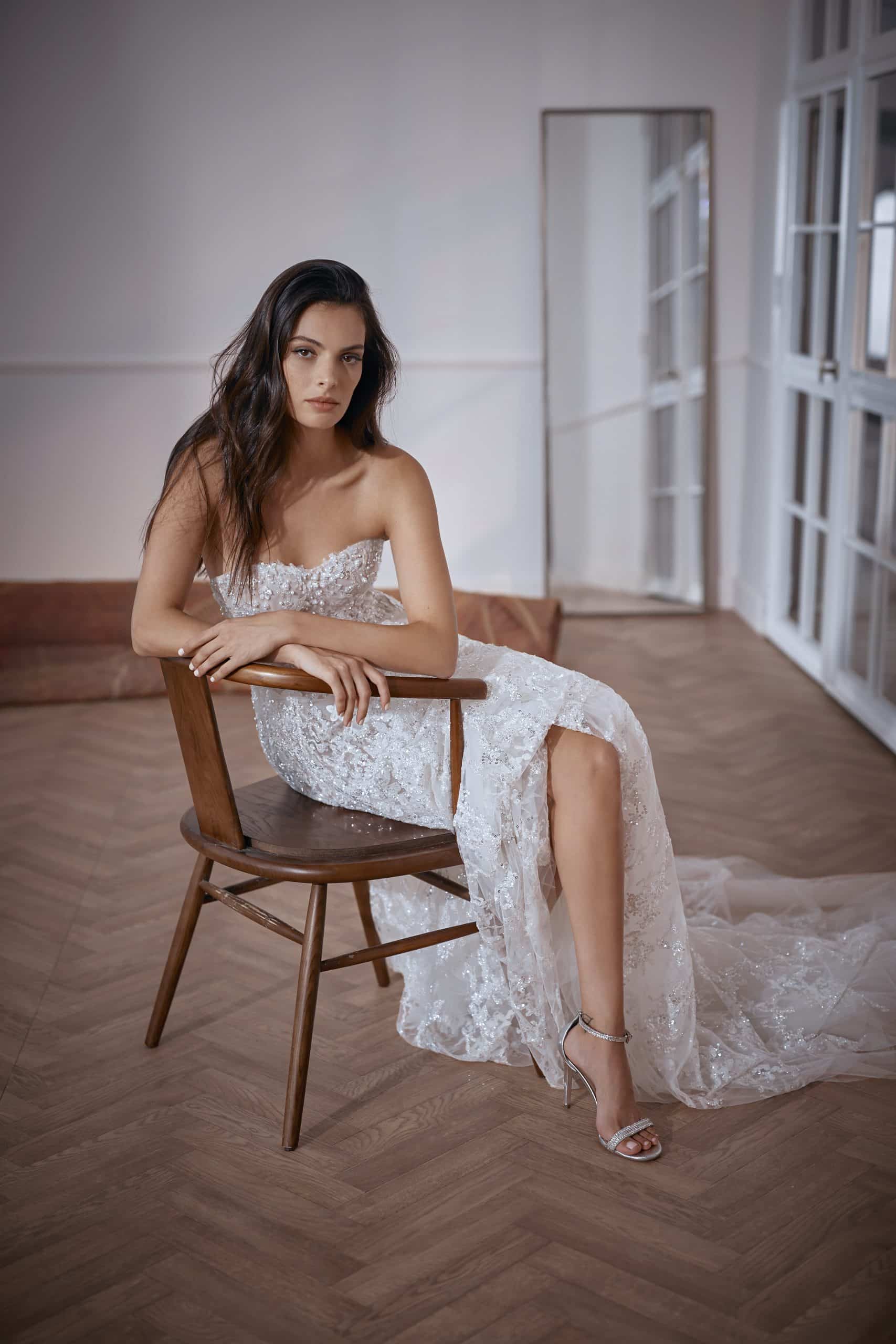 Ball gown with a sweetheart corset. Features luxurious sequins, sparkly elements degrade, and hand-made 3D flowers. Accompanied by long embellished cape sleeves.