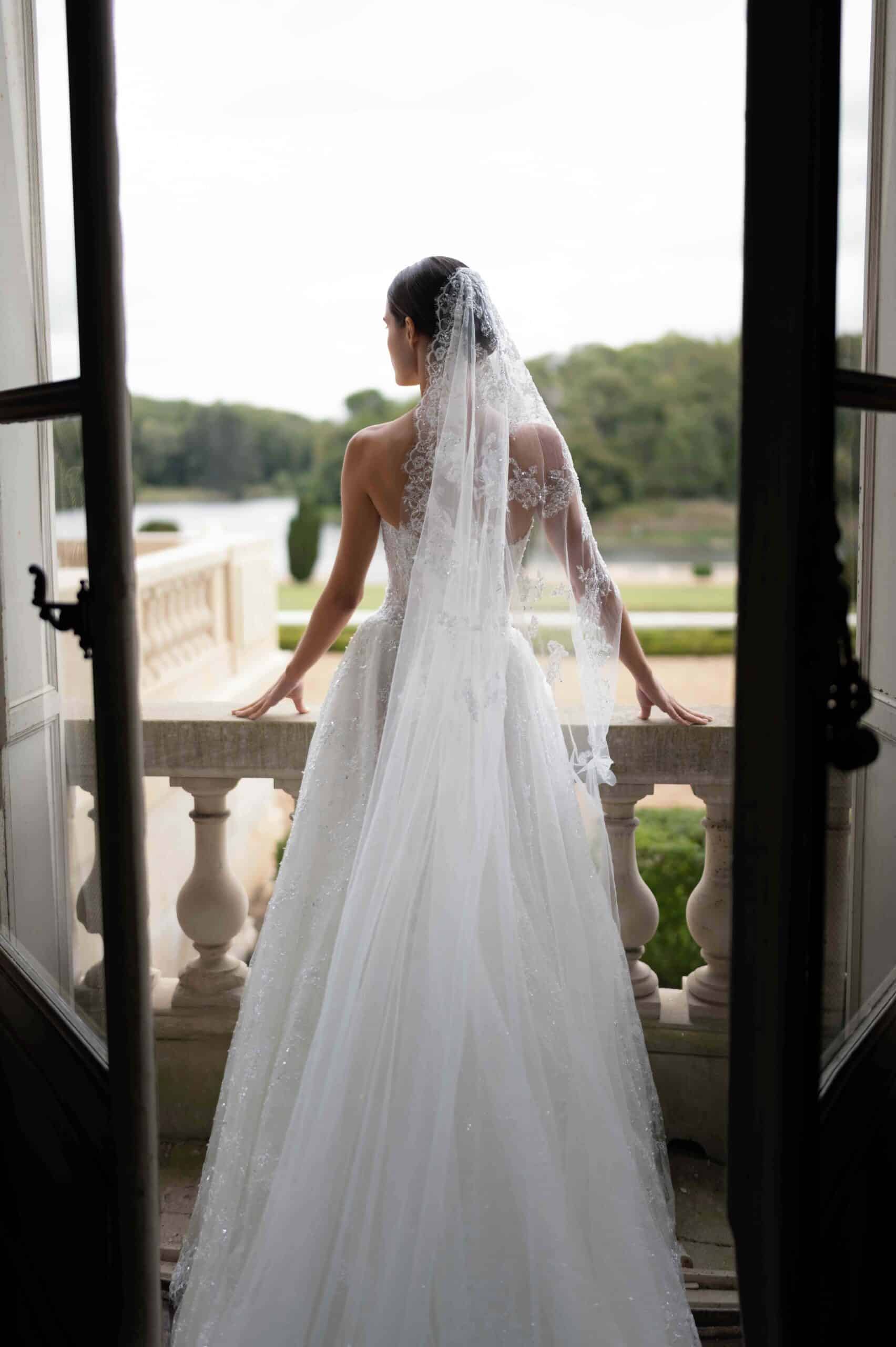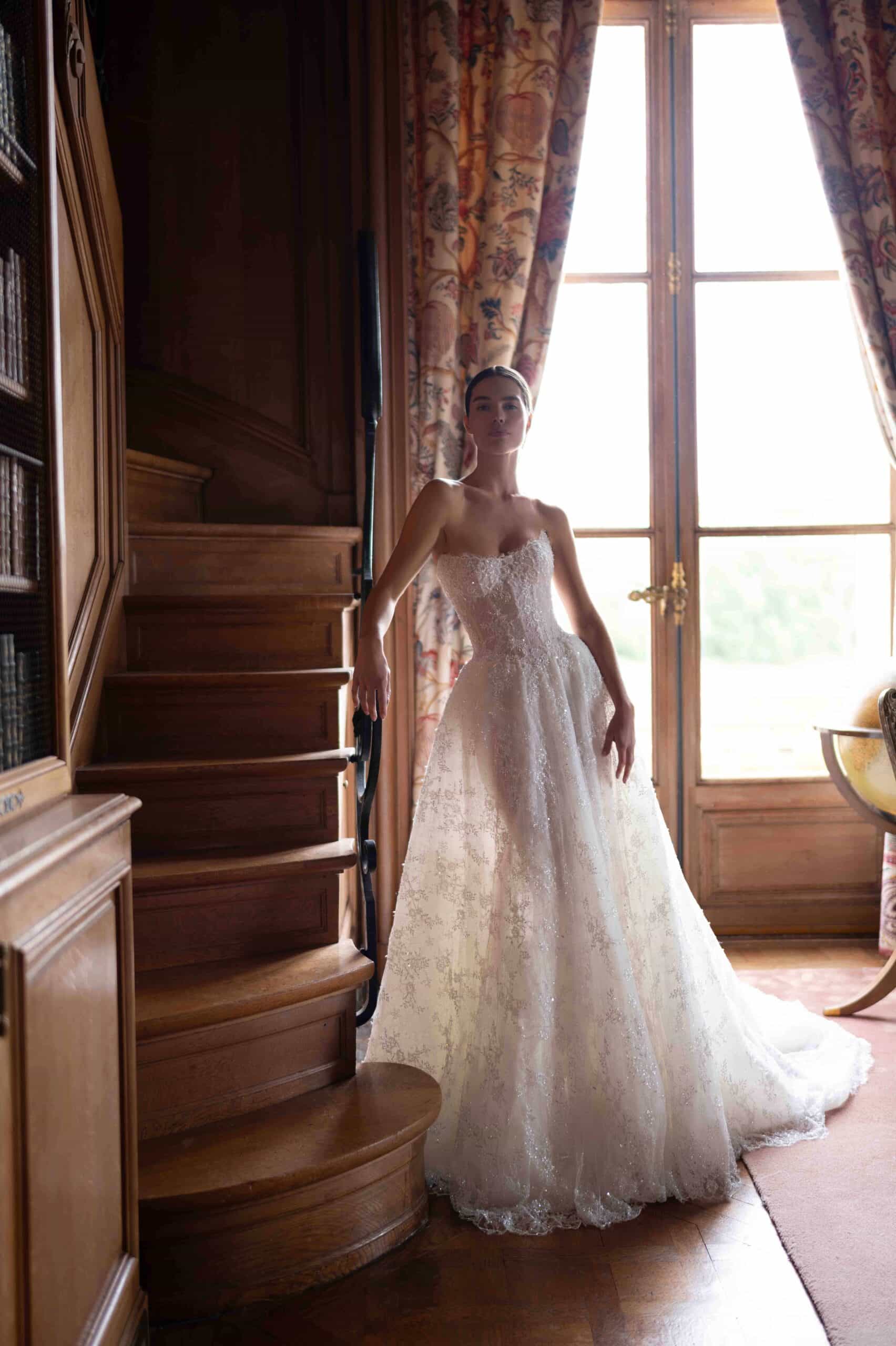 A strapless princess gown with a soft Basque waistline and shimmering curated details, crafted from hand-embroidered tulle adorned with delicate crystals. Paired with a matching veil for an effortlessly romantic look.
