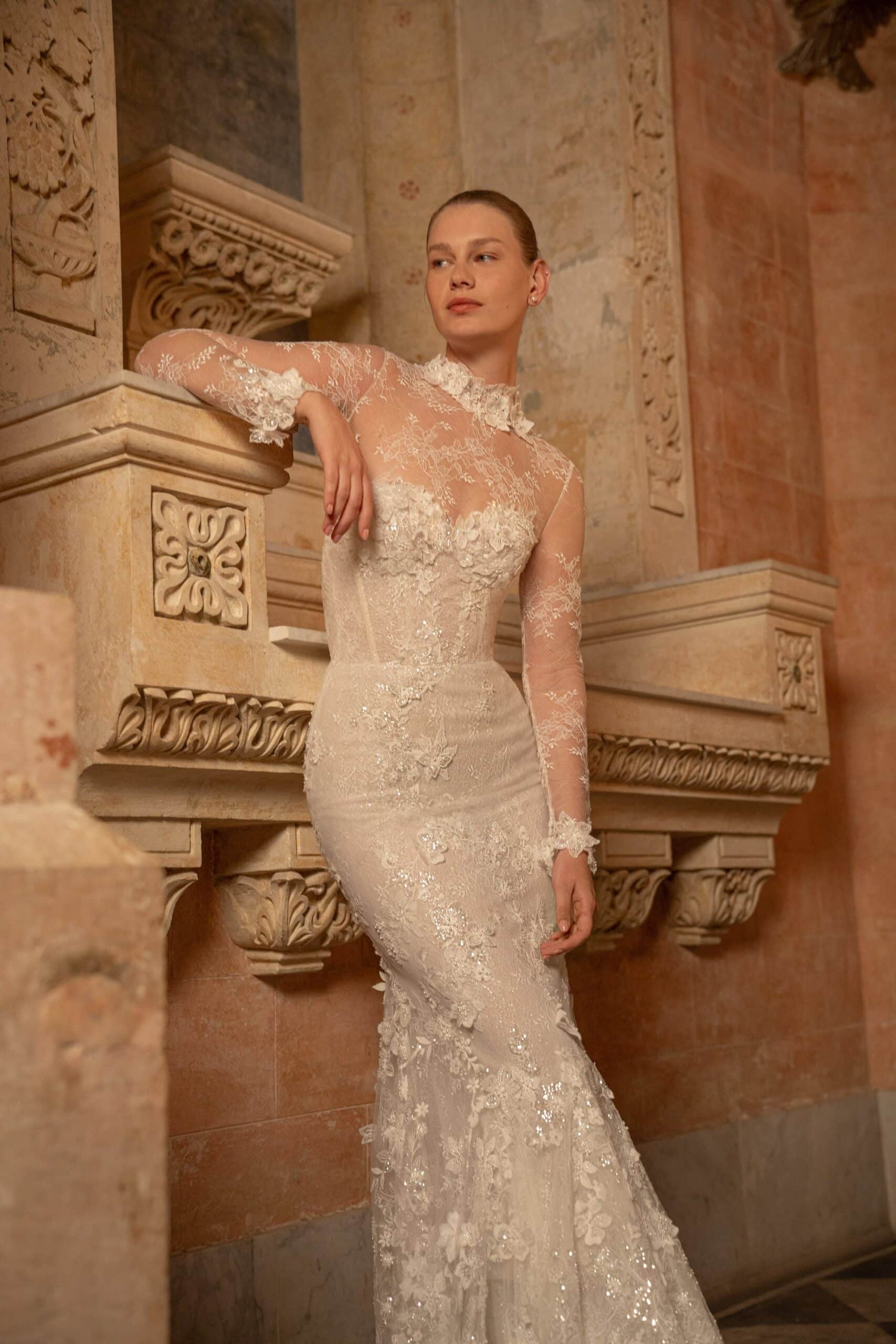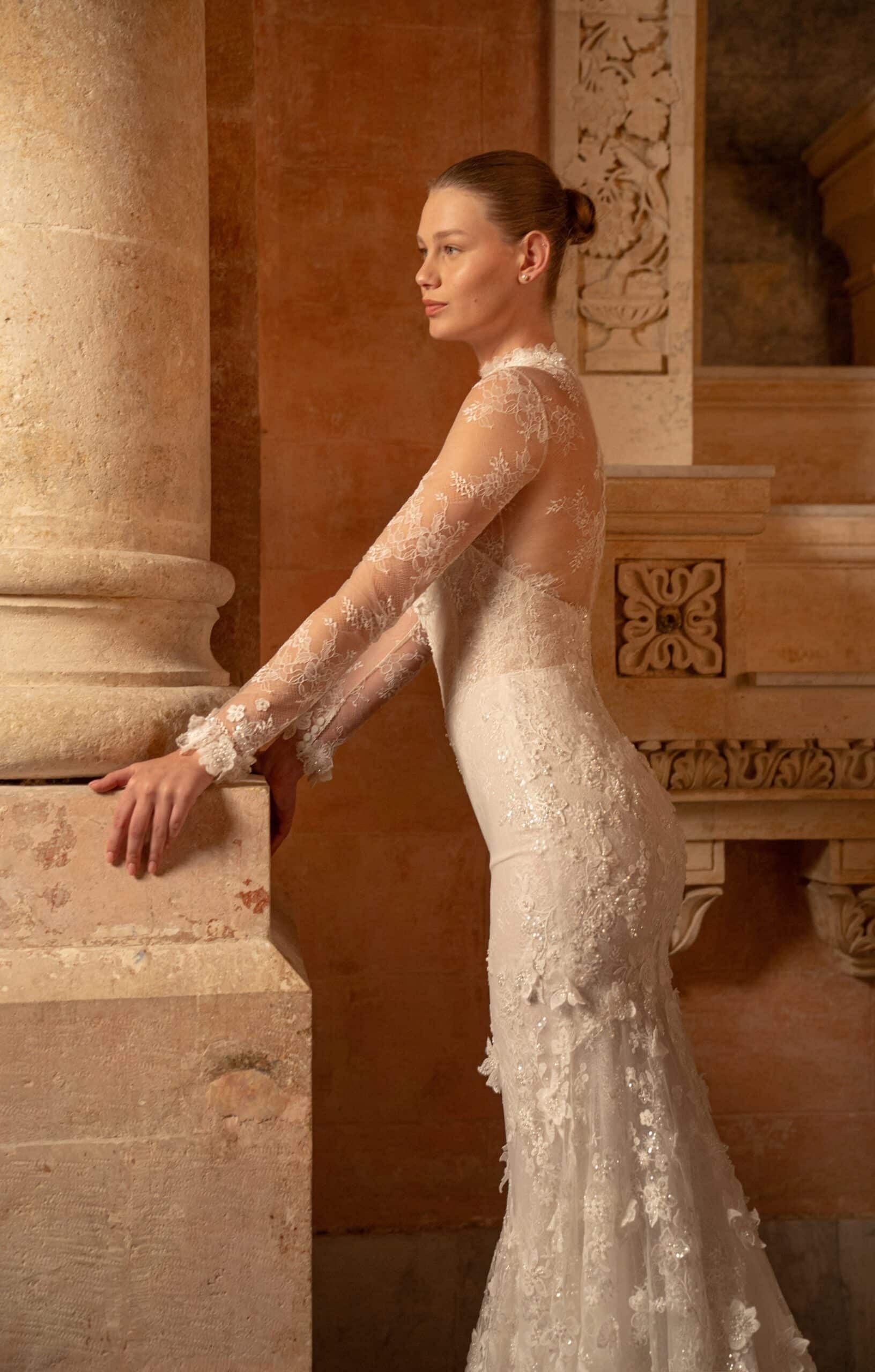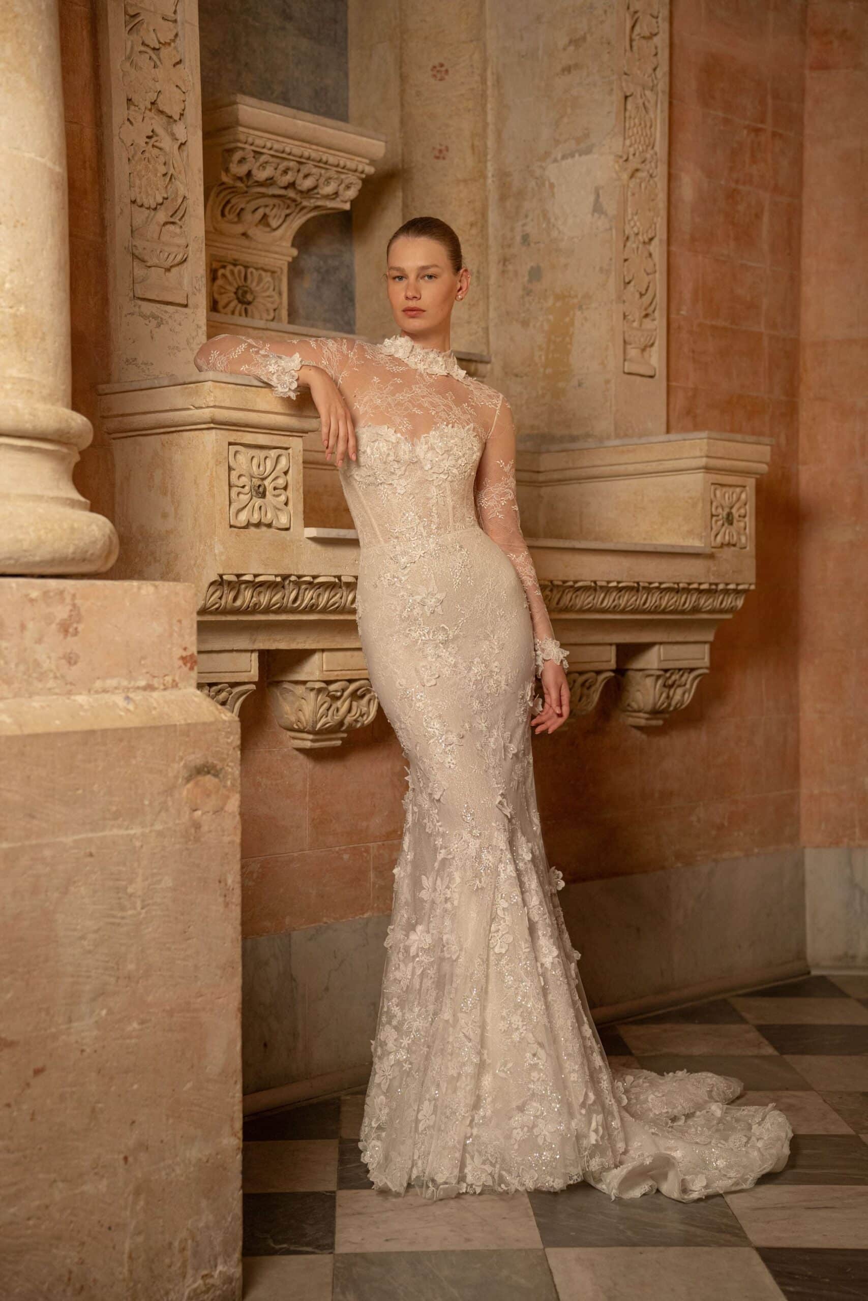 A mermaid gown featuring a sweetheart corset adorned with opulent 3D flowers and leaf appliqués, accompanied by a long train. Paired with a detachable bodysuit crafted from French lace for added versatility.