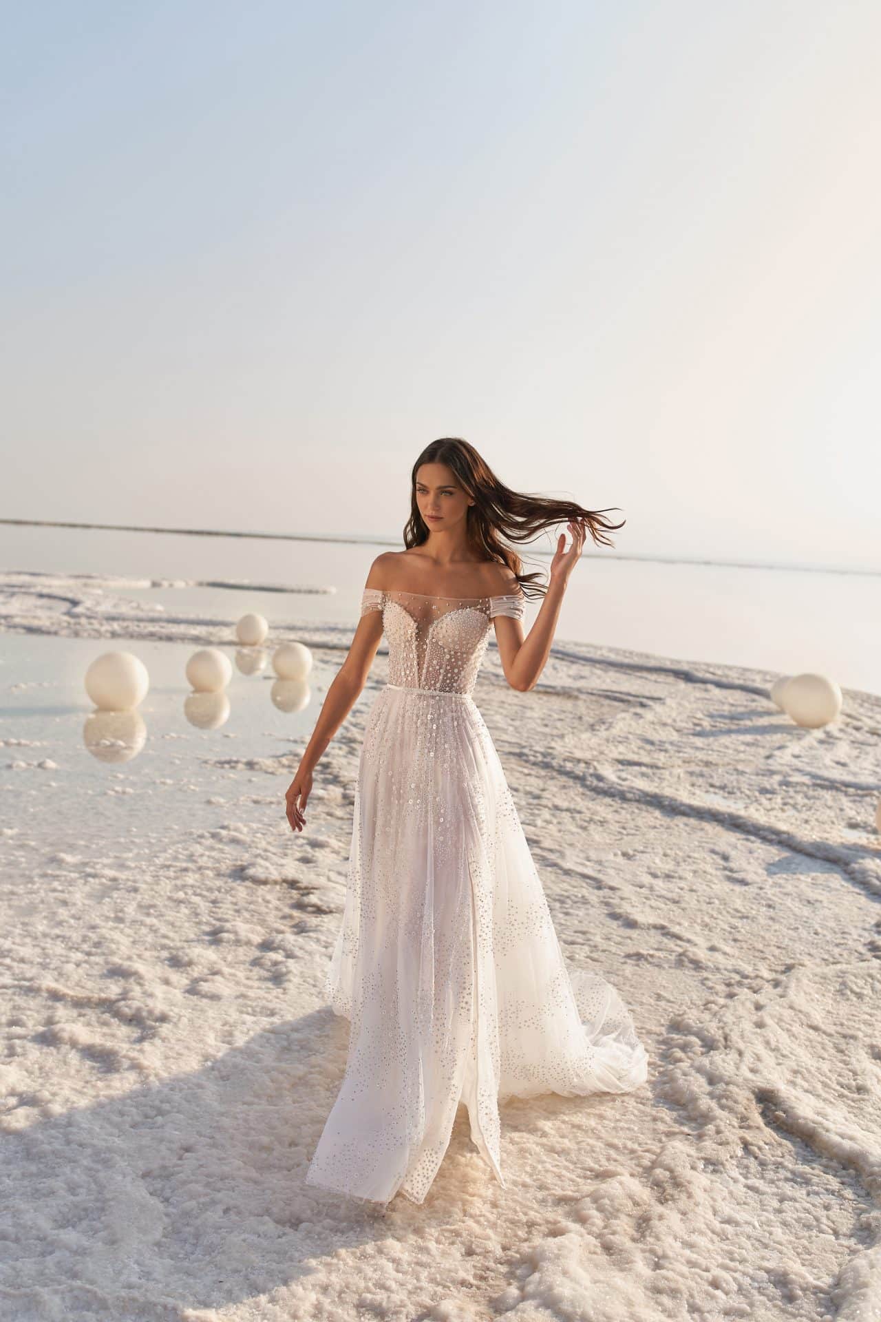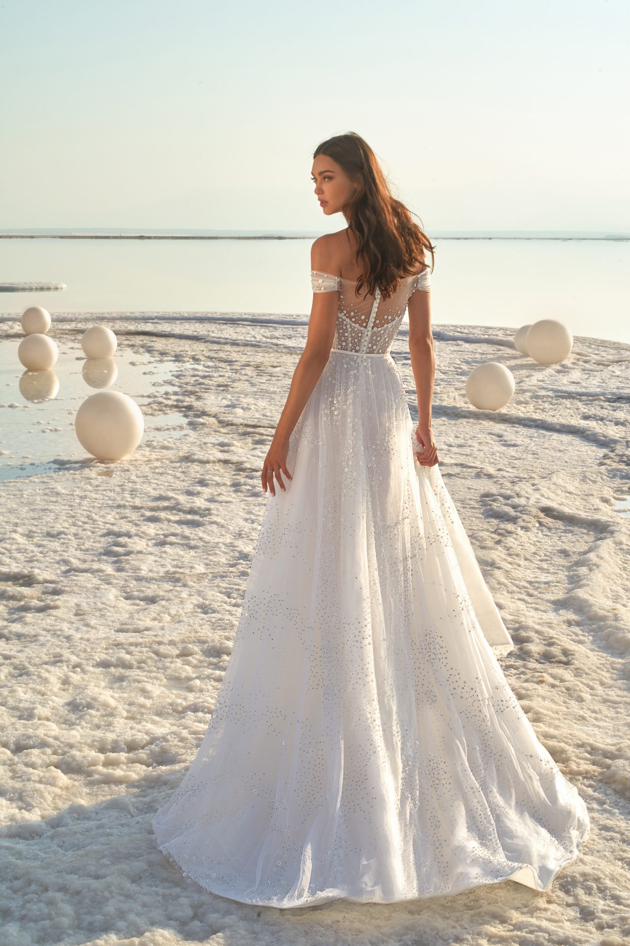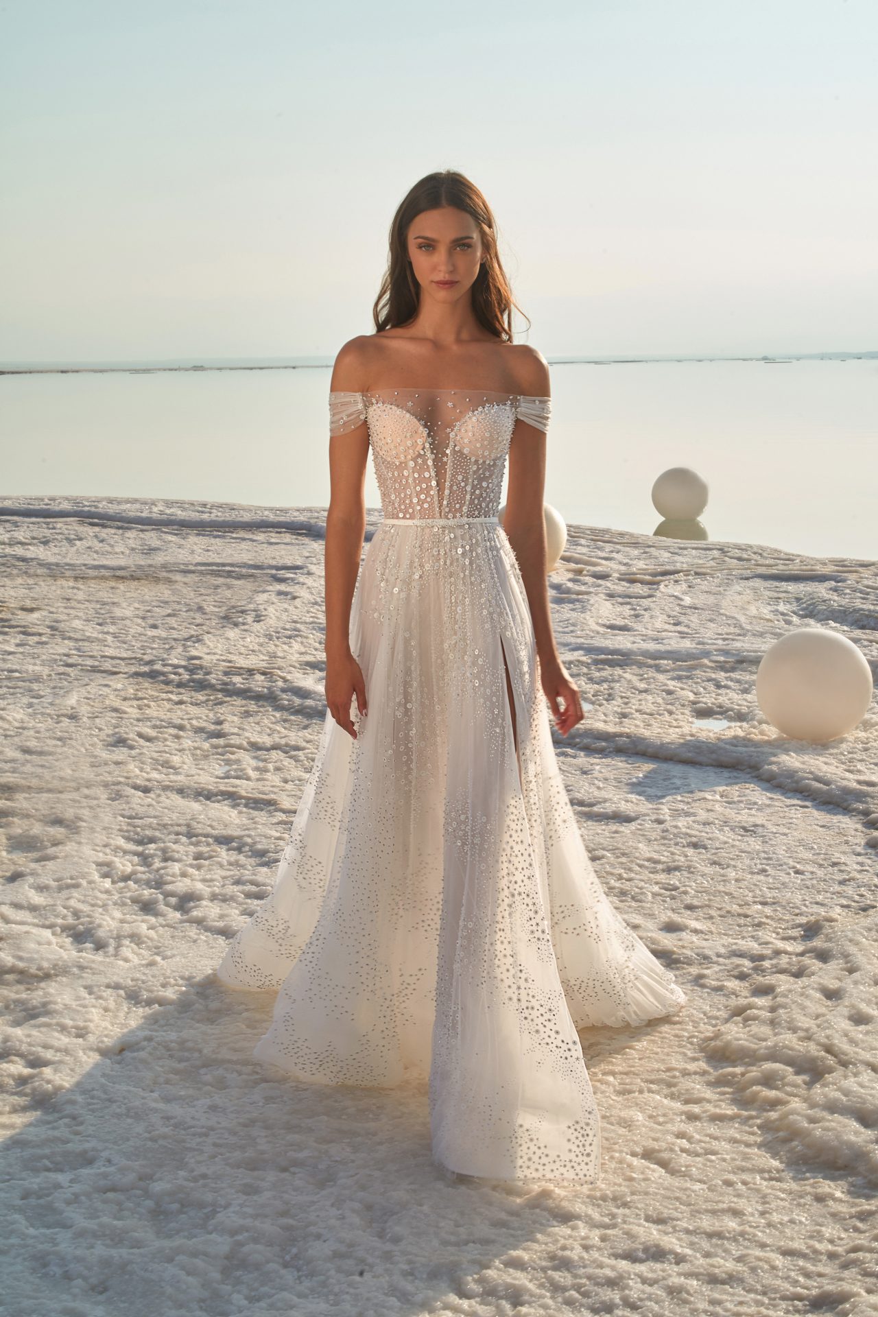 Beaded A-line off-the-shoulder gown with corset and beaded illusion tulle