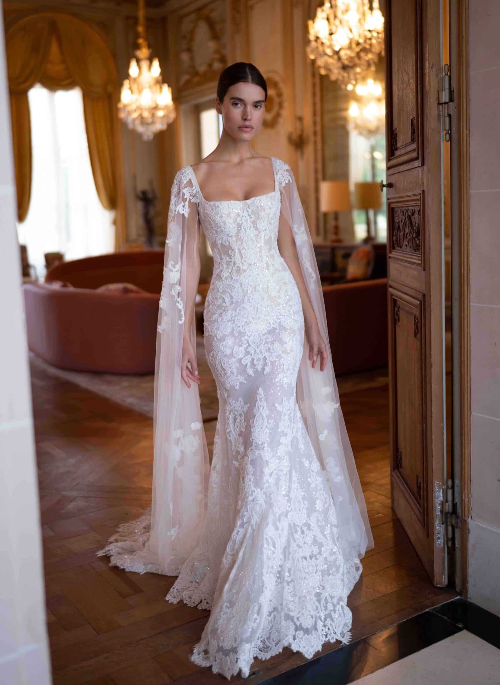A fitted mermaid gown crafted from luxurious light lace, featuring a square neckline, delicate thin straps, and a low back. The look is completed with matching detachable cape sleeves for a graceful finish.