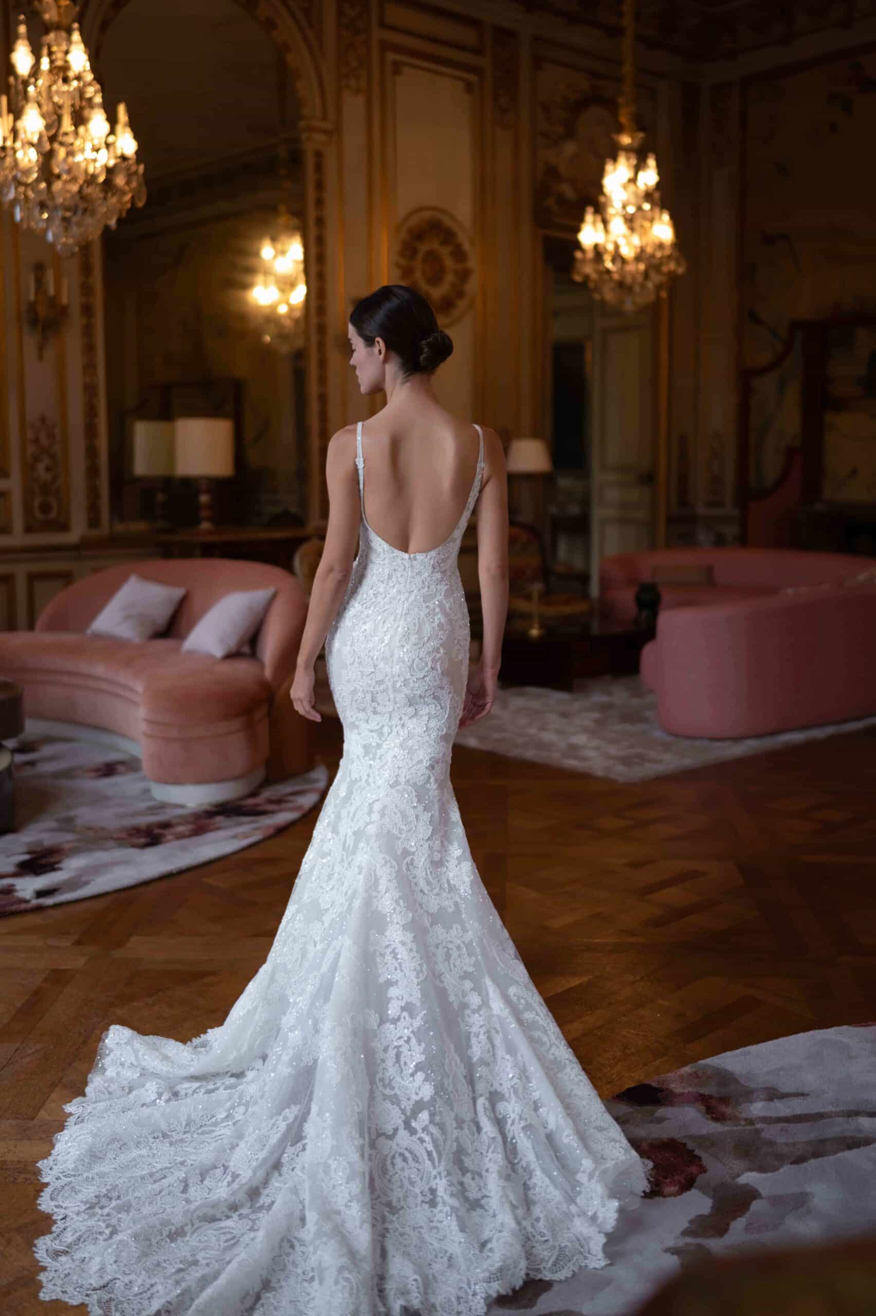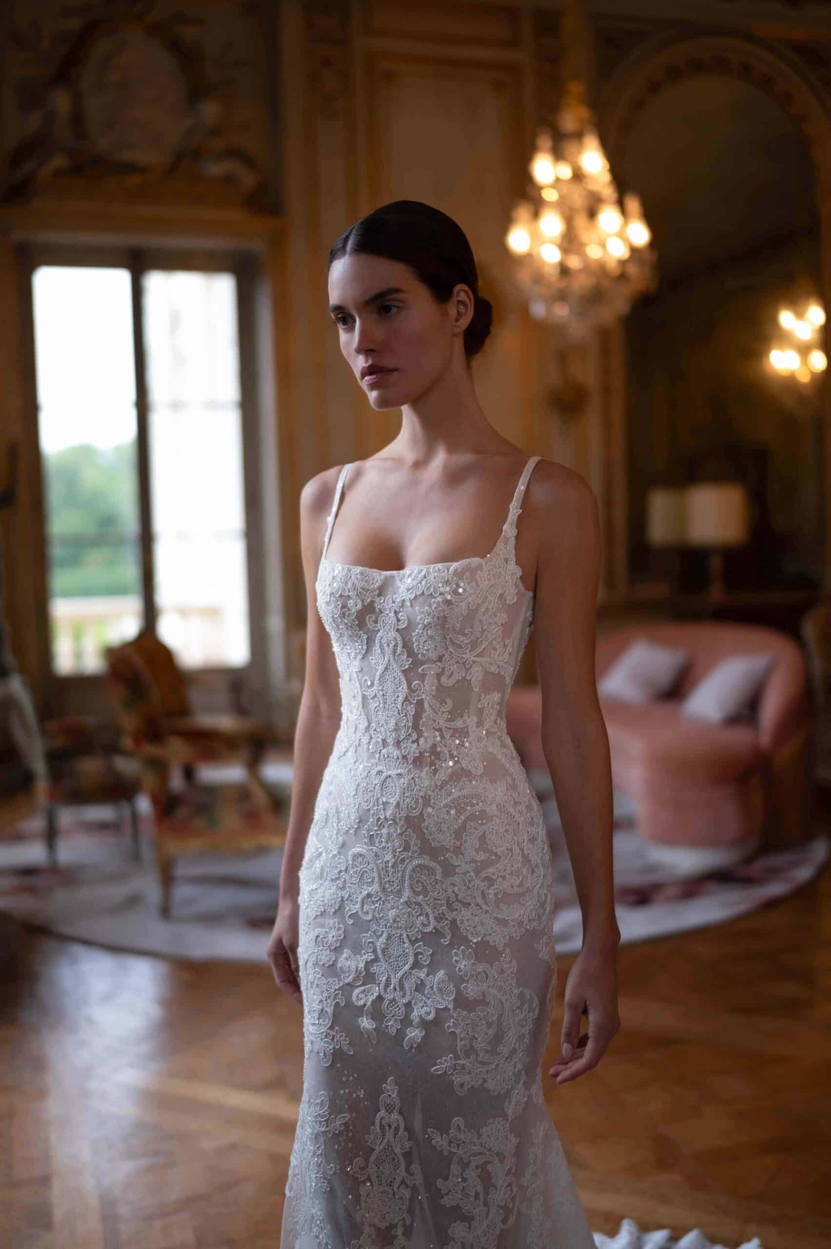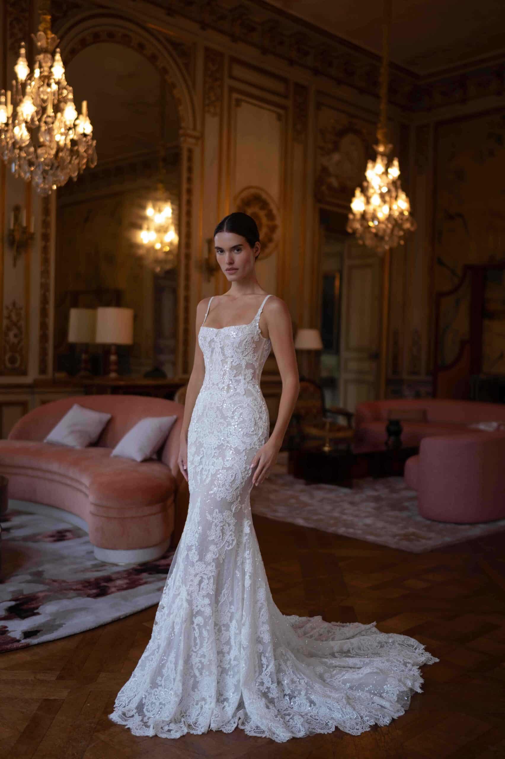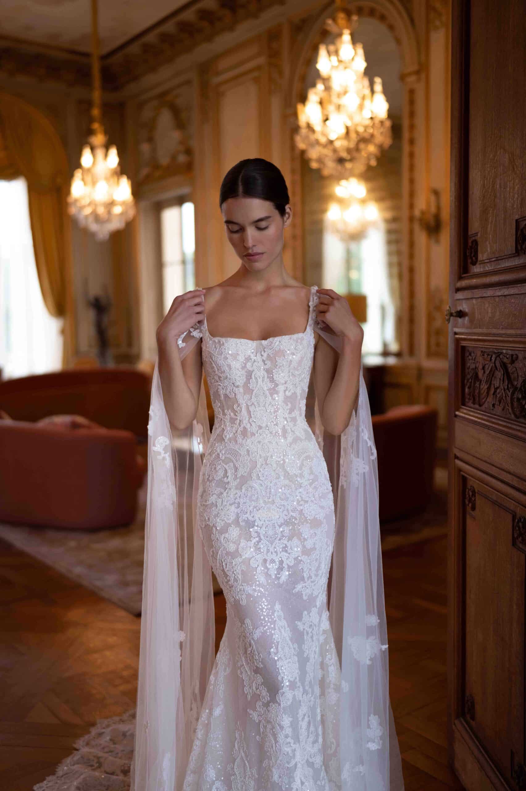 A fitted mermaid gown crafted from luxurious light lace, featuring a square neckline, delicate thin straps, and a low back. The look is completed with matching detachable cape sleeves for a graceful finish.