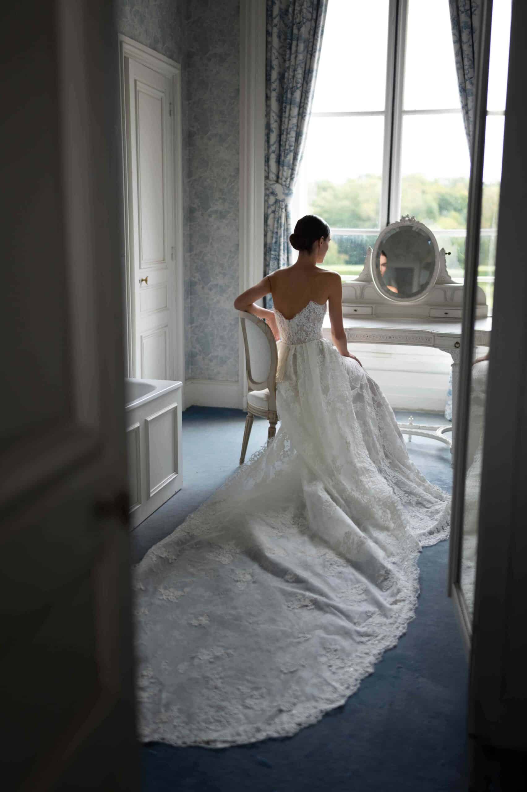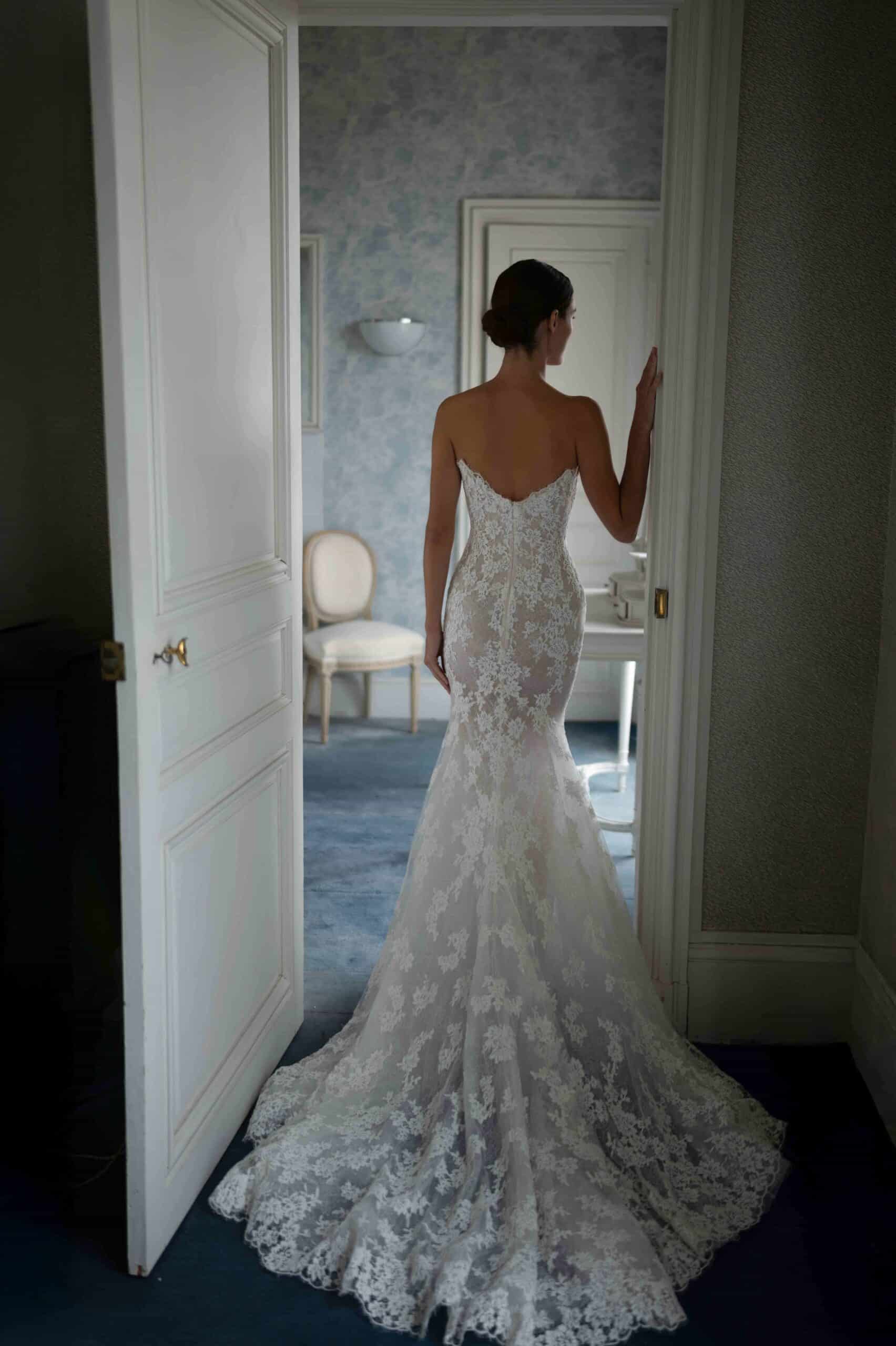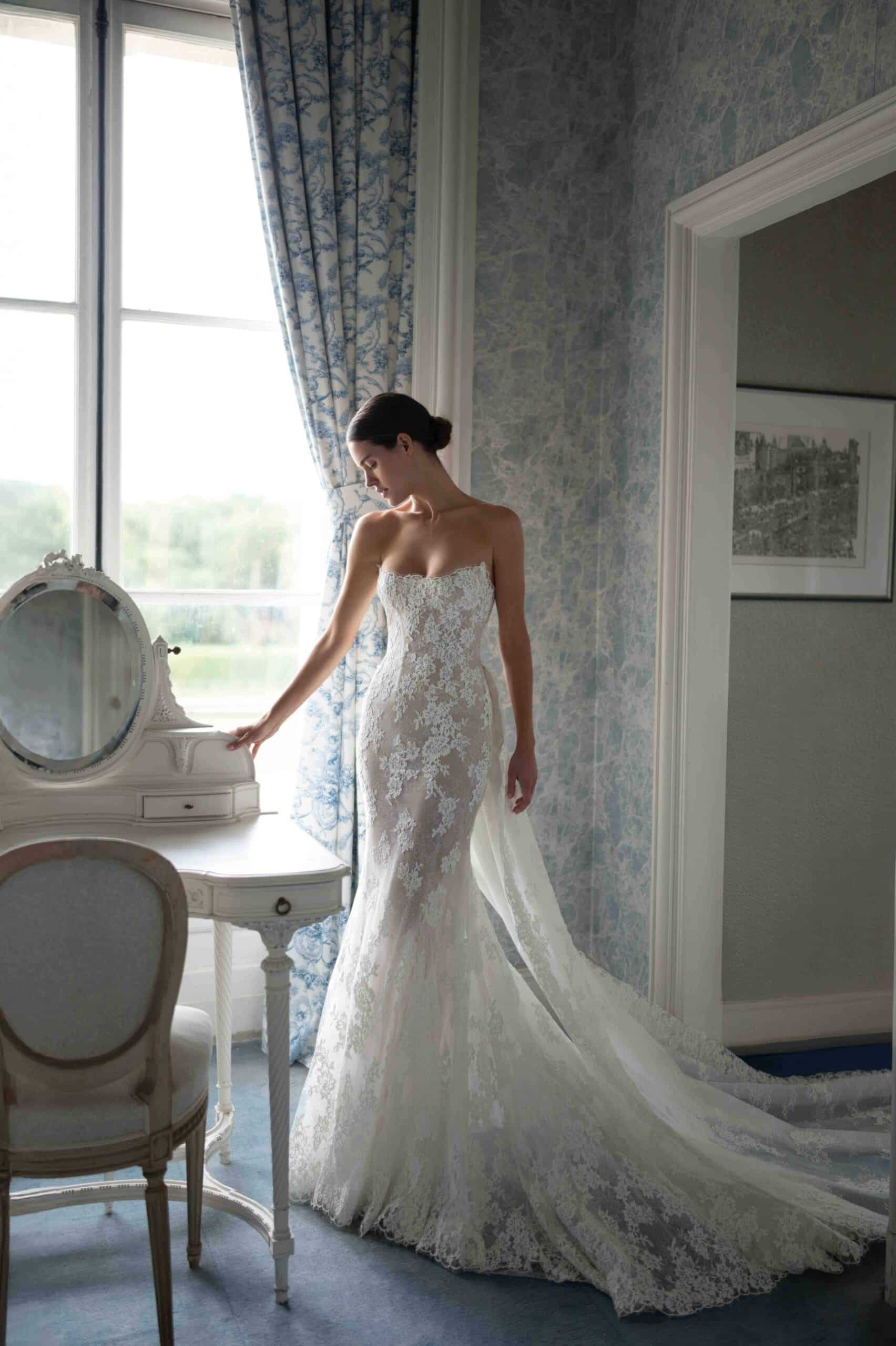 A strapless fitted mermaid gown crafted from intricate Italian lace. Accompanied by a detachable back overskirt and a veil that create a graceful depth and fluid motion.