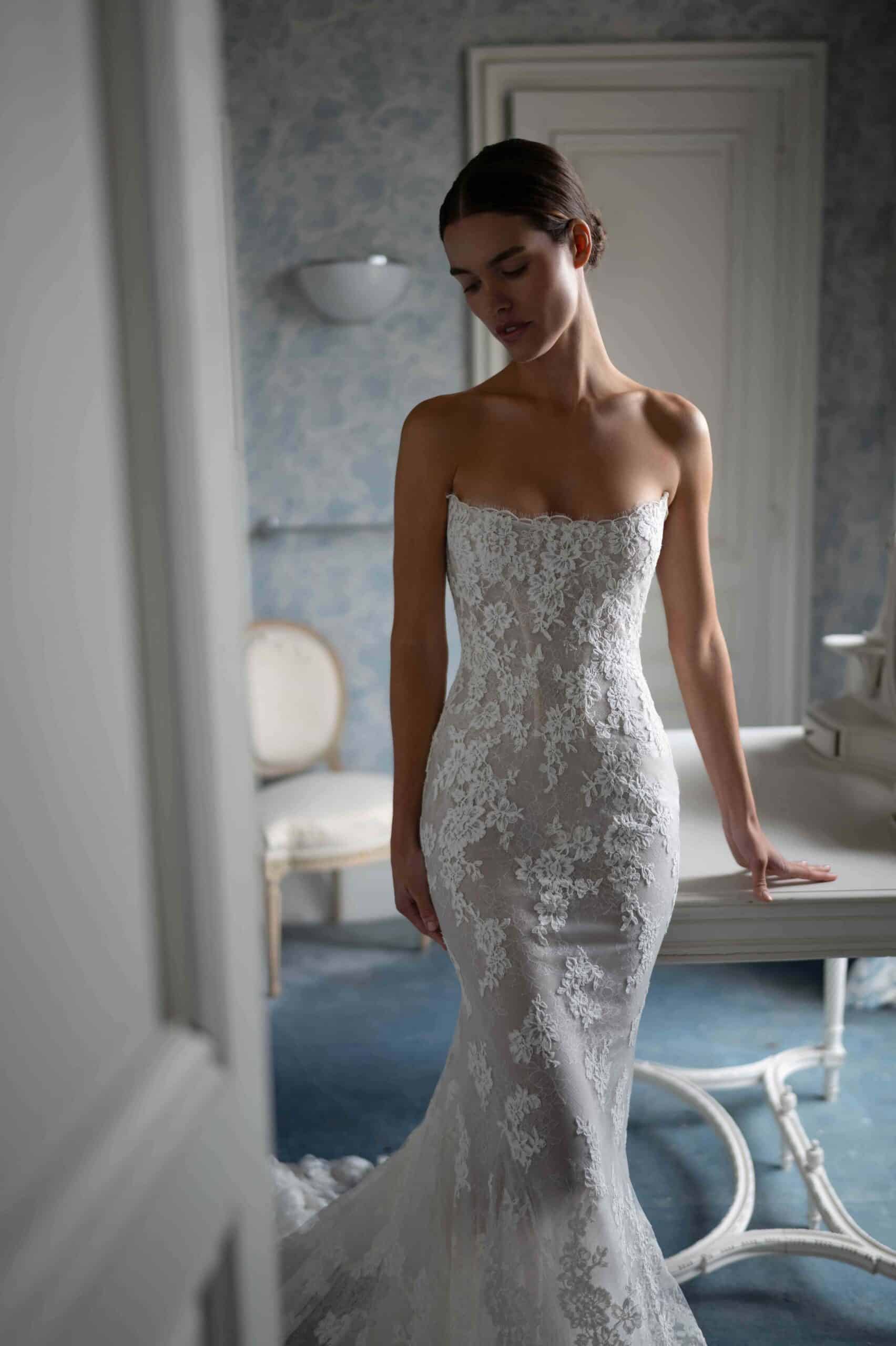 A strapless fitted mermaid gown crafted from intricate Italian lace. Accompanied by a detachable back overskirt and a veil that create a graceful depth and fluid motion.
