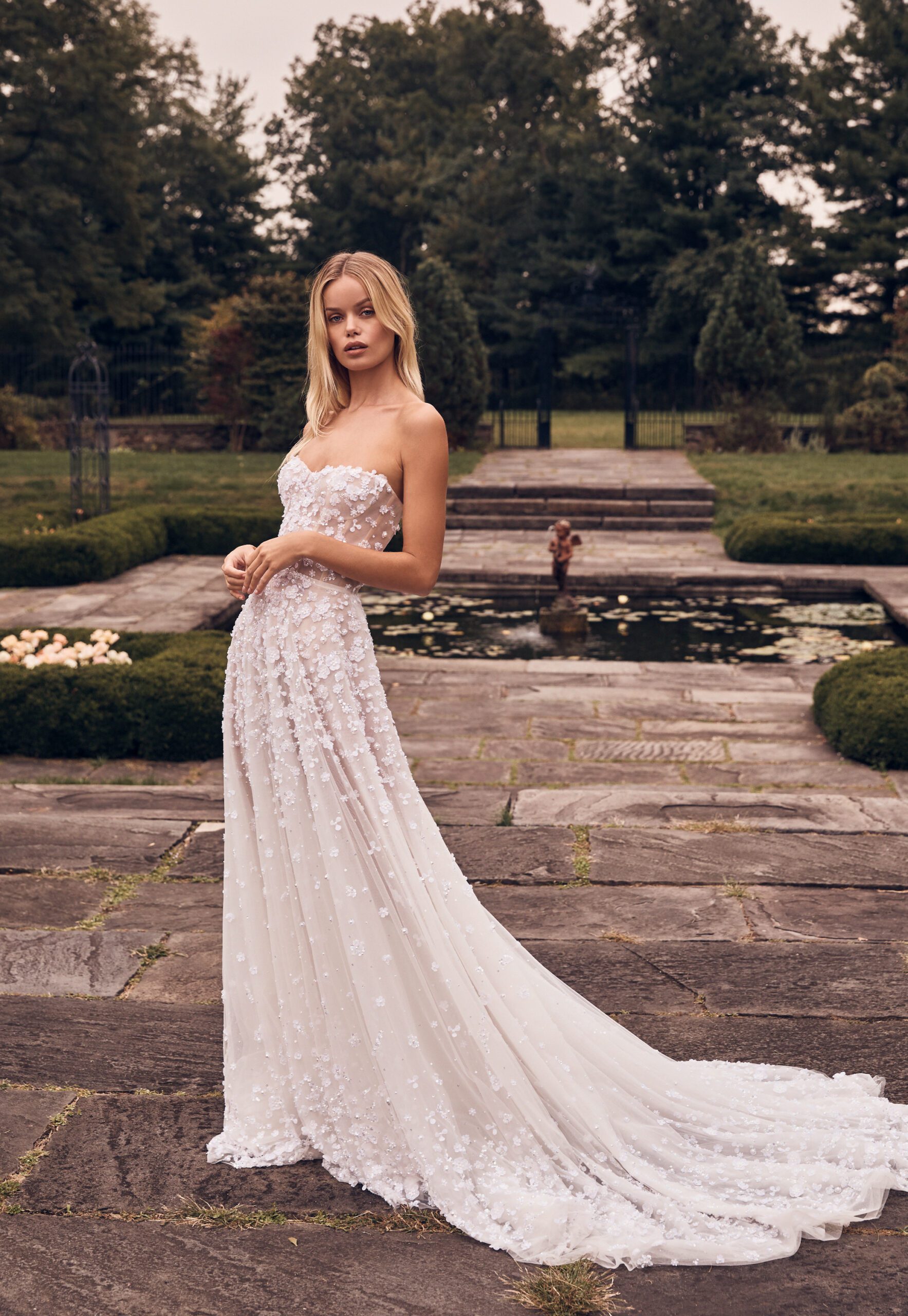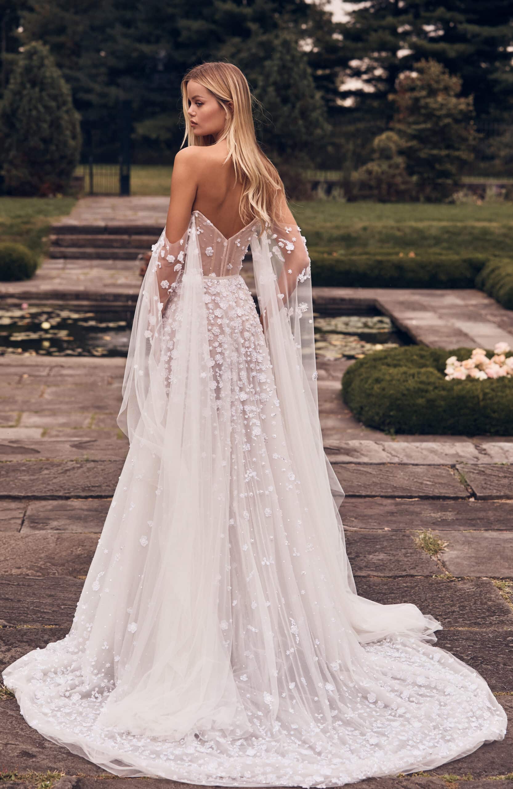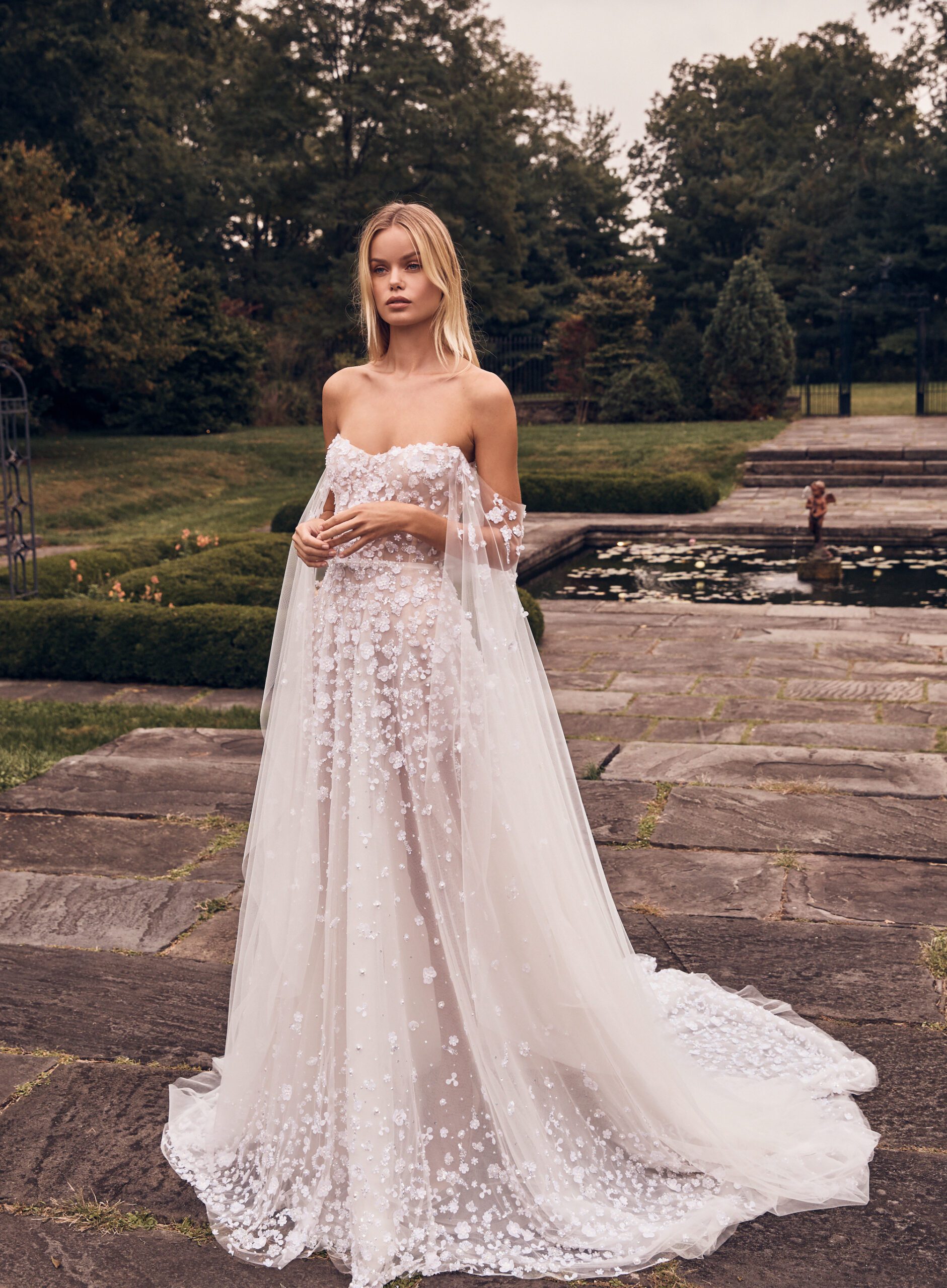 A-line gown featuring a delicate sweetheart corset and a sophisticated beaded degrade. Accompanied by a lightly embellished of-the-shoulder cape.