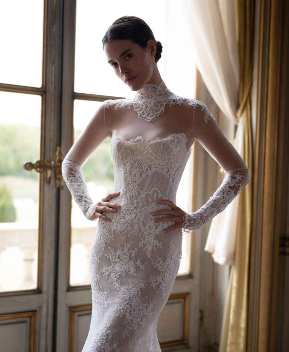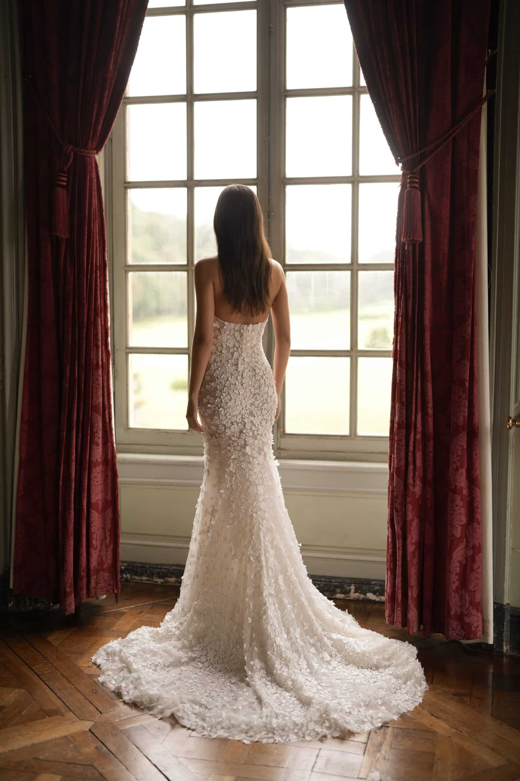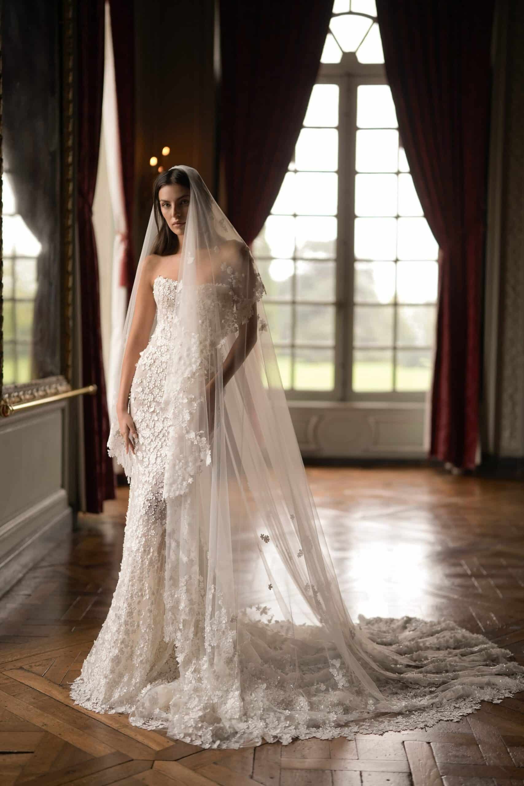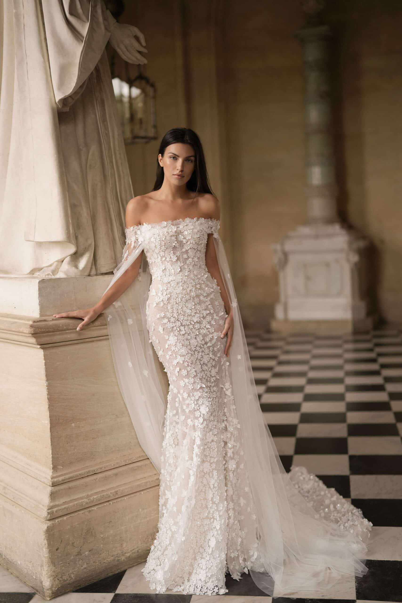 A mermaid gown with a straight neckline adorned with intricate flower motifs, complete with a coordinating cape and veil for an exquisite ensemble.