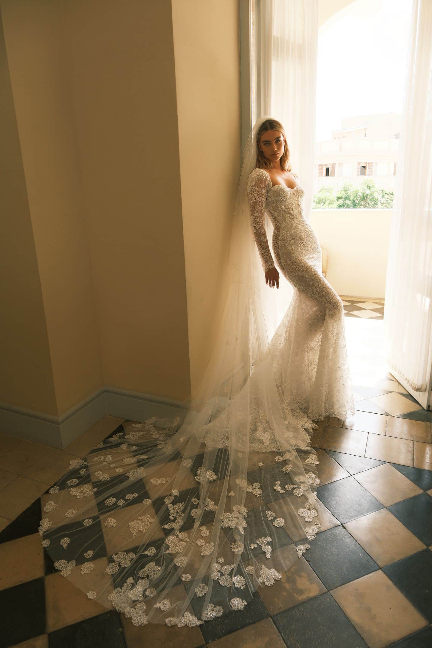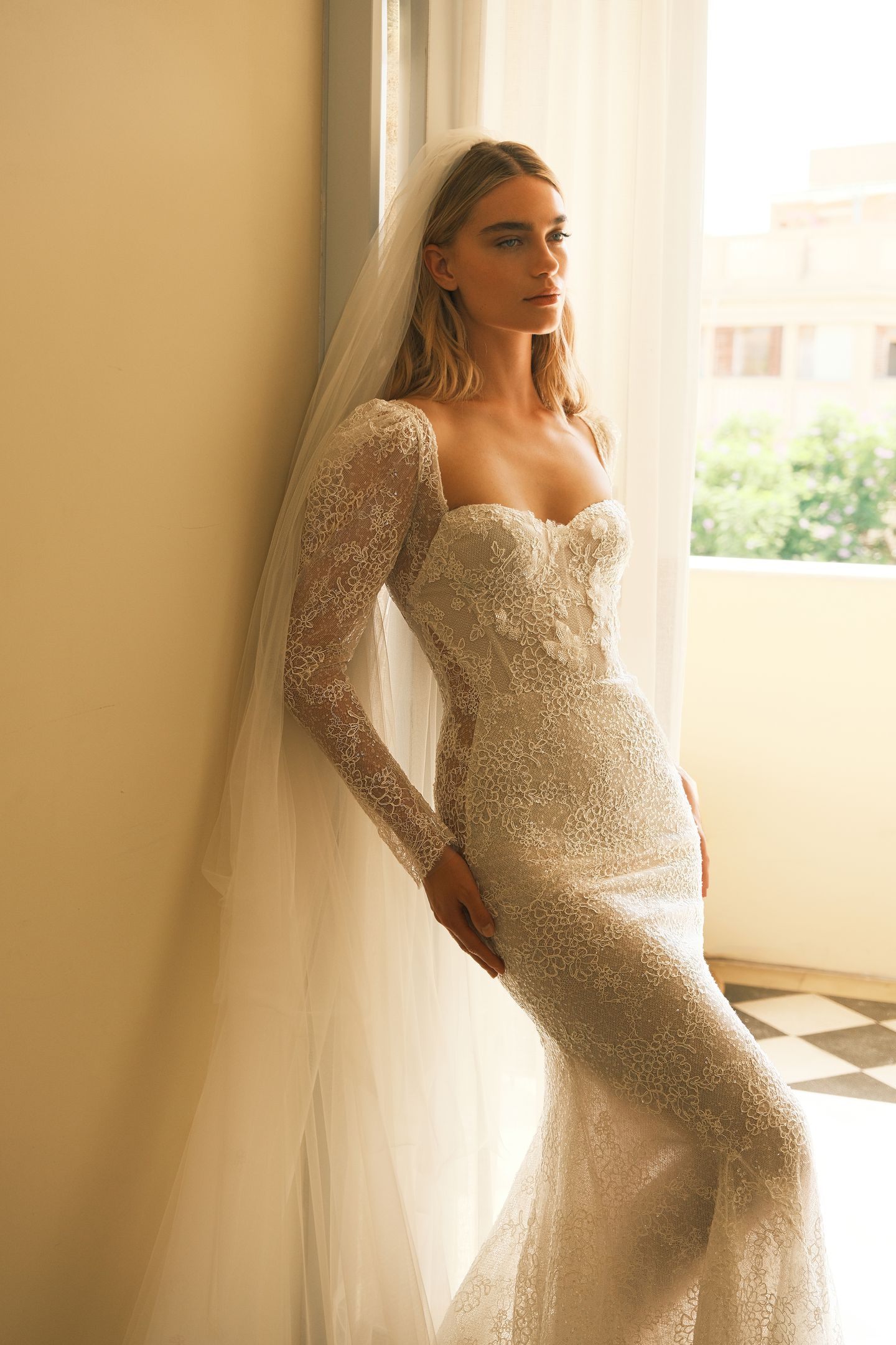 Mermaid dress featuring a sweetheart neckline and sheer side panels. Crafted from luxurious lace. Accompanied with a detachable long sleeved topper and a matching veil with Nadia.