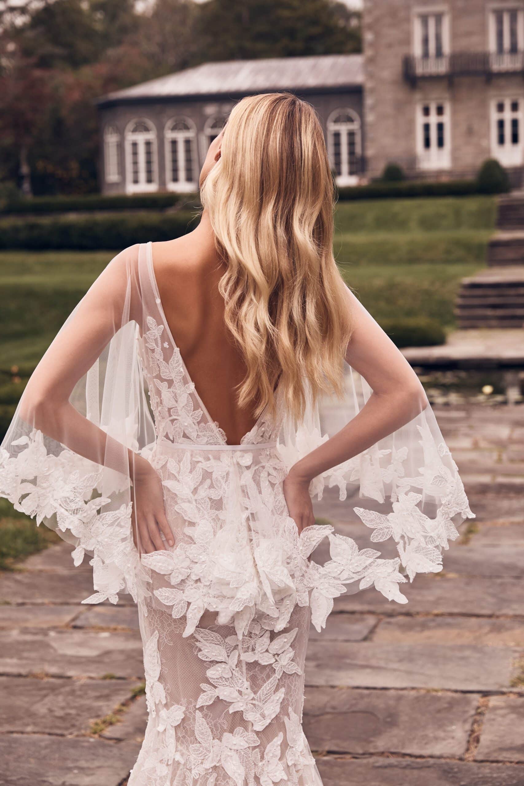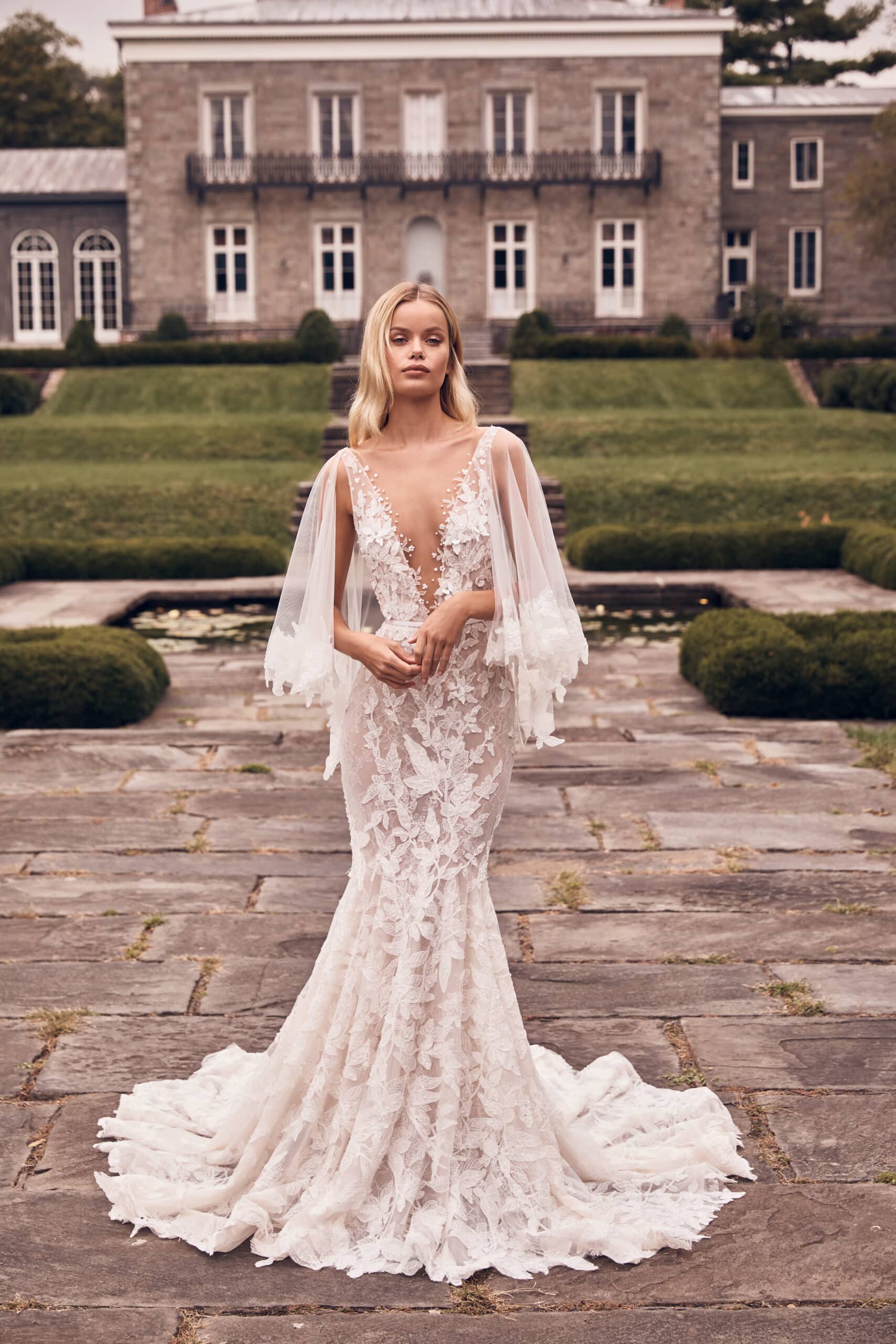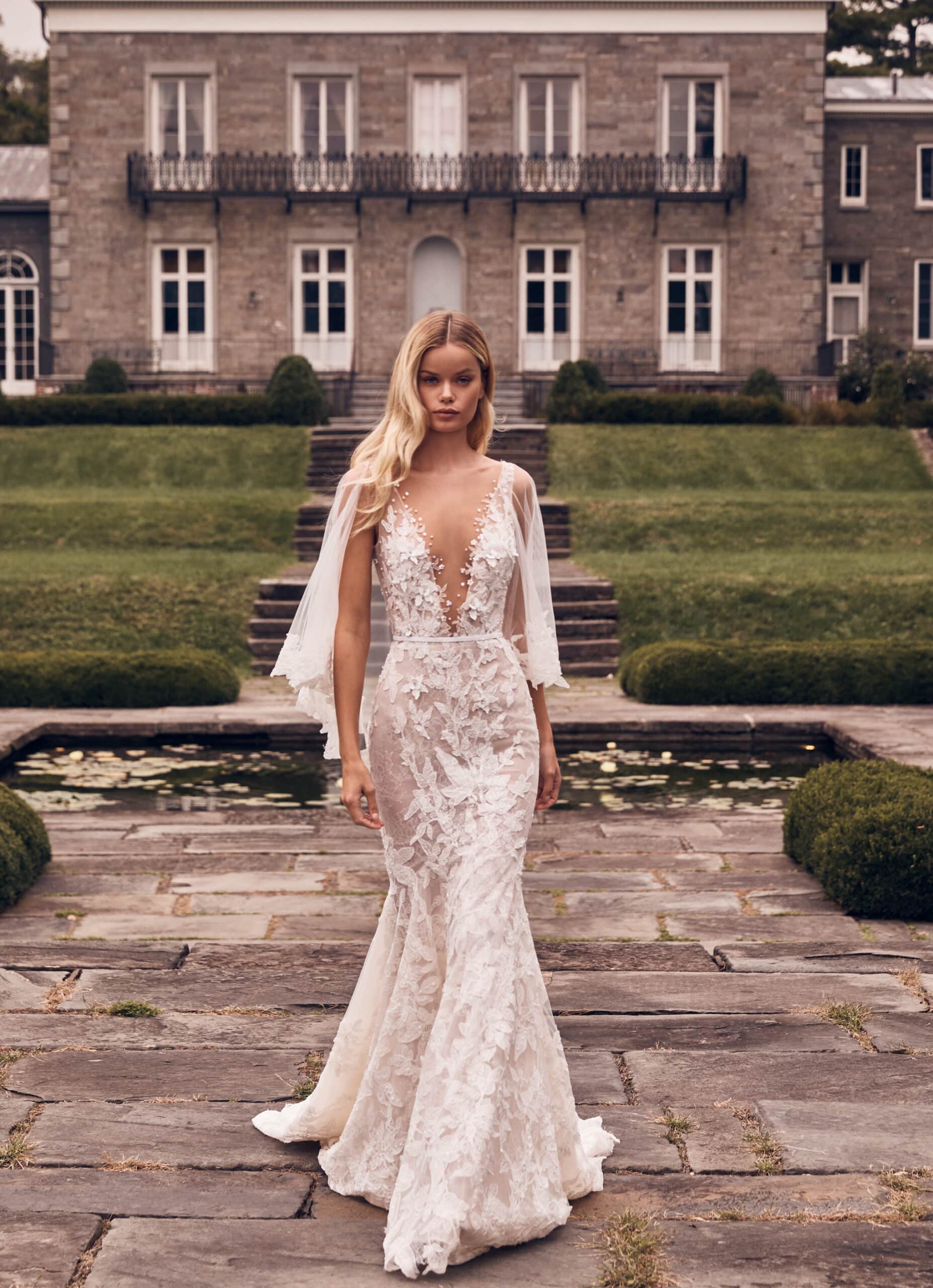 Fitted V- neck gown with luxurious lace appliqué, adorned with a matching cape.