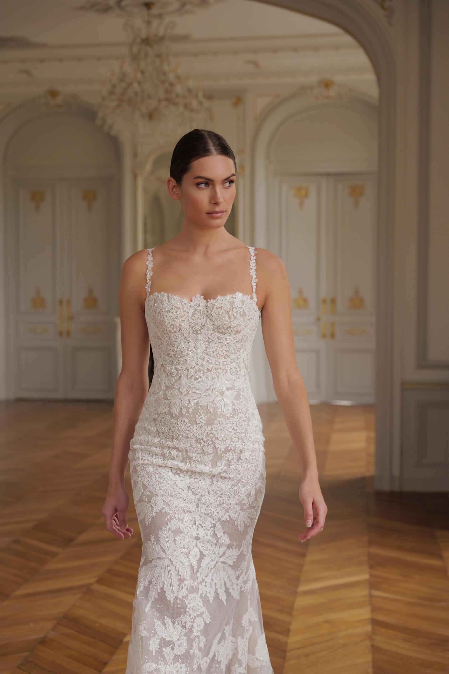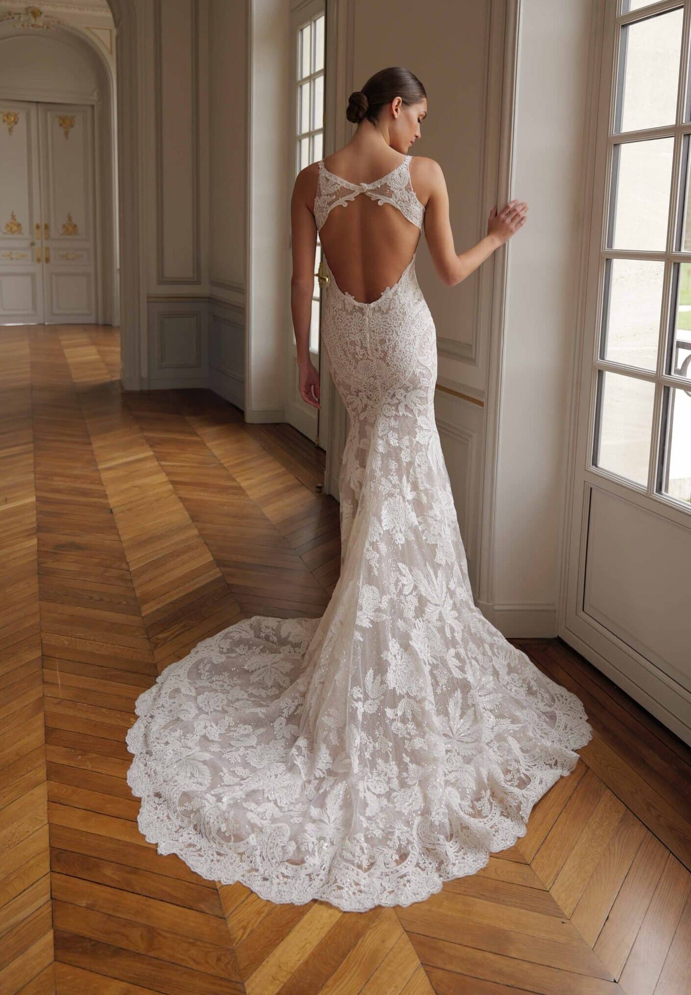 A romantic trumpet gown crafted from corded French lace. Featuring luxurious lace appliqués inspired by nature motifs. It showcases an open bold back and a long train.