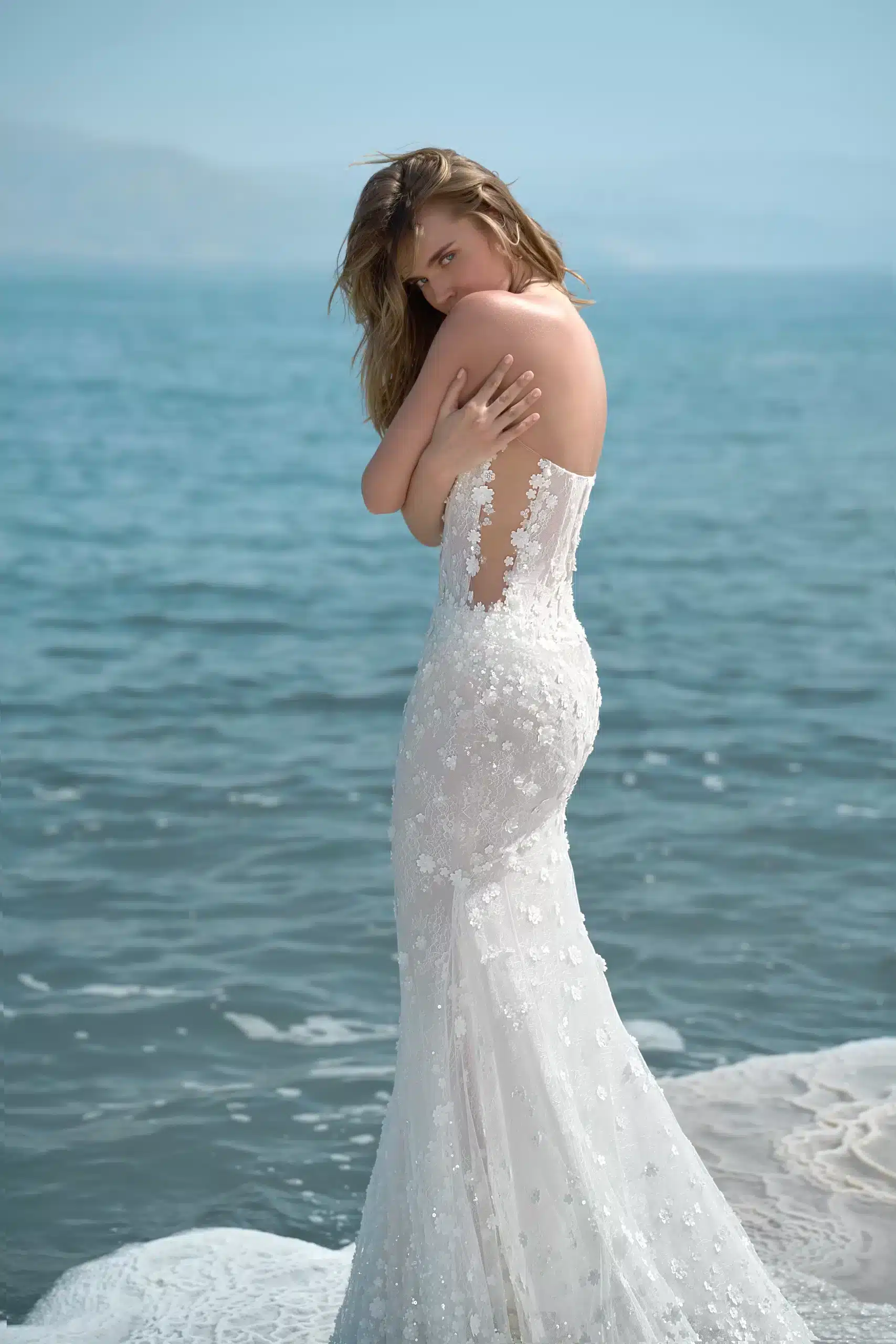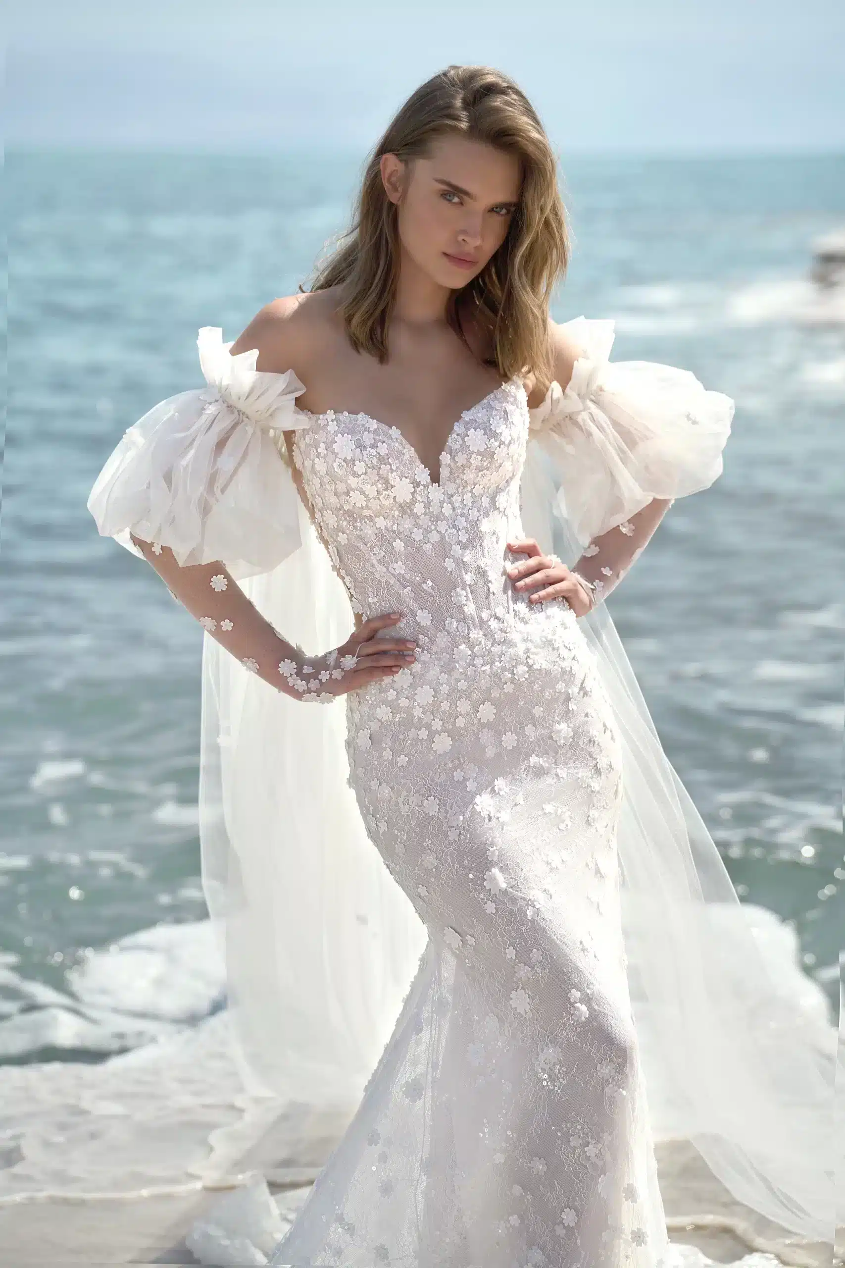 Mermaid gown featuring a semi dropped waist corset and embellished with luxurious hand-made 3D flowers. Adorned with detachable off-the-shoulder cape sleeves.