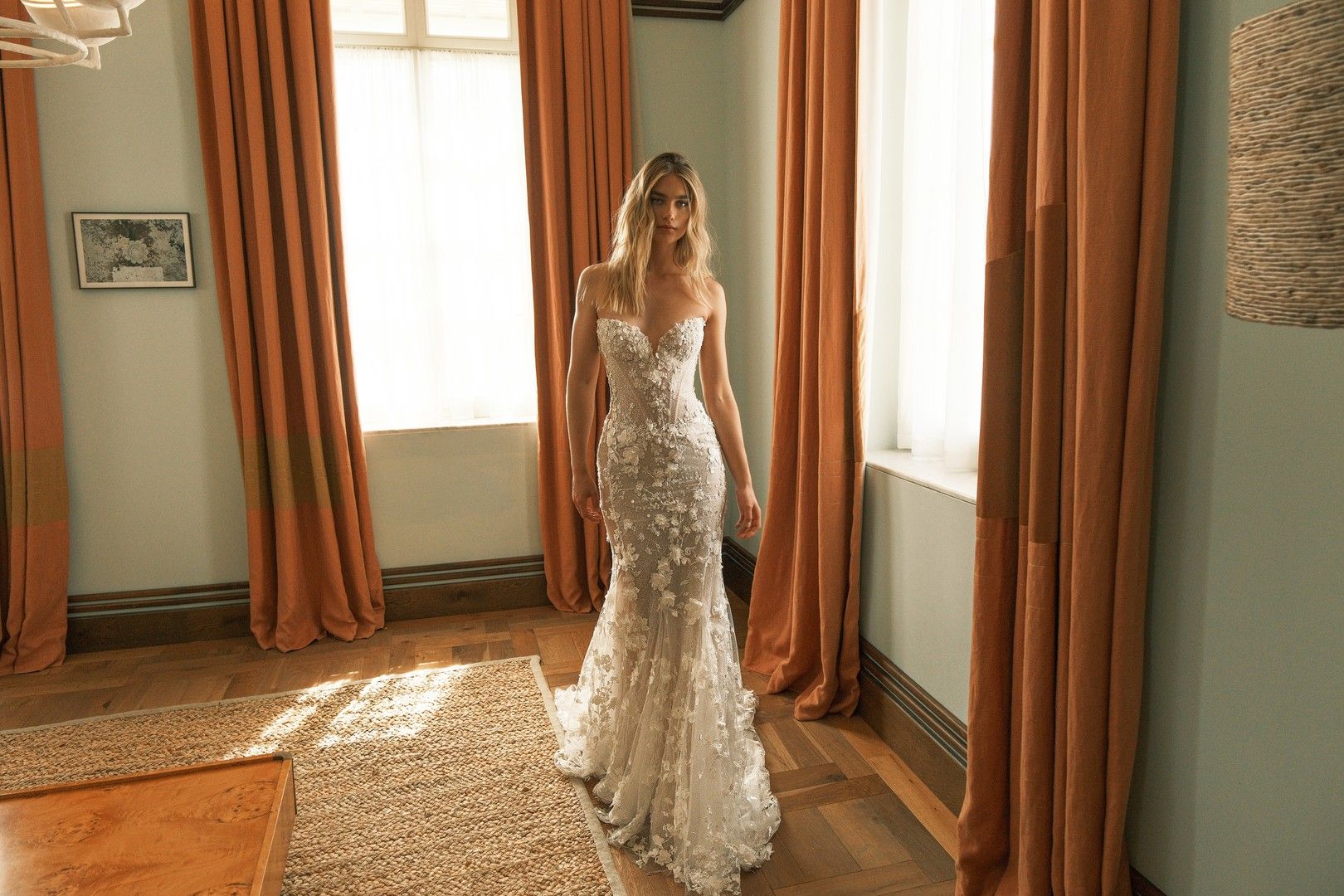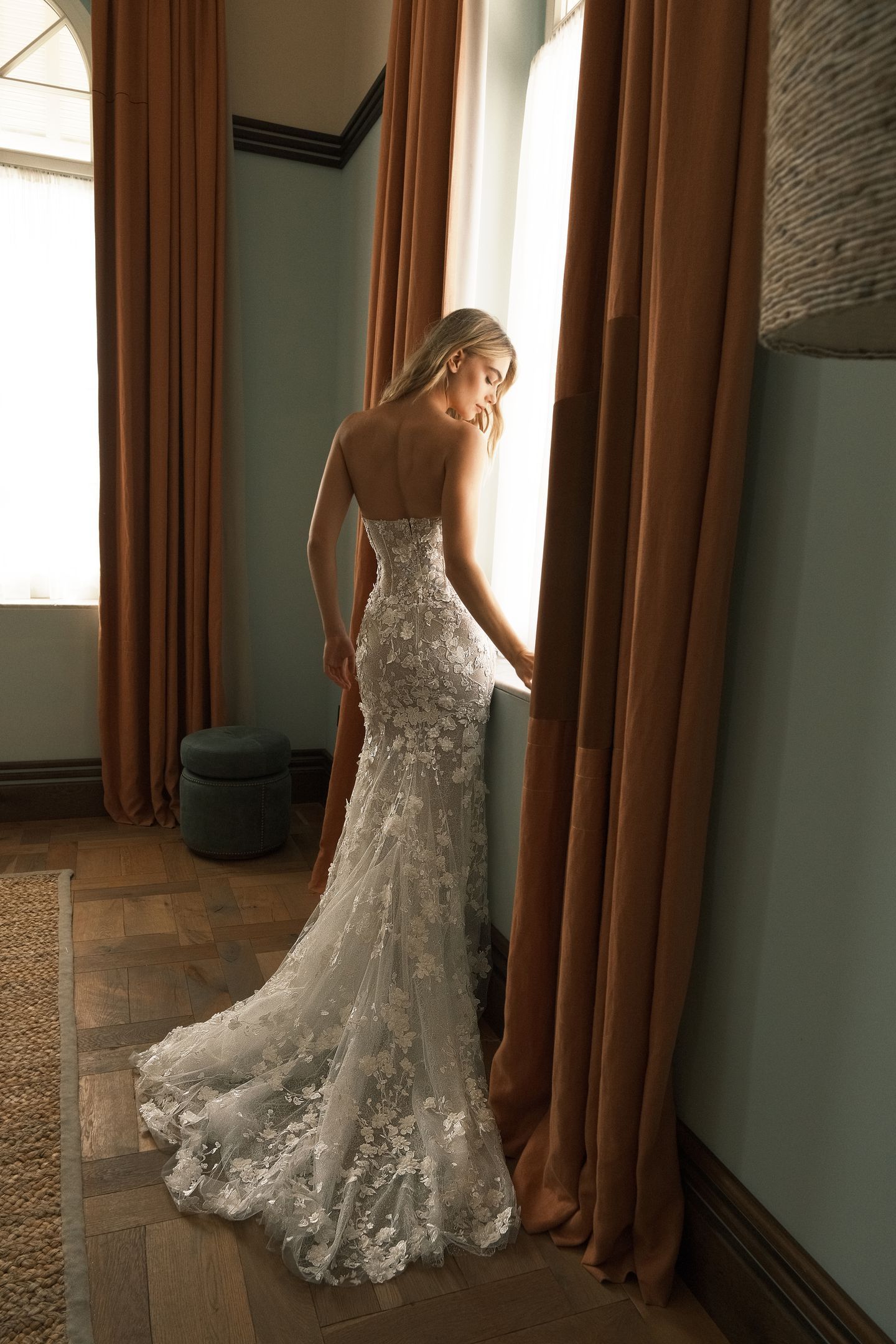 Dropped waist fitted gown. Has a delicate lace base and gradually scattered florals. Features alluring sheer side panels. Accompanied with flowy detachable cape sleeves and a coordinating veil.