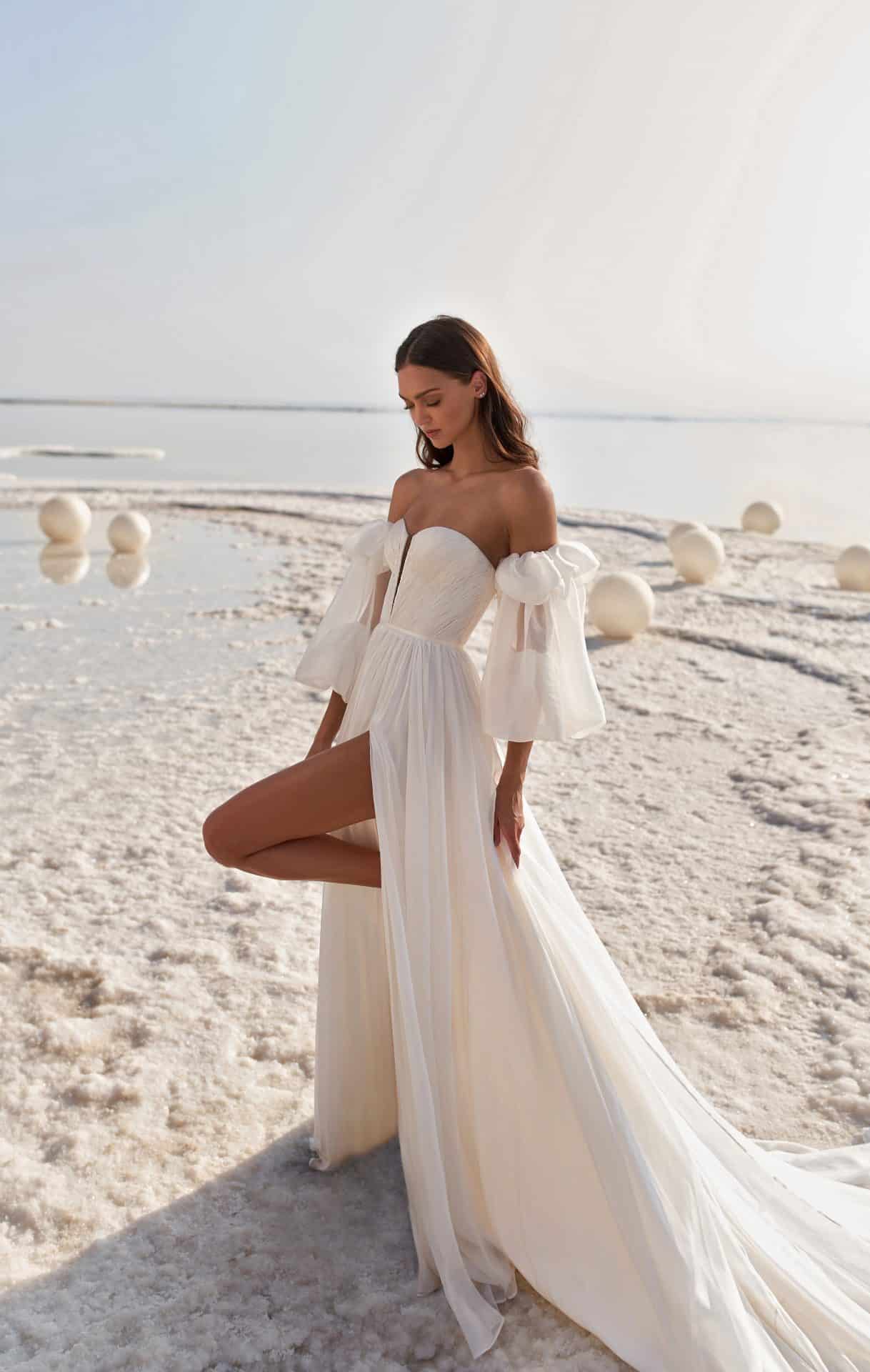 A-line silk chiffon gown with pleated bodice and blouson sleeves