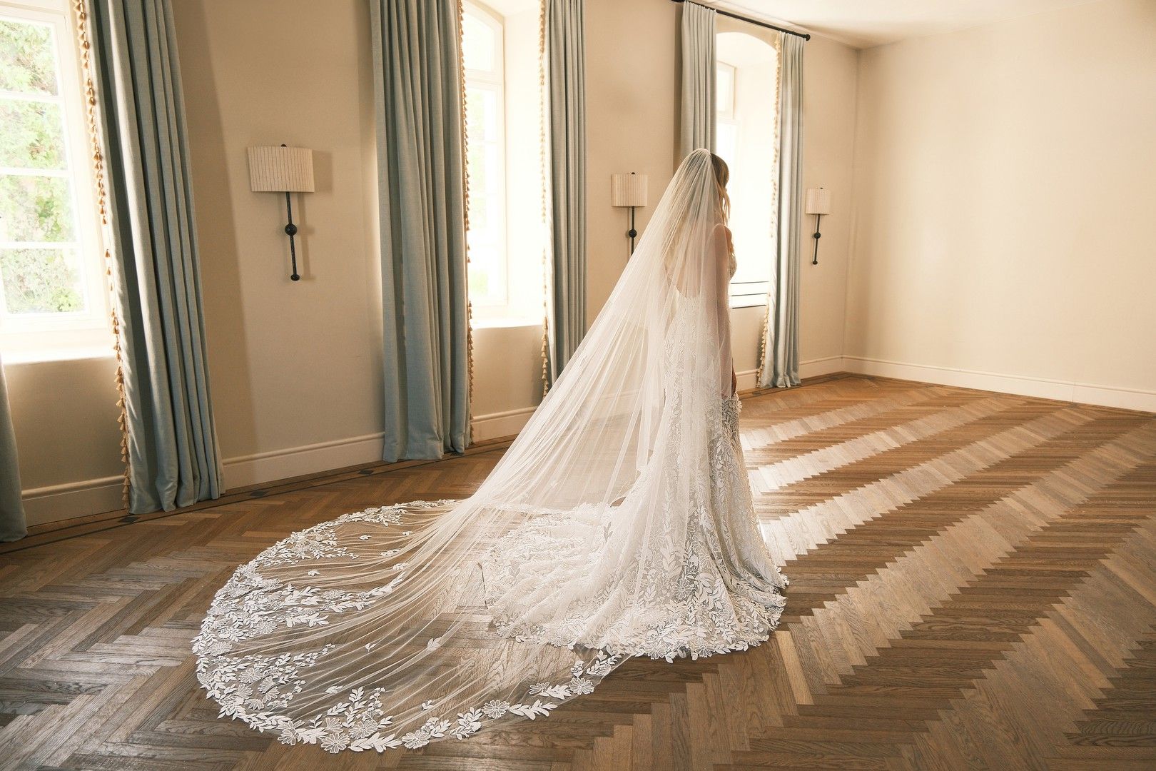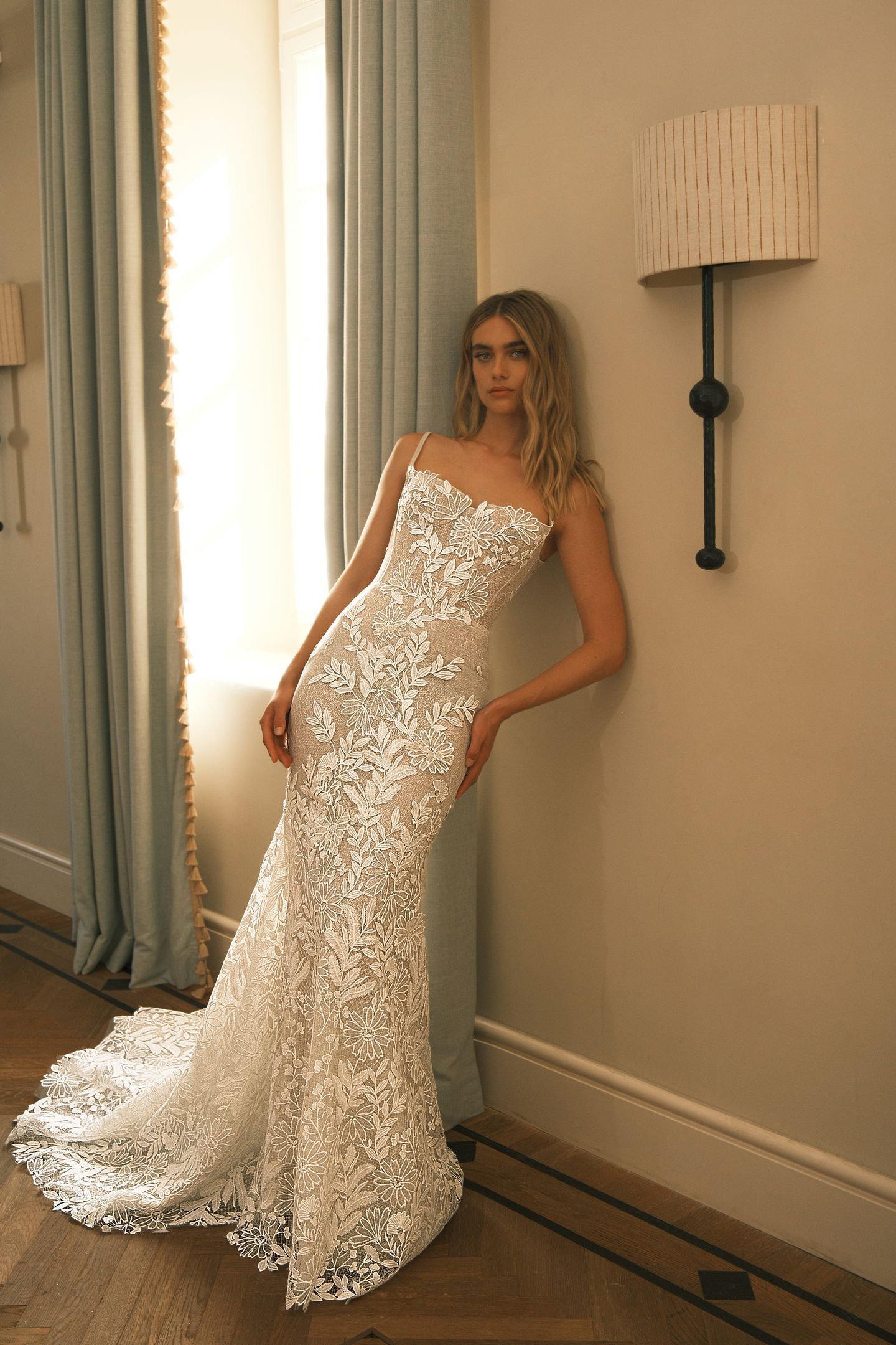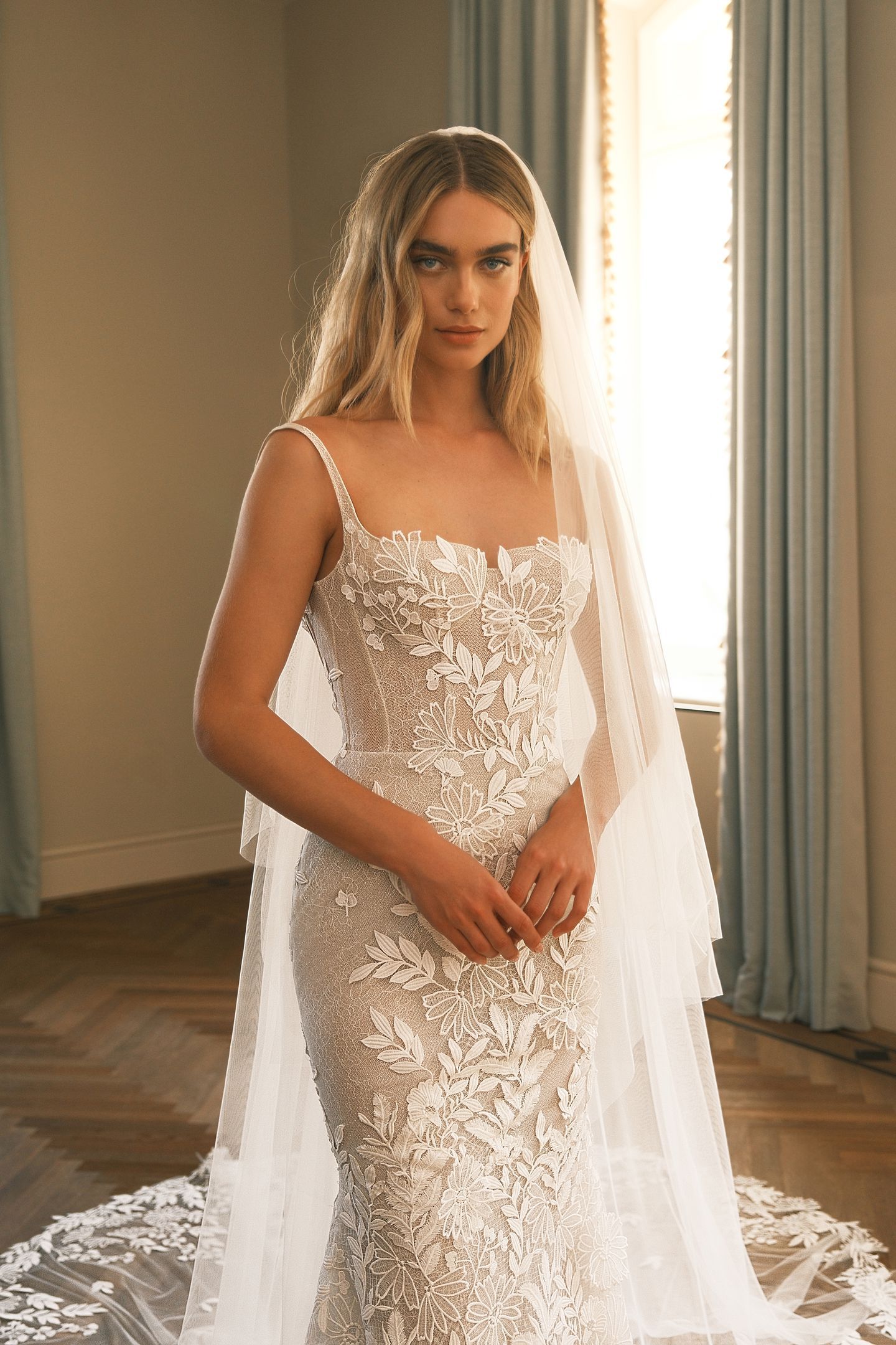 Fitted gown featuring a square neckline with delicate thin straps and a low back. Crafted from luxurious floral and leaves applique. Accompanied with a matching detailed cathedral veil.