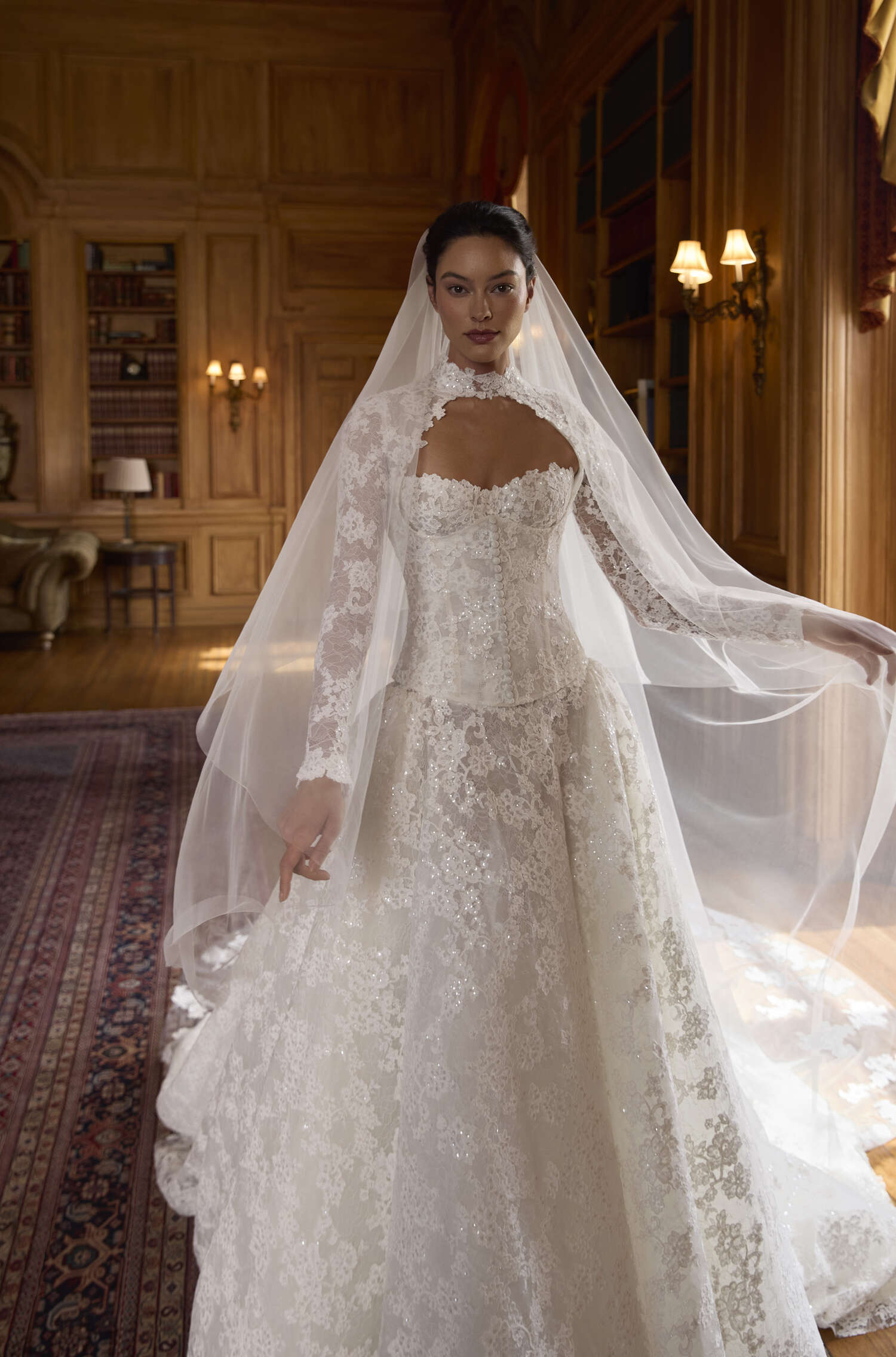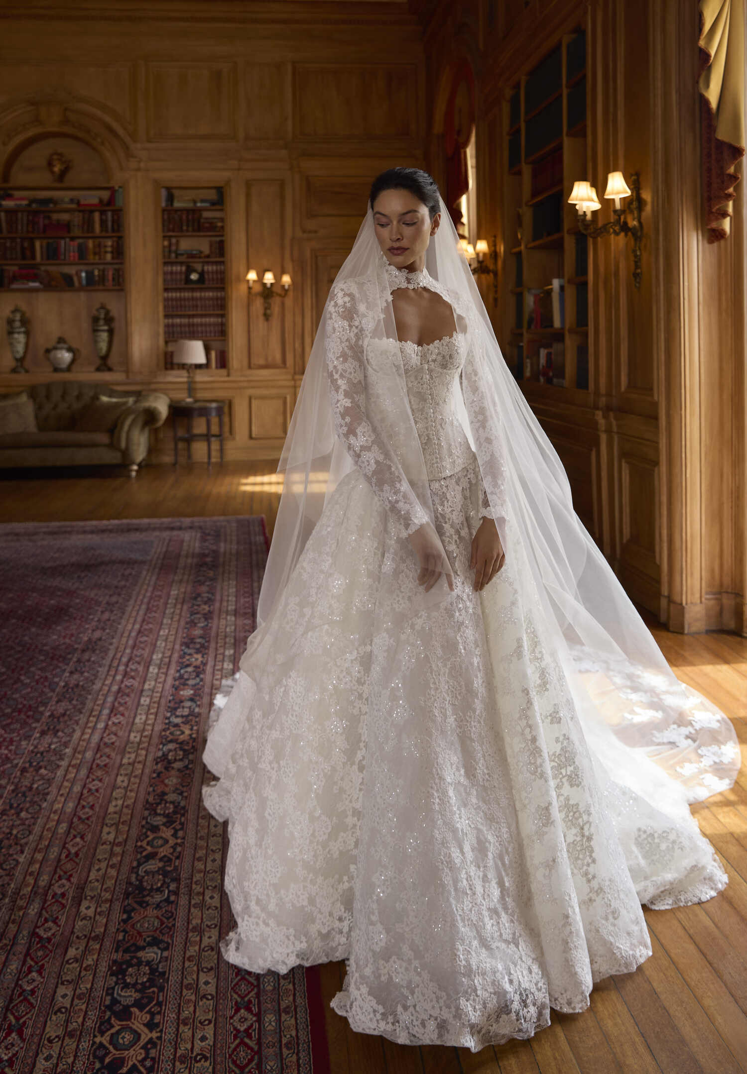 A princess ball gown crafted from embroidered, shimmery lace with a detachable long-sleeve jacket. The modern strapless silhouette sculpts the body with grace. Paired with a cathedral-length lace veil.