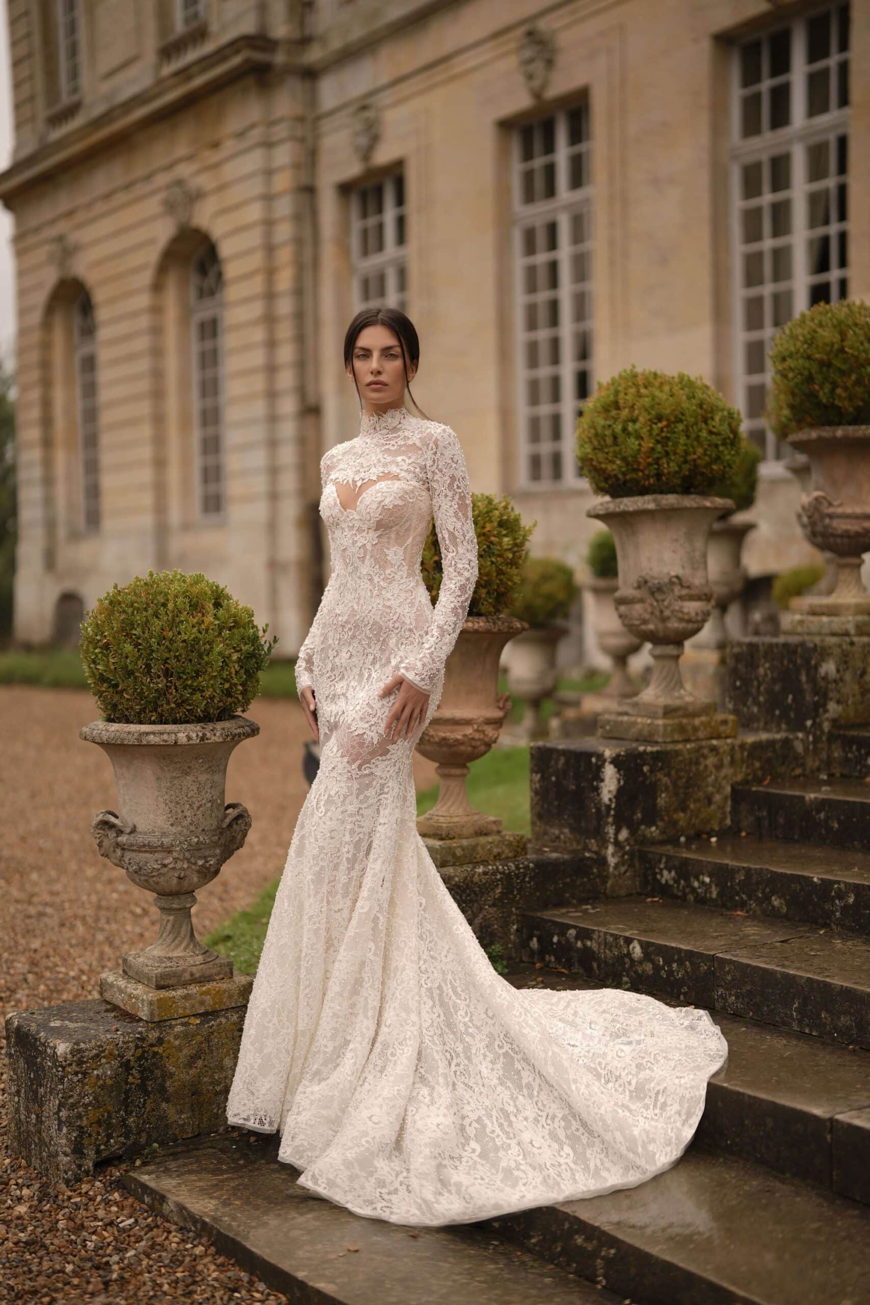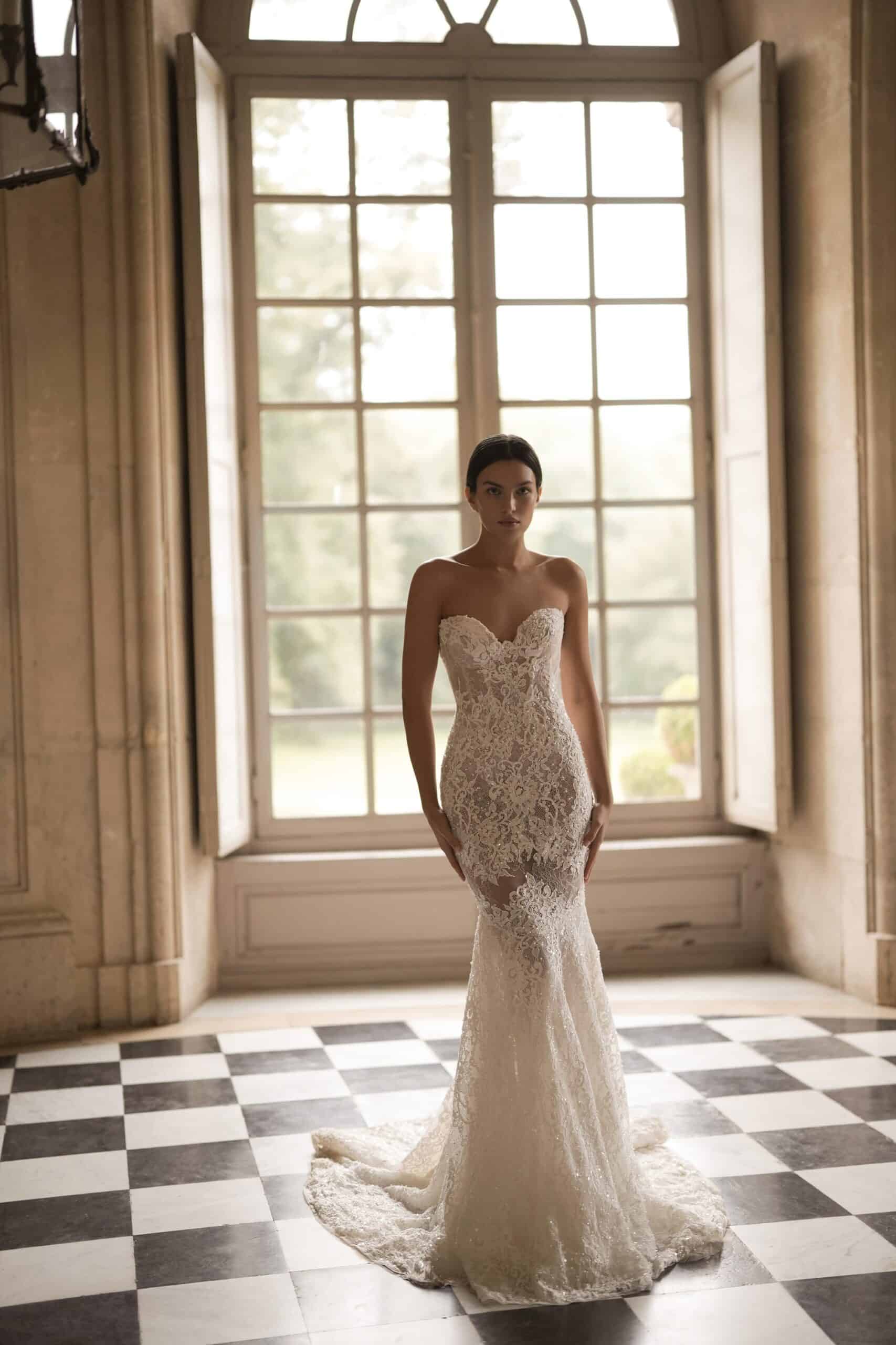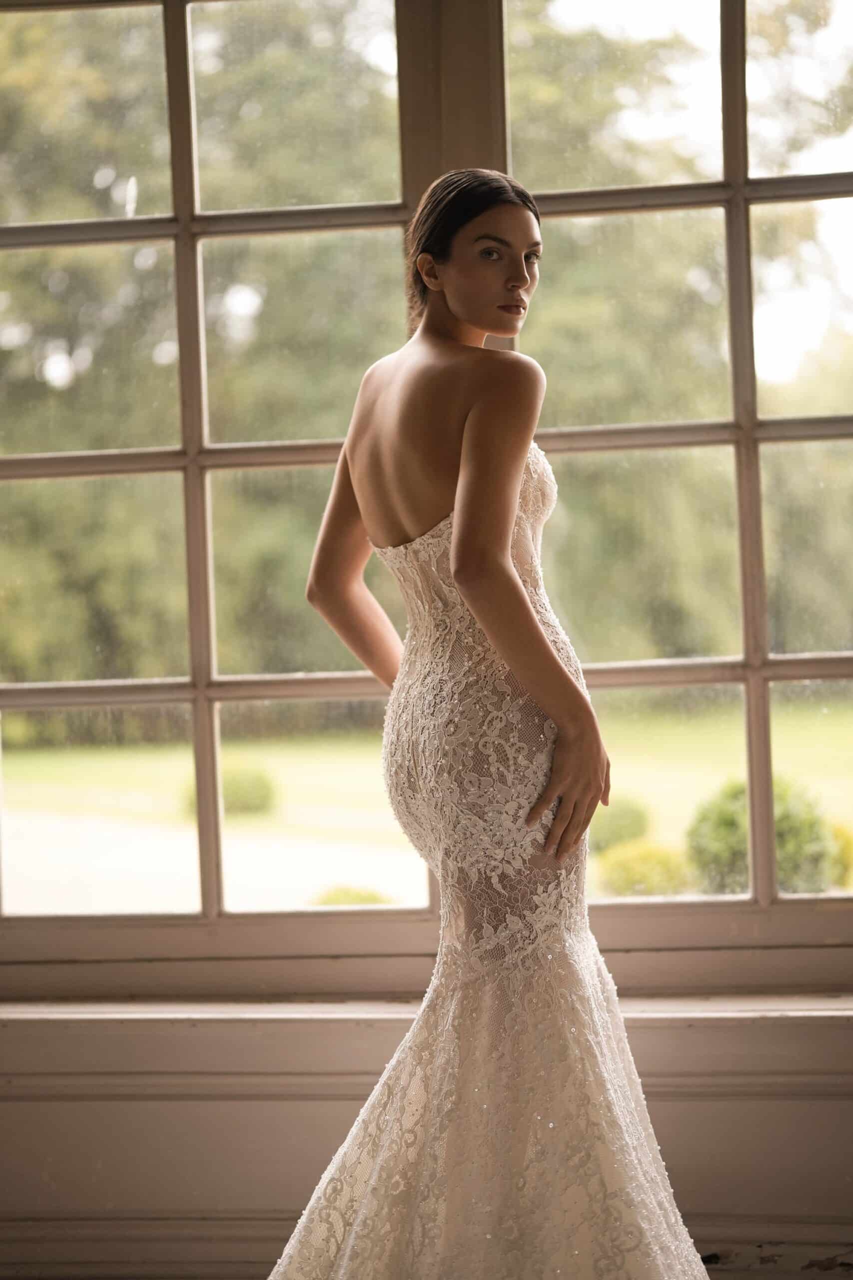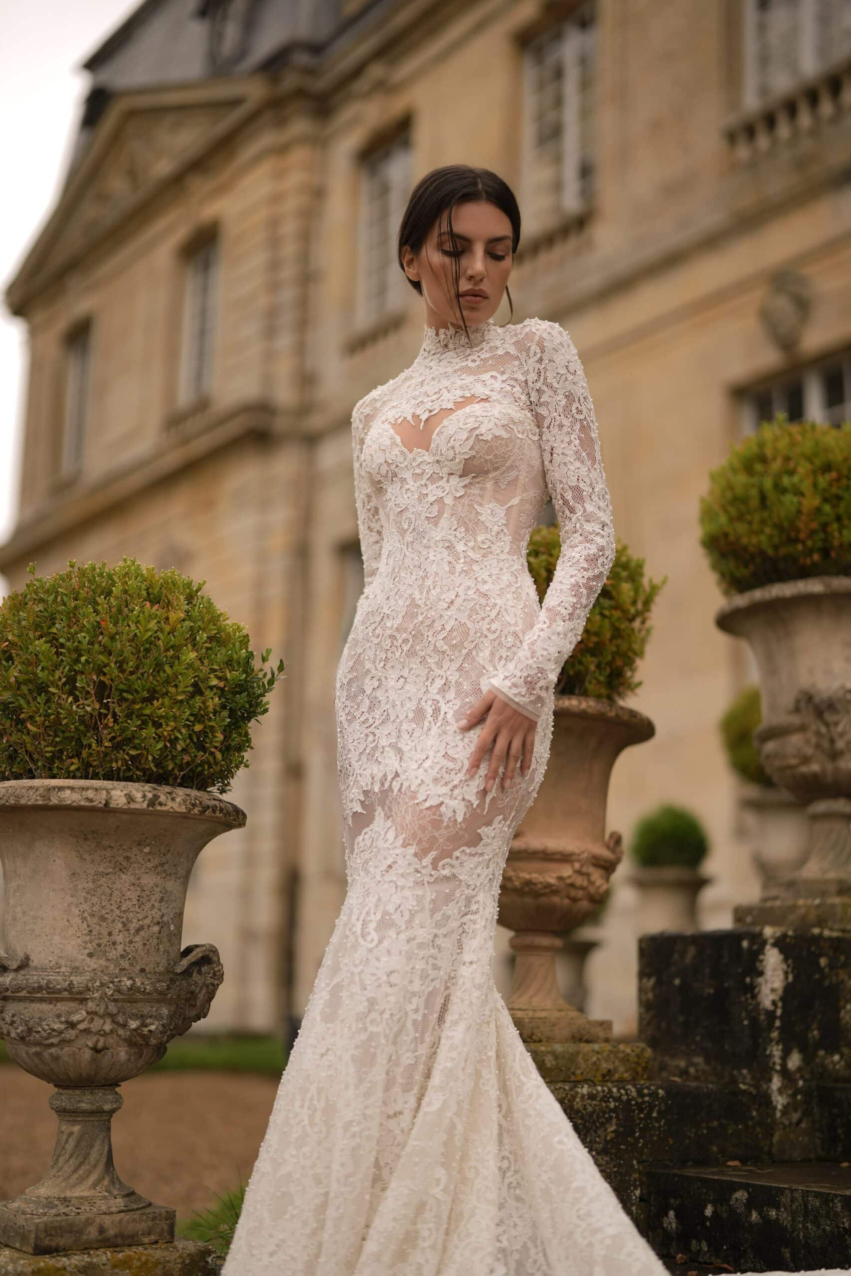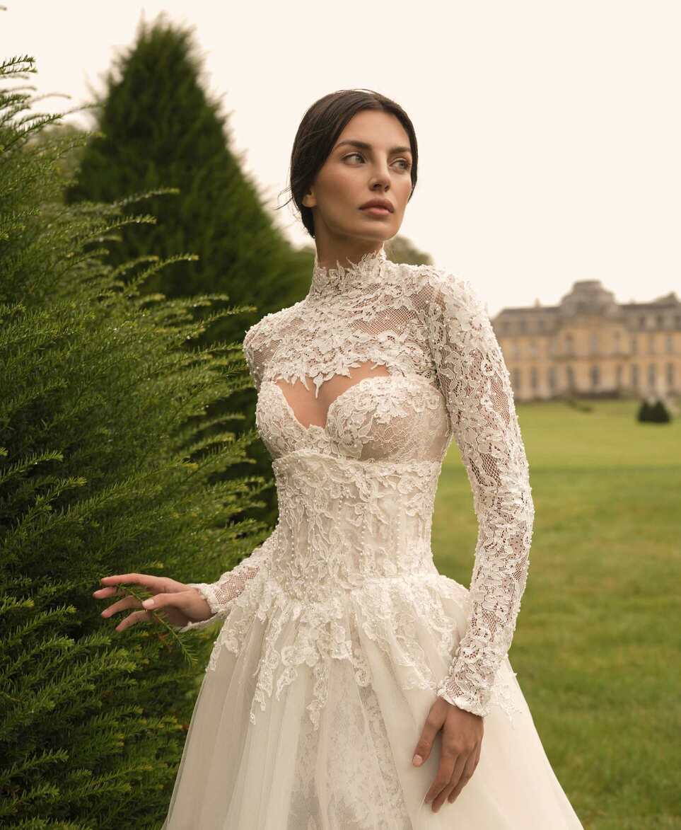 A sweetheart corset mermaid gown made from luxurious lace and decorated with pearls, featuring semi-sheer cutouts. It is accompanied by a dramatic detachable corset overskirt and a lace topper for a complete ensemble.