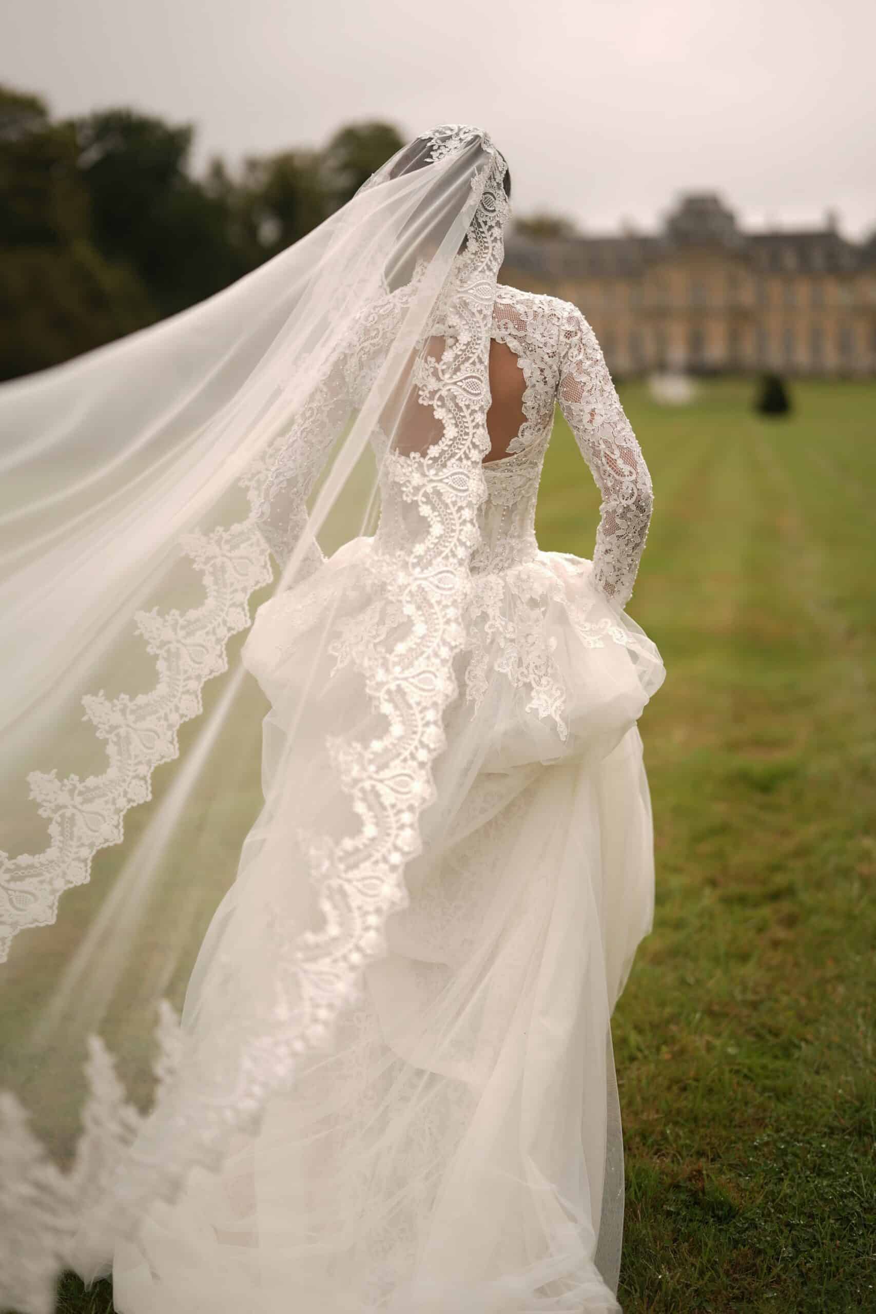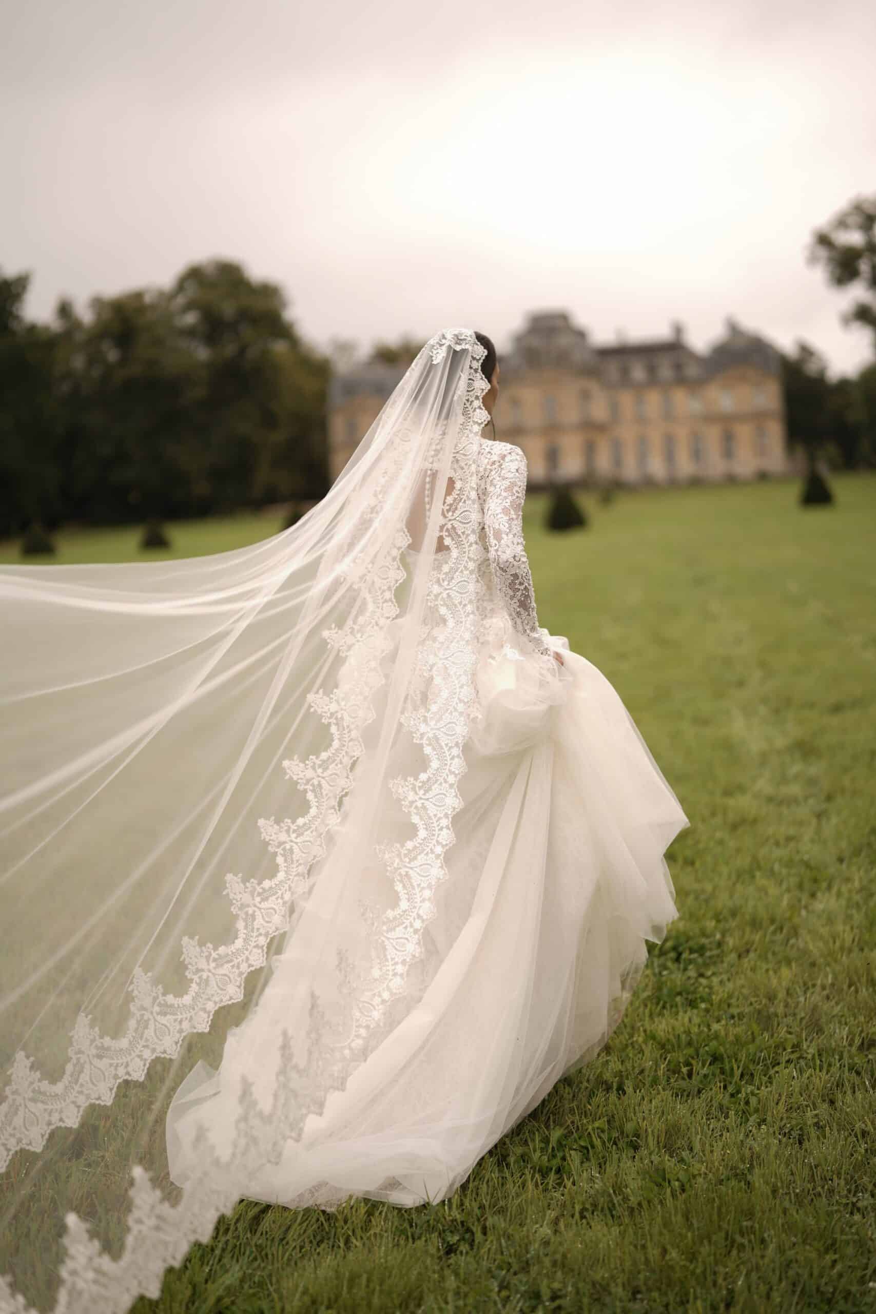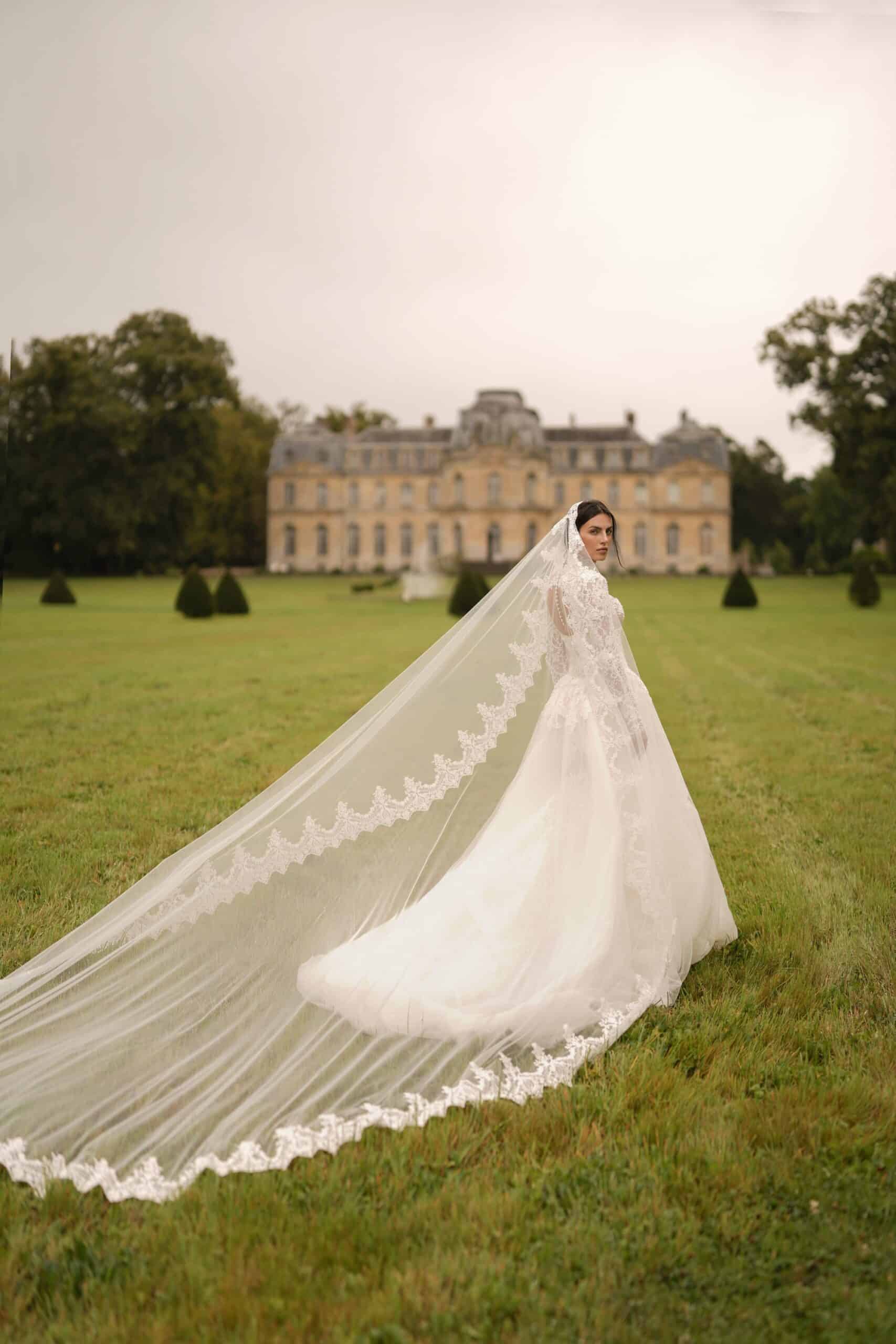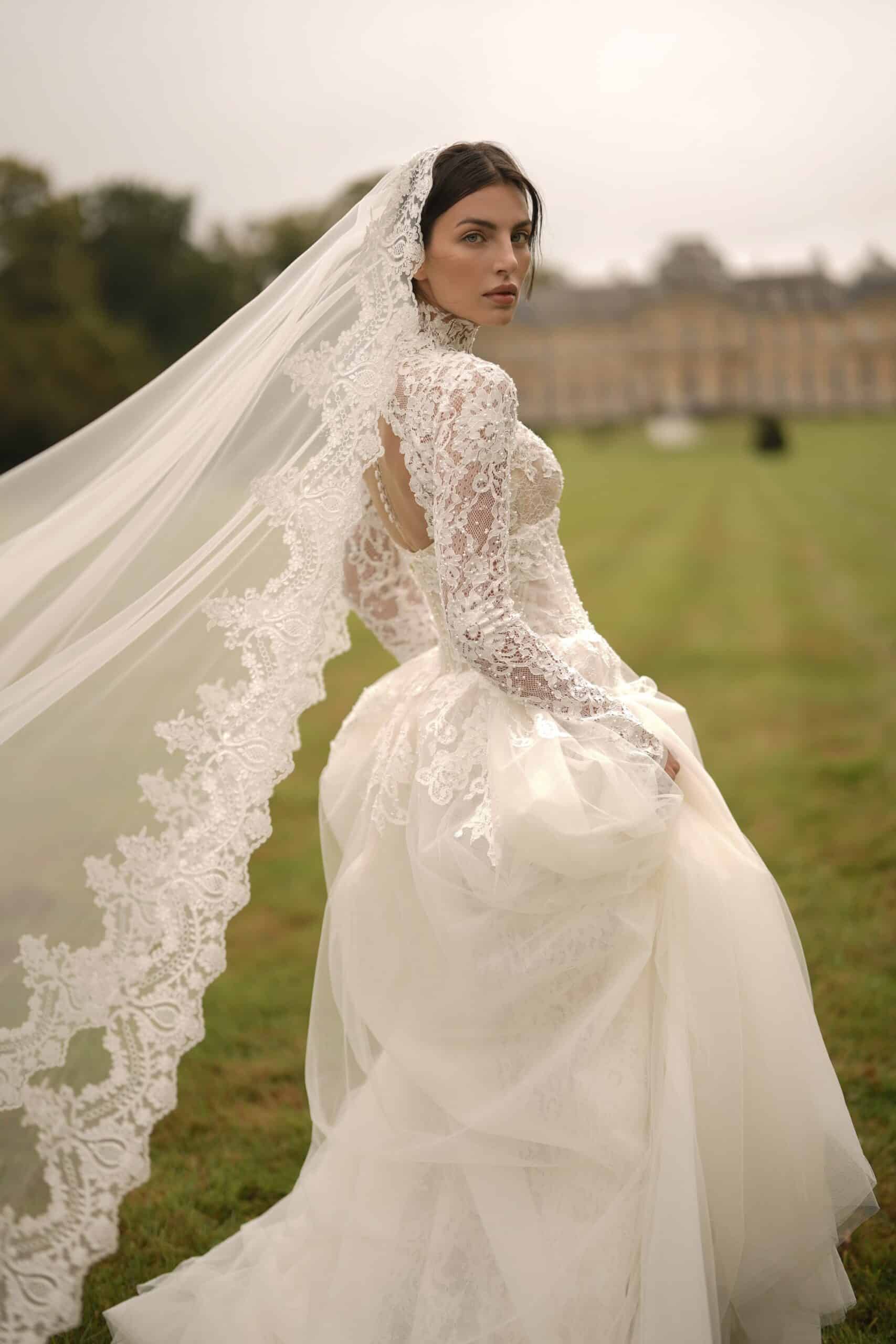 A sweetheart corset mermaid gown made from luxurious lace and decorated with pearls, featuring semi-sheer cutouts. It is accompanied by a dramatic detachable corset overskirt and a lace topper for a complete ensemble.