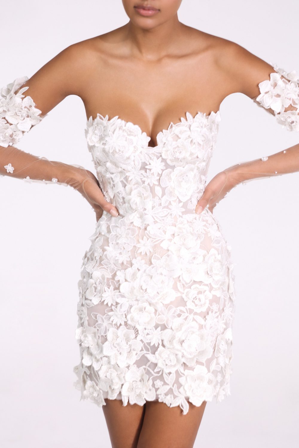 With a sweetheart built-in corset. Features detachable sleeves.