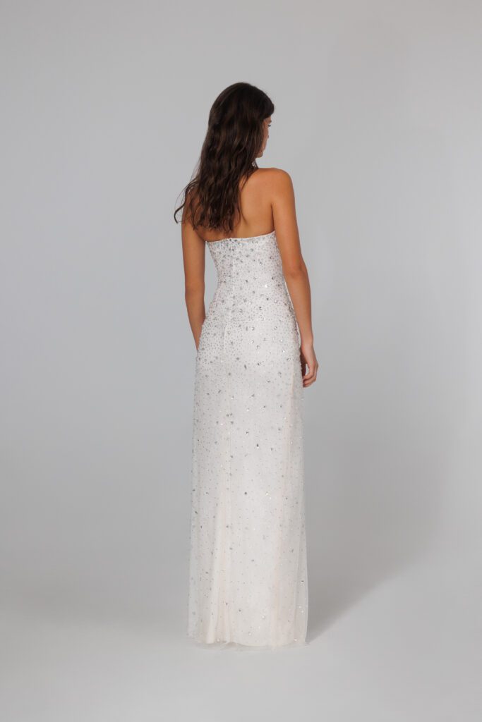 A strapless fitted Crystal Dress with with a high slit, built around a cat eye corset with a front opening. Decorated with luxurious crystal embellishments.