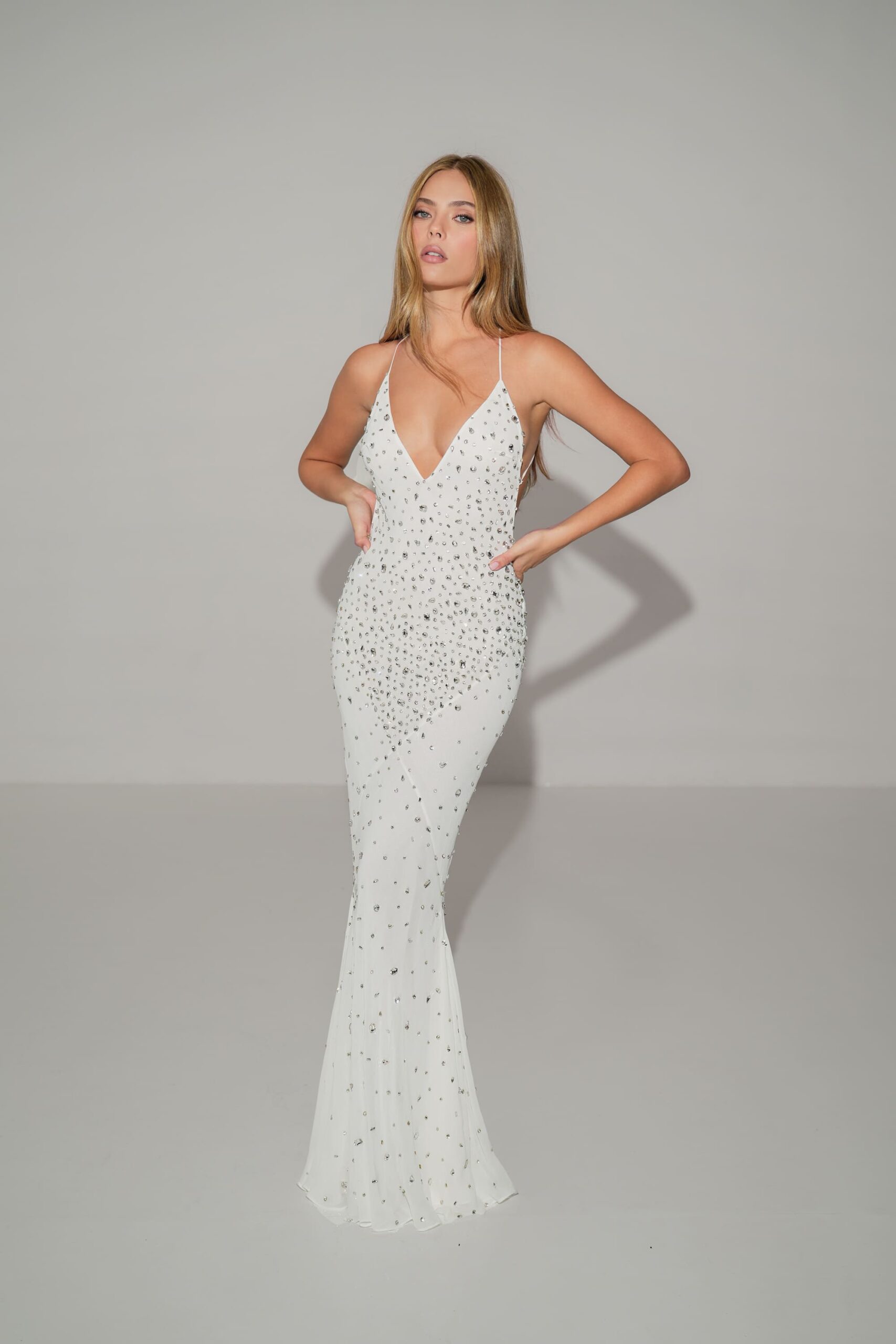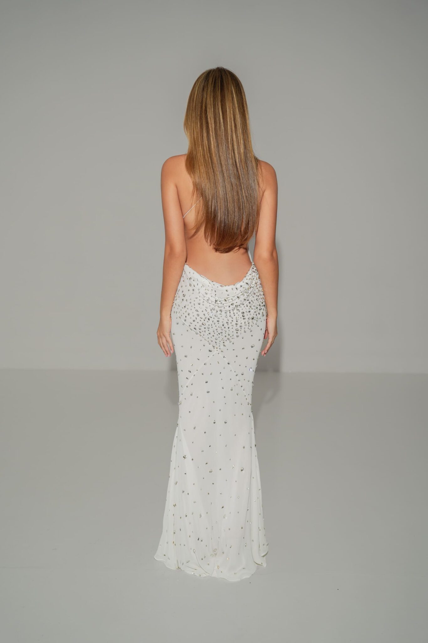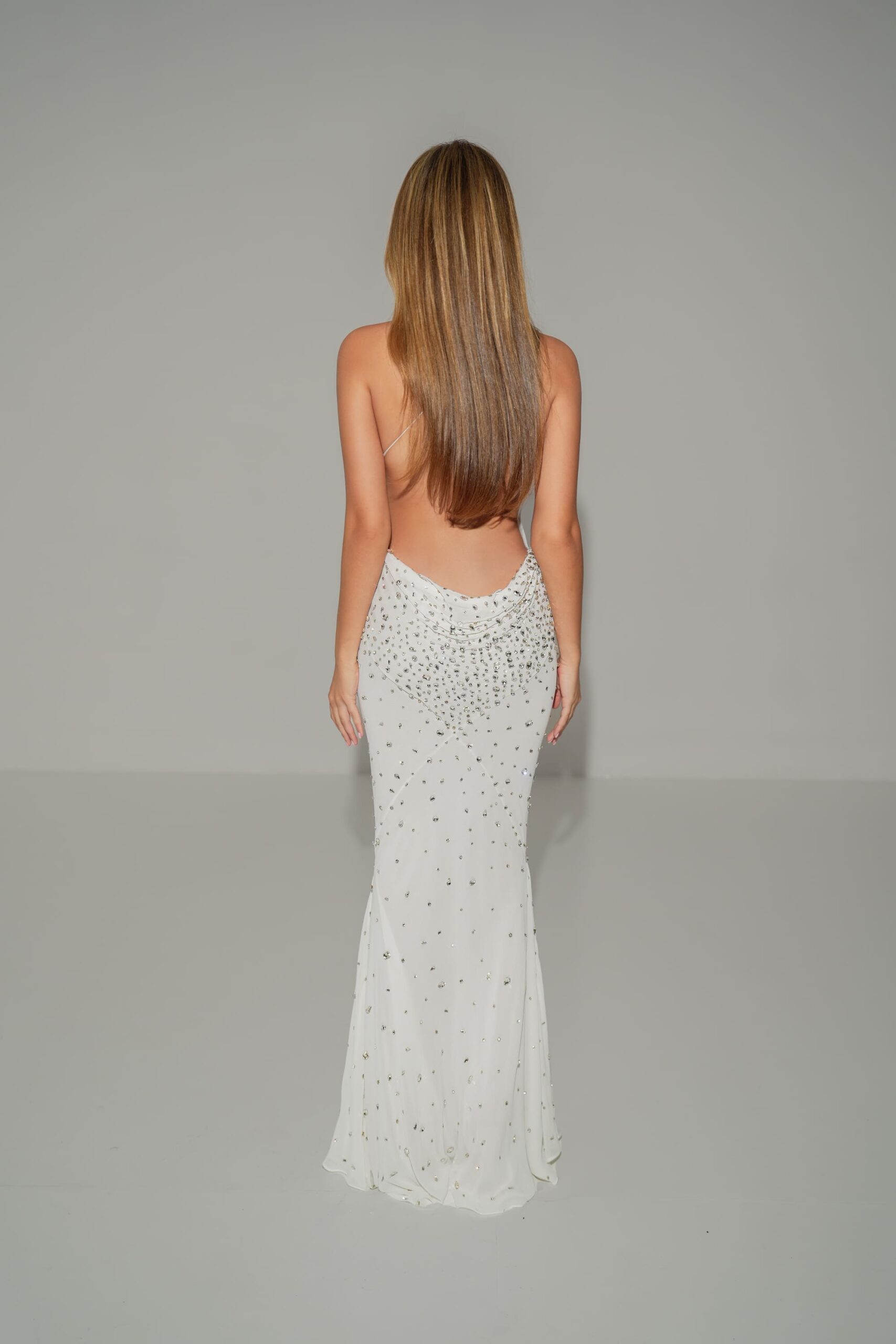 Elegant halter-neck gown made of silk and embellished with hand-made luxurious crystals. The plunging V-neckline and fitted silhouette highlight the figure, while the draped open back seamlessly flows into a floor-length design, offering a refined and feminine look.