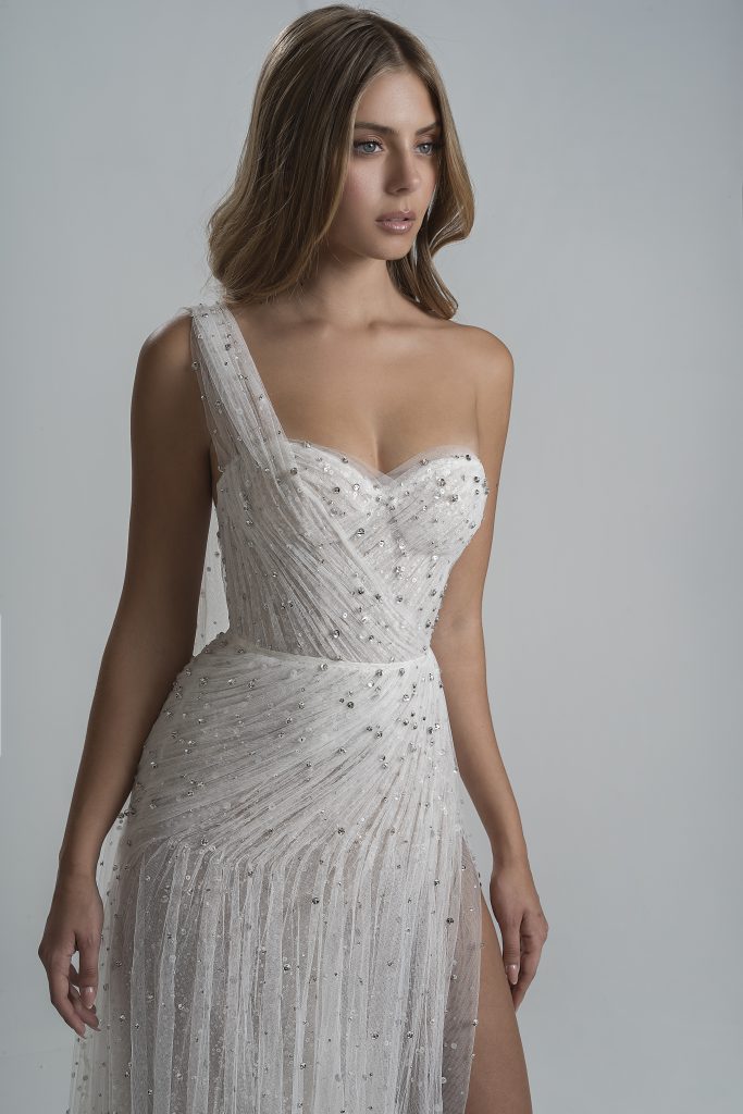Elegant and shiny draped dress. Made from layers of light silver sequins and silk tulle with handmade crystals. Featuring a long Nude inner corset, underpants and shoulder cape train