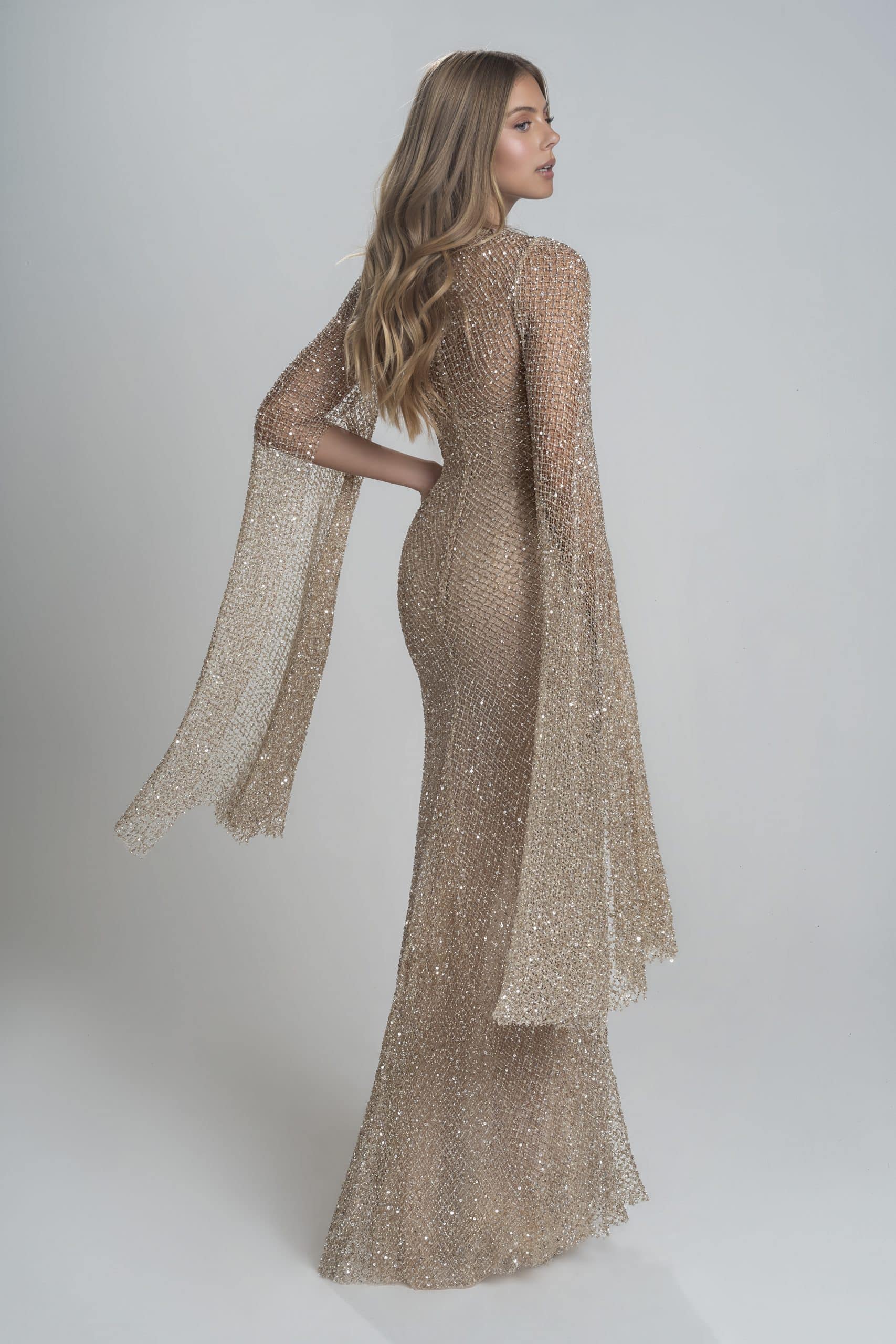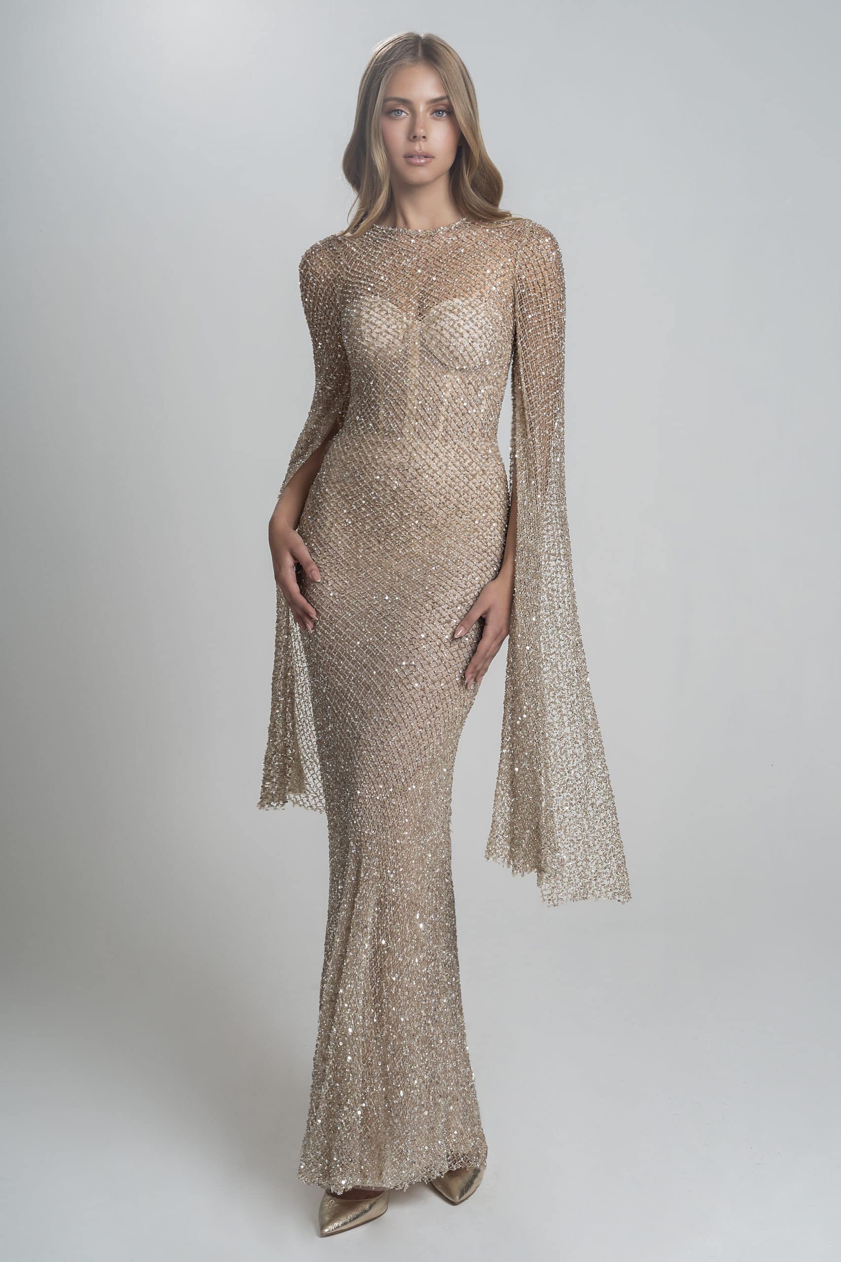 Glowing champagne maxi dress made from beaded net. Accompanied with wide open “drama” sleeves. Includes a nude undergarment dress with a long corset bodysuit.